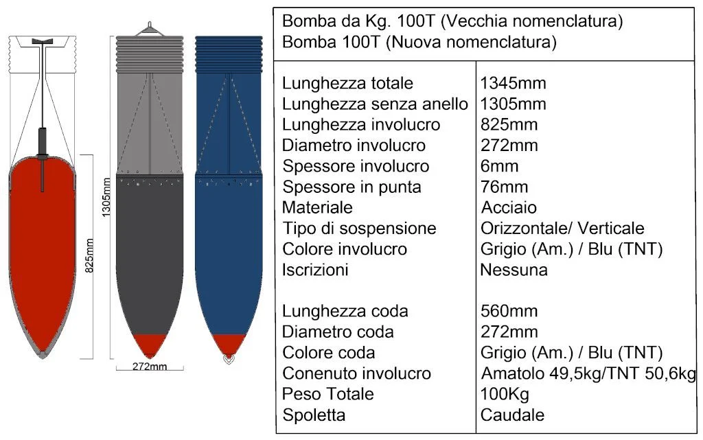 Given the source, the information is suspect, but the War Thunder wiki has a page on the Italian 50kg bomb with an illustration that gives a possible color layout, assuming that the 100kg bombs used a similar pattern, with a red nose for about 4” back and tail cone and fins that were either bare dull metal or black.
