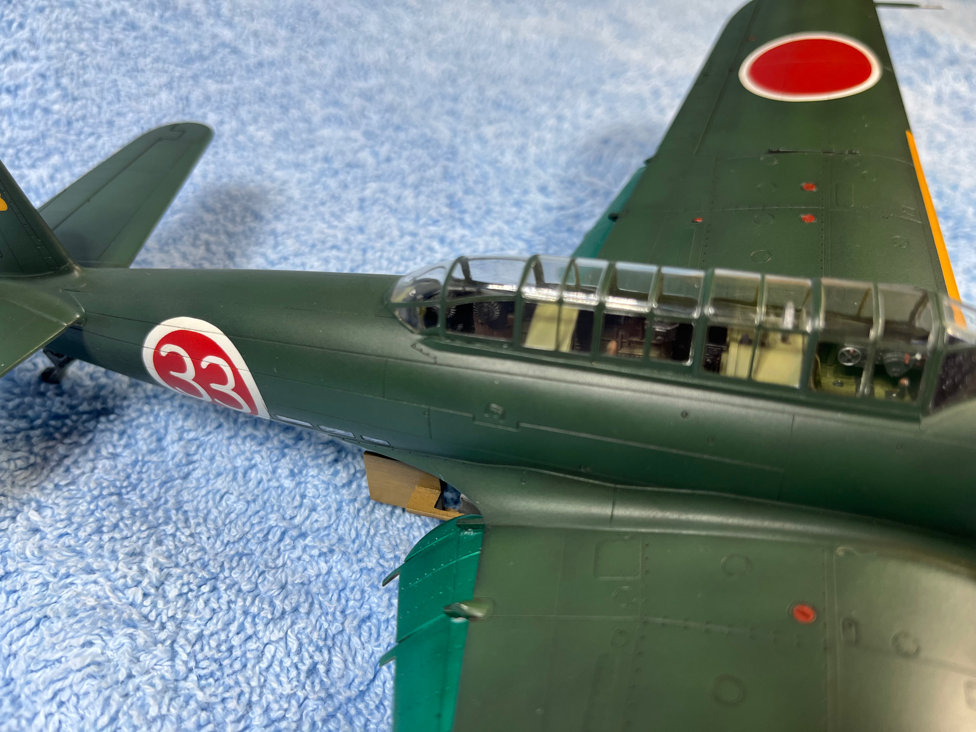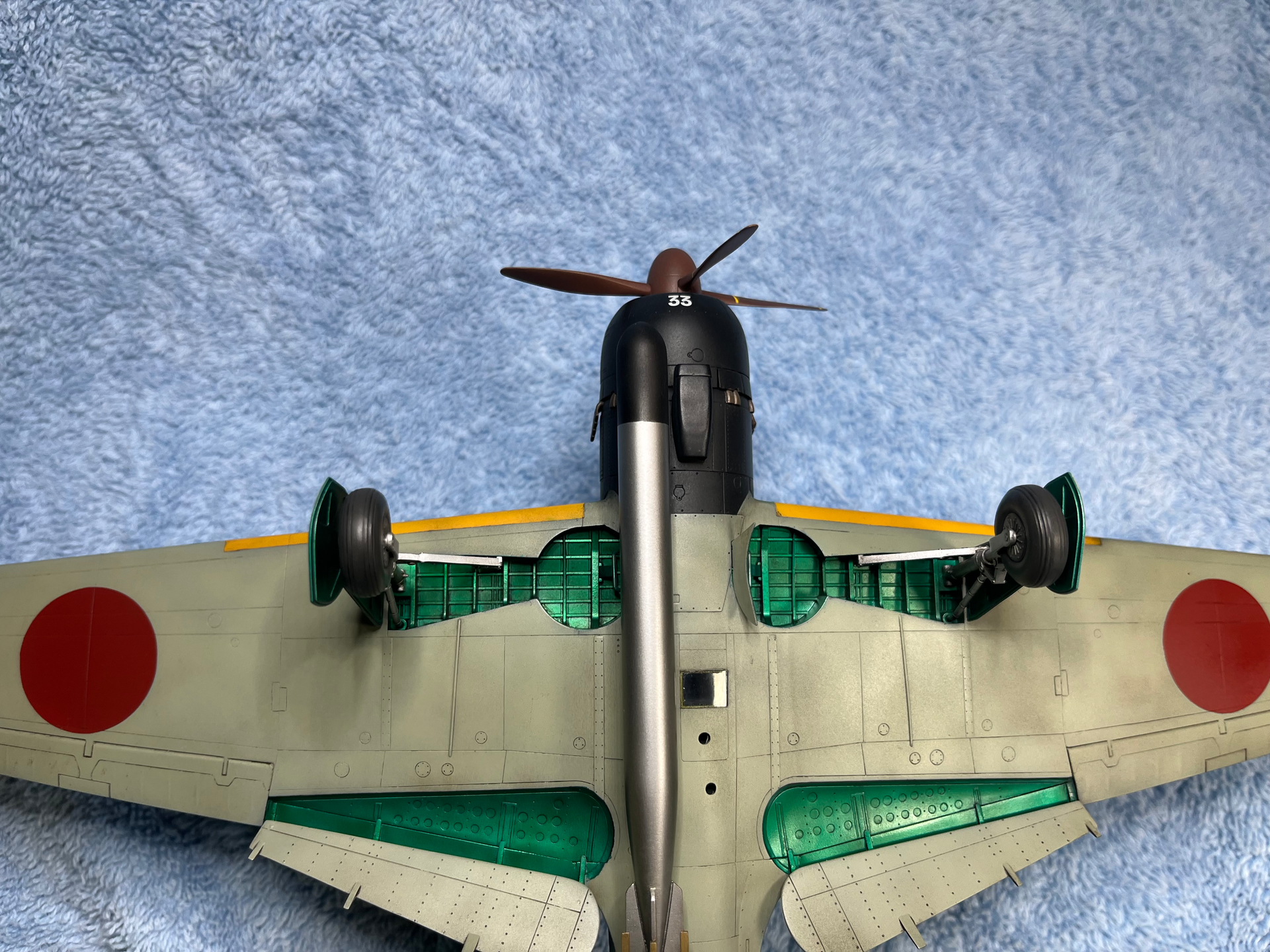 If you can find them, check source photos (historical is probably a lost cause, being almost entirely B&W) and restorations – some manufacturers had a regular paint on the inside surface of landing gear covers, rather than bare aotake. I can’t say you’re mistaken there, because I haven’t looked up the practice for the B6N, but I’ve seen Zeroes with grey-green interiors of the gear doors.