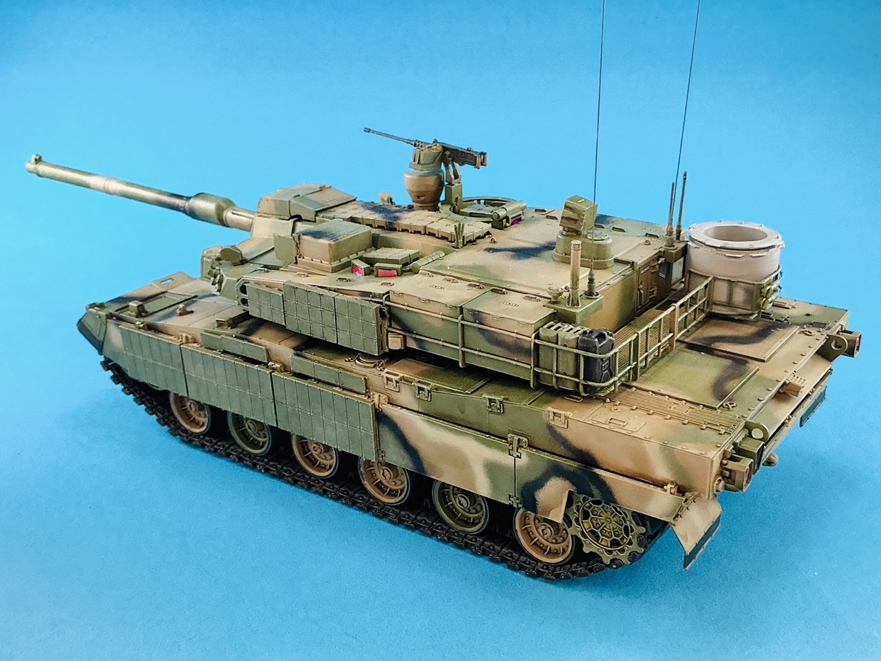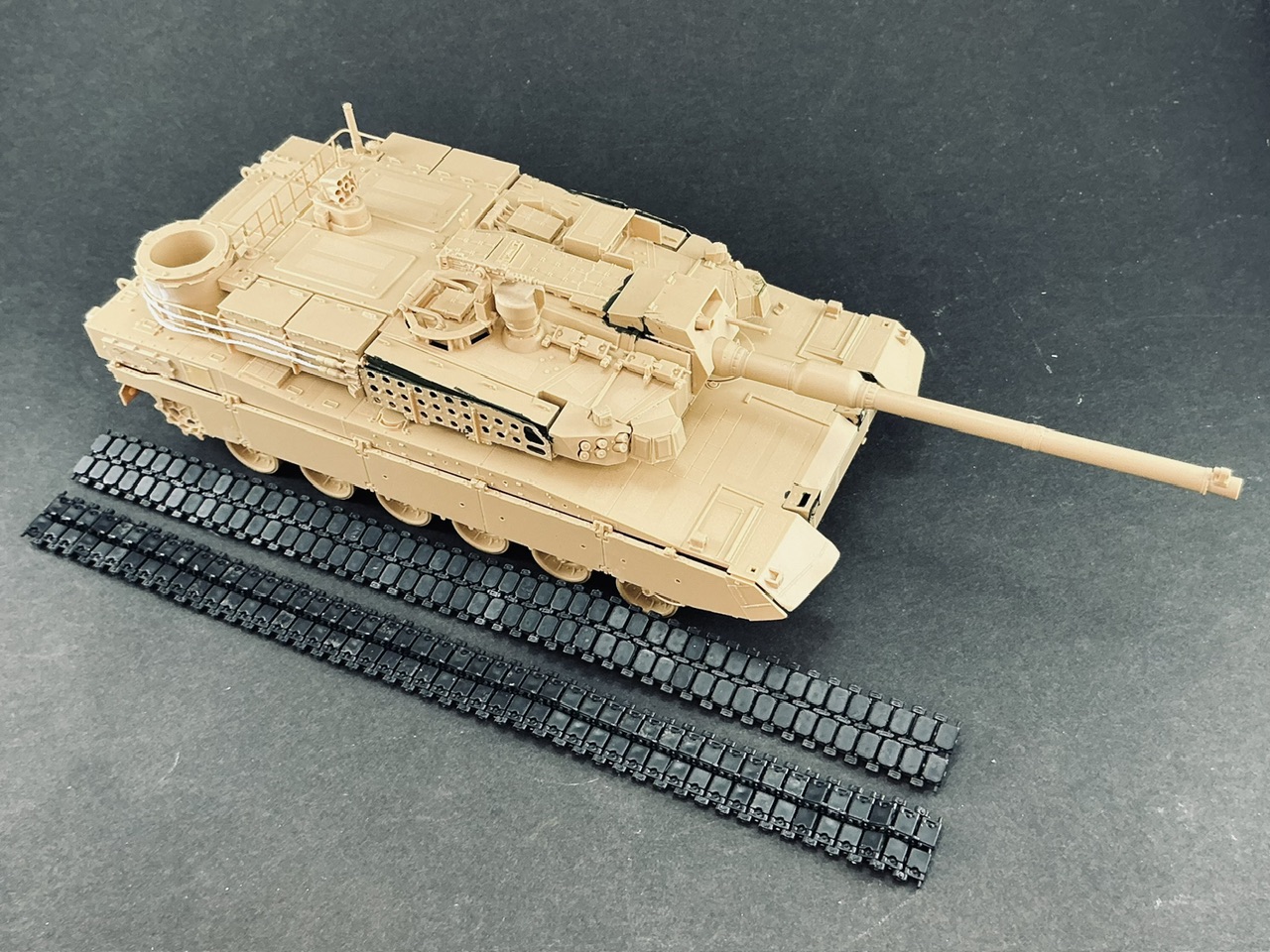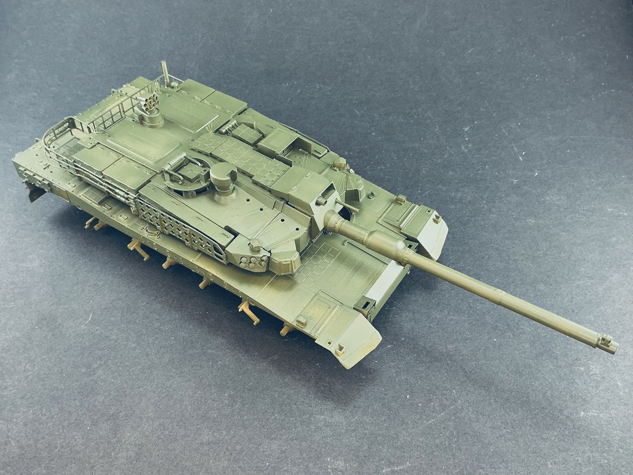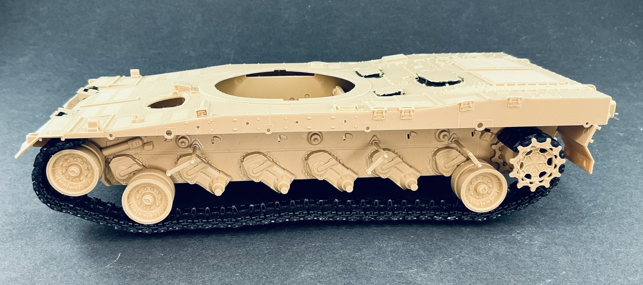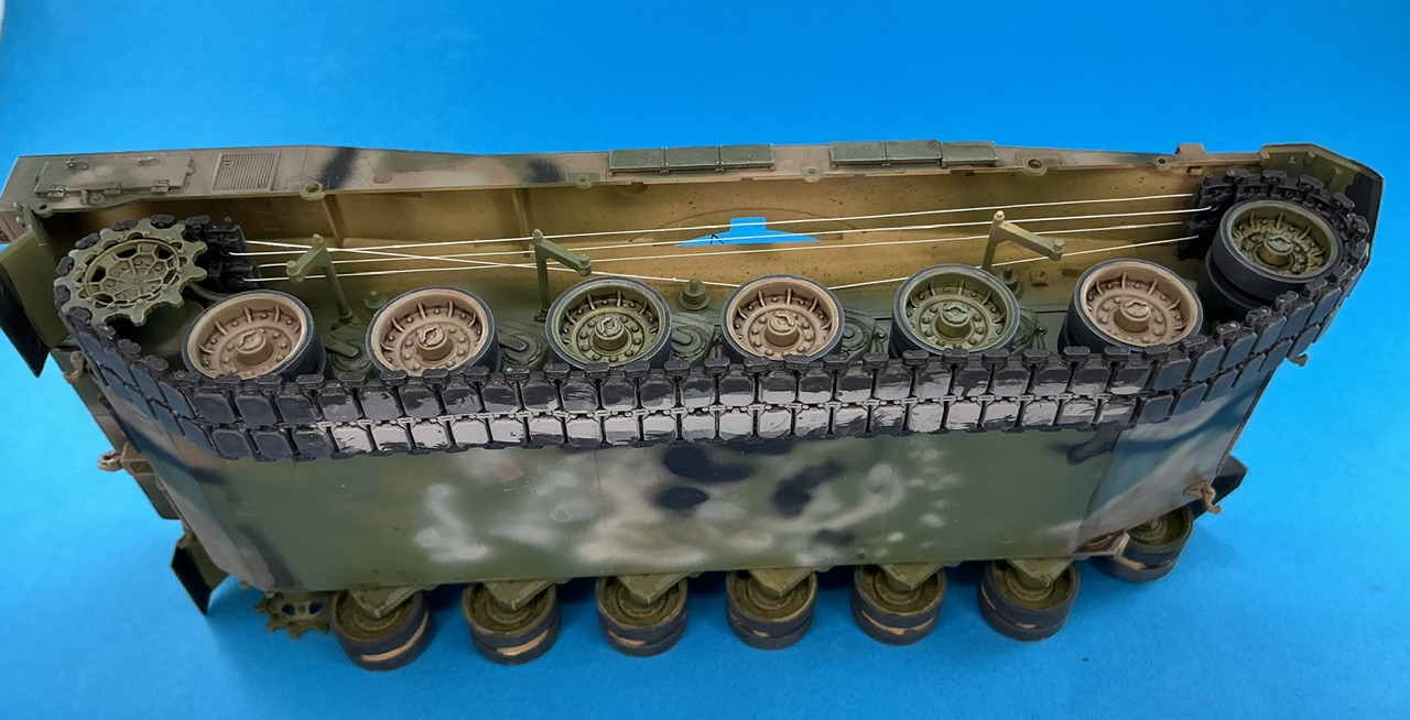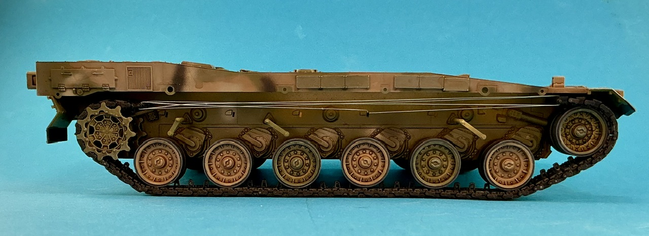 The side skirts, wheels, machine gun, driver’s hatch, spare track links and deep-wading shaft are still loose, and some parts that will be added after painting aren’t in the photo.