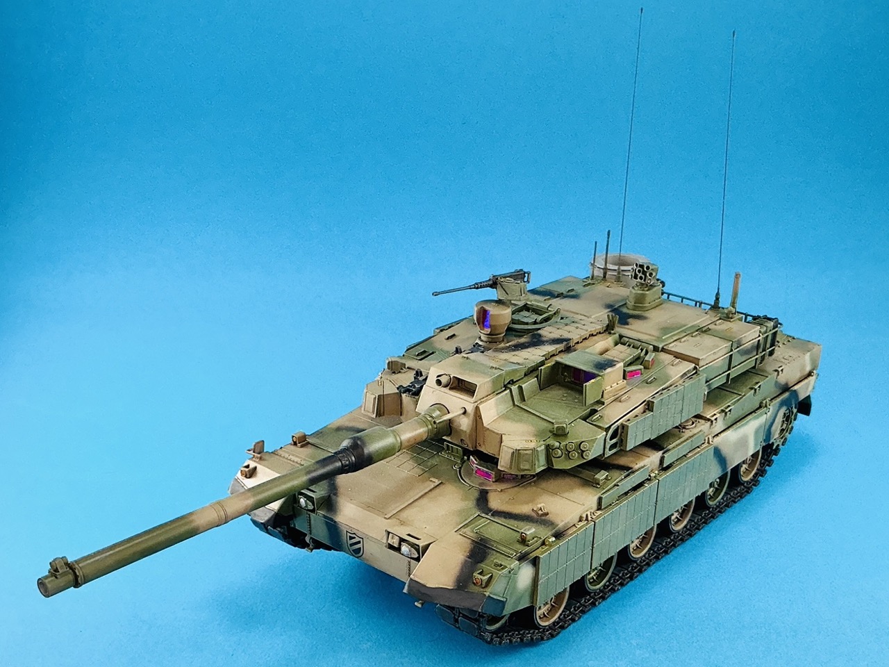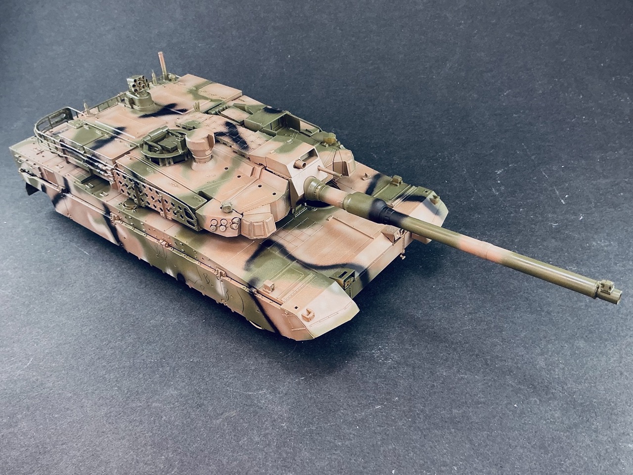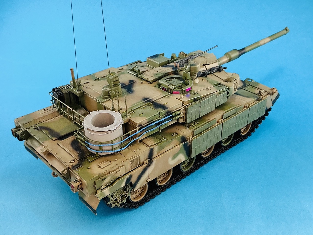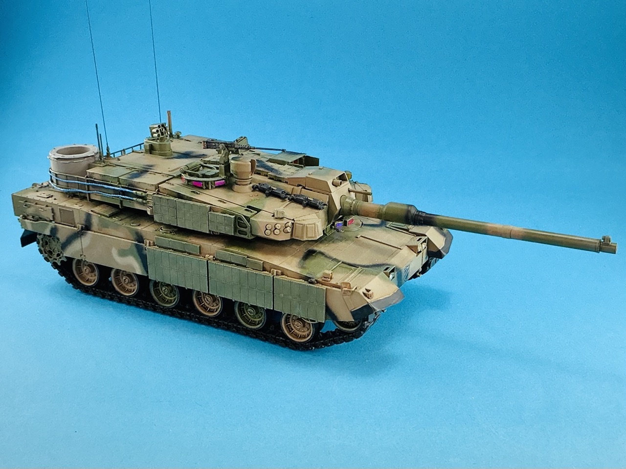 The side skirts, wheels, machine gun, driver’s hatch, spare track links and deep-wading shaft are still loose, and some parts that will be added after painting aren’t in the photo.