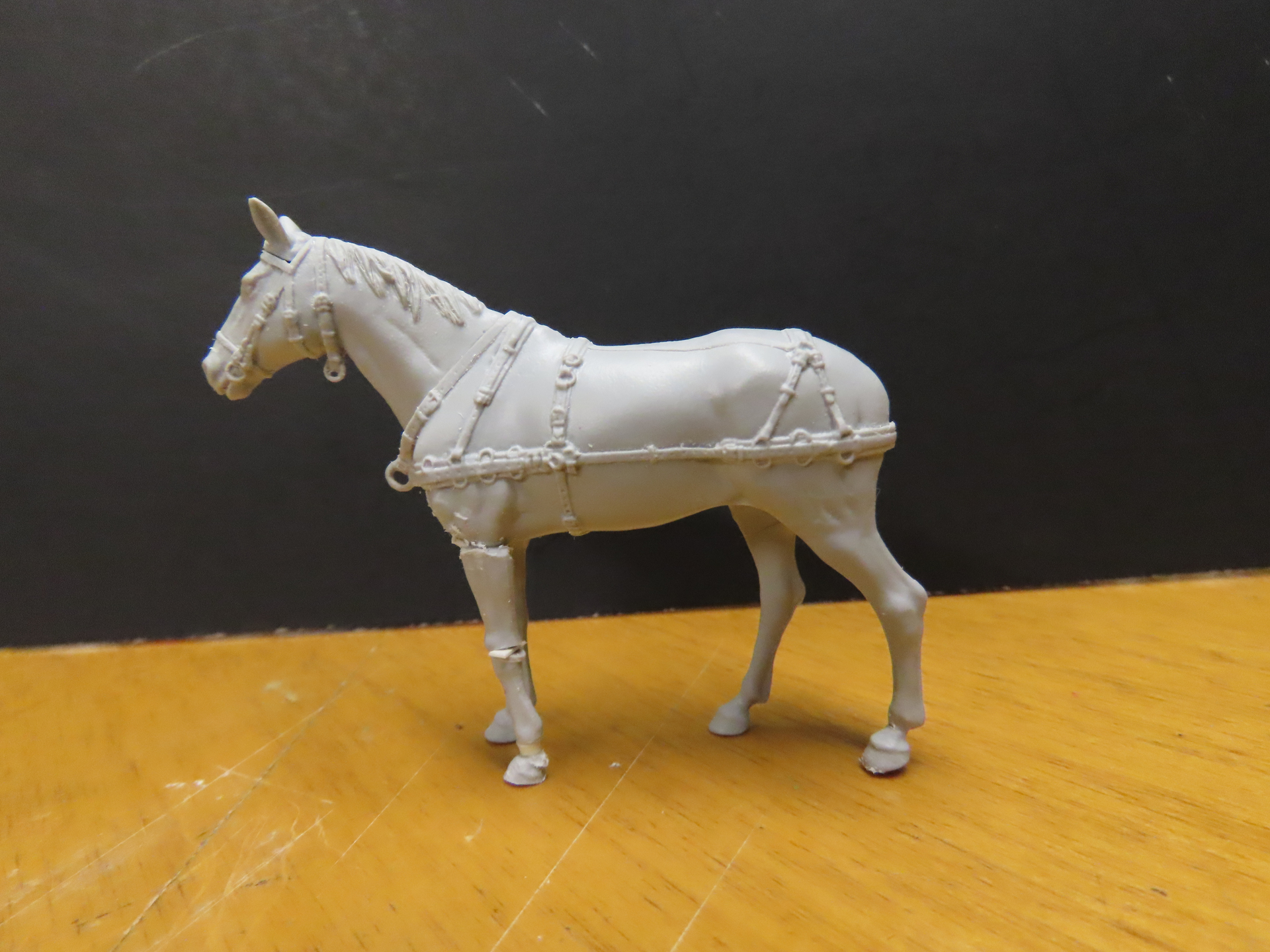 I began altering a Riich horse from walking to standing pose. The muscles will be changed next. I think Riich did the best job so far replicating the standard German harness.