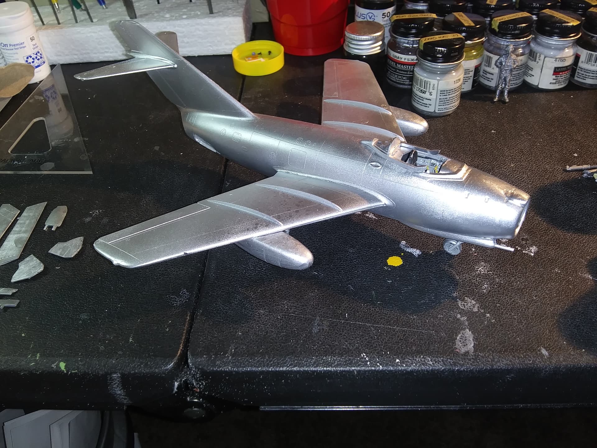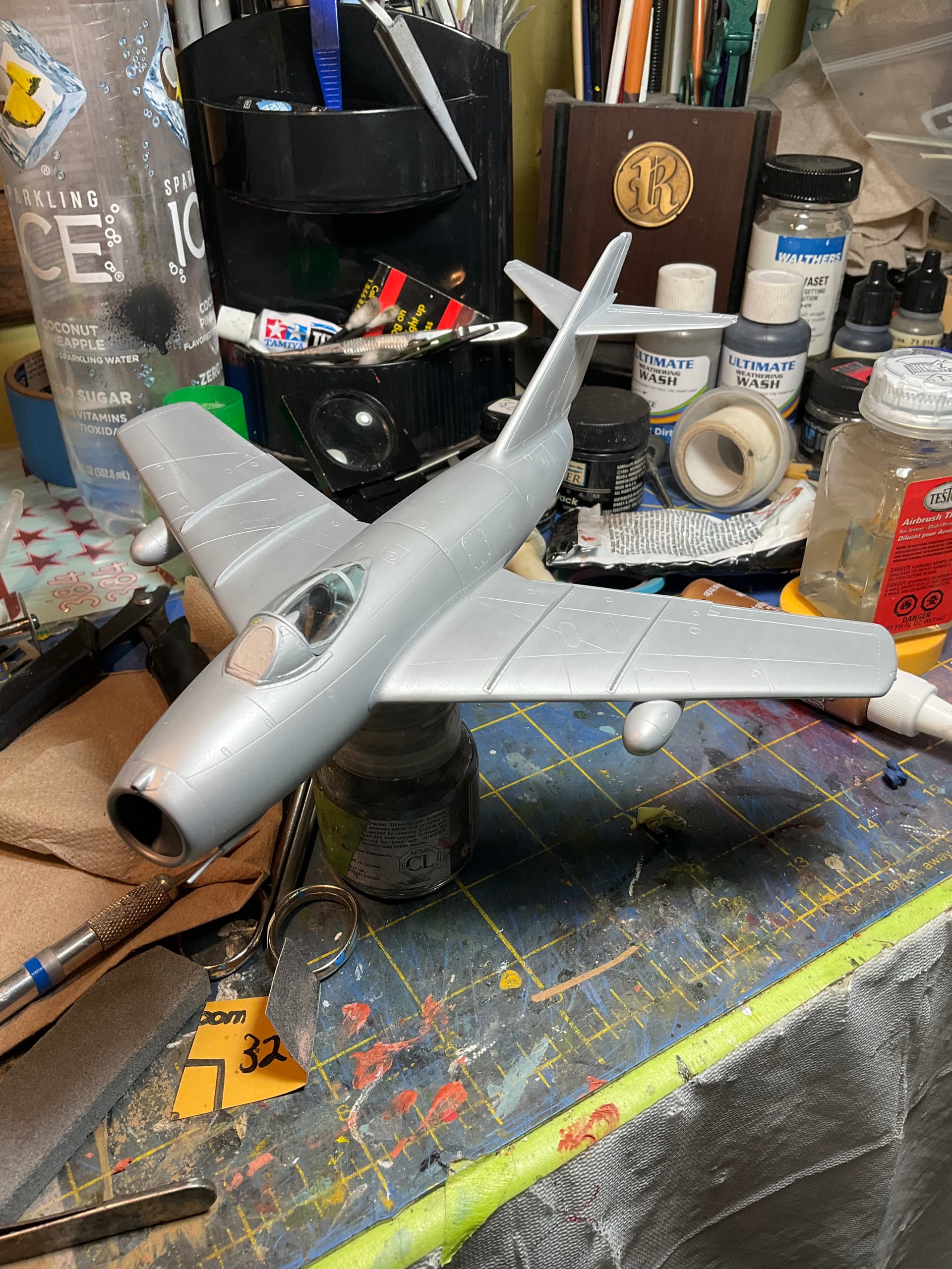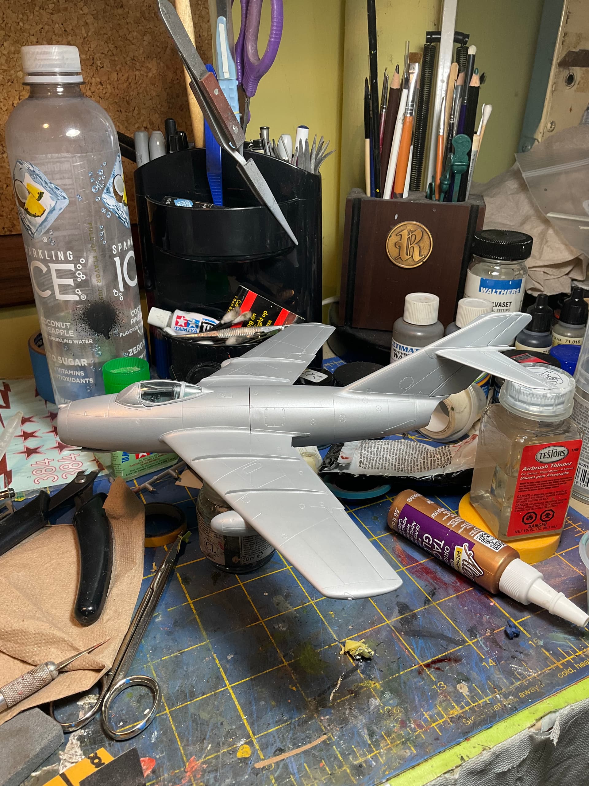It’s been a slow month for modeling. I finally finished up the sanding and puttying and put an initial coat of aluminum on the Monogram MIG. She’s up on her wheels, but still needs a LOT of work. Maybe I can finish her up before the end of October, but I don’t want to hold my breath.