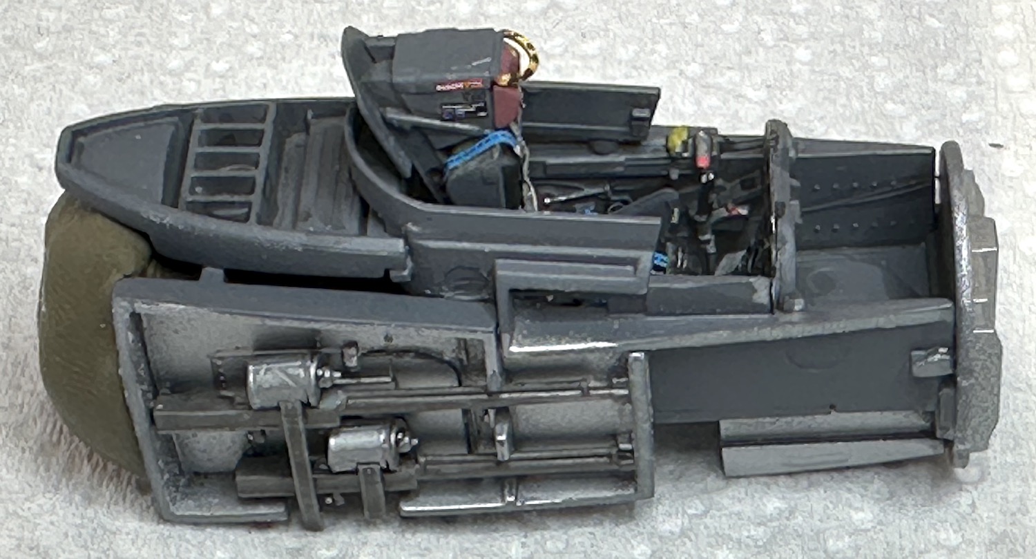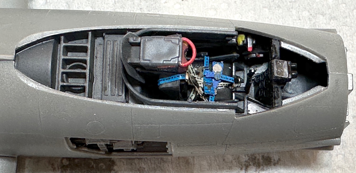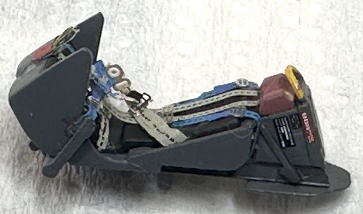The Eduard cockpit set is really a treat. It has a laminated instrument panel that looks really great. There are far more bits than I used, partially because I had already built the cockpit and could no longer reach everything and partially because some of the PE bits were too fiddly for my skill & patience. The ejection seat with its belts came out really well. I do wish I had waited to install it. It turned out to be in the way in many future operations including trying to fit the canopy. It is just a bit too tall to allow the canopy to close which upset my plans for masking the canopy and using that as a mask to protect the cockpit. We are getting a bit ahead of the narrative though.