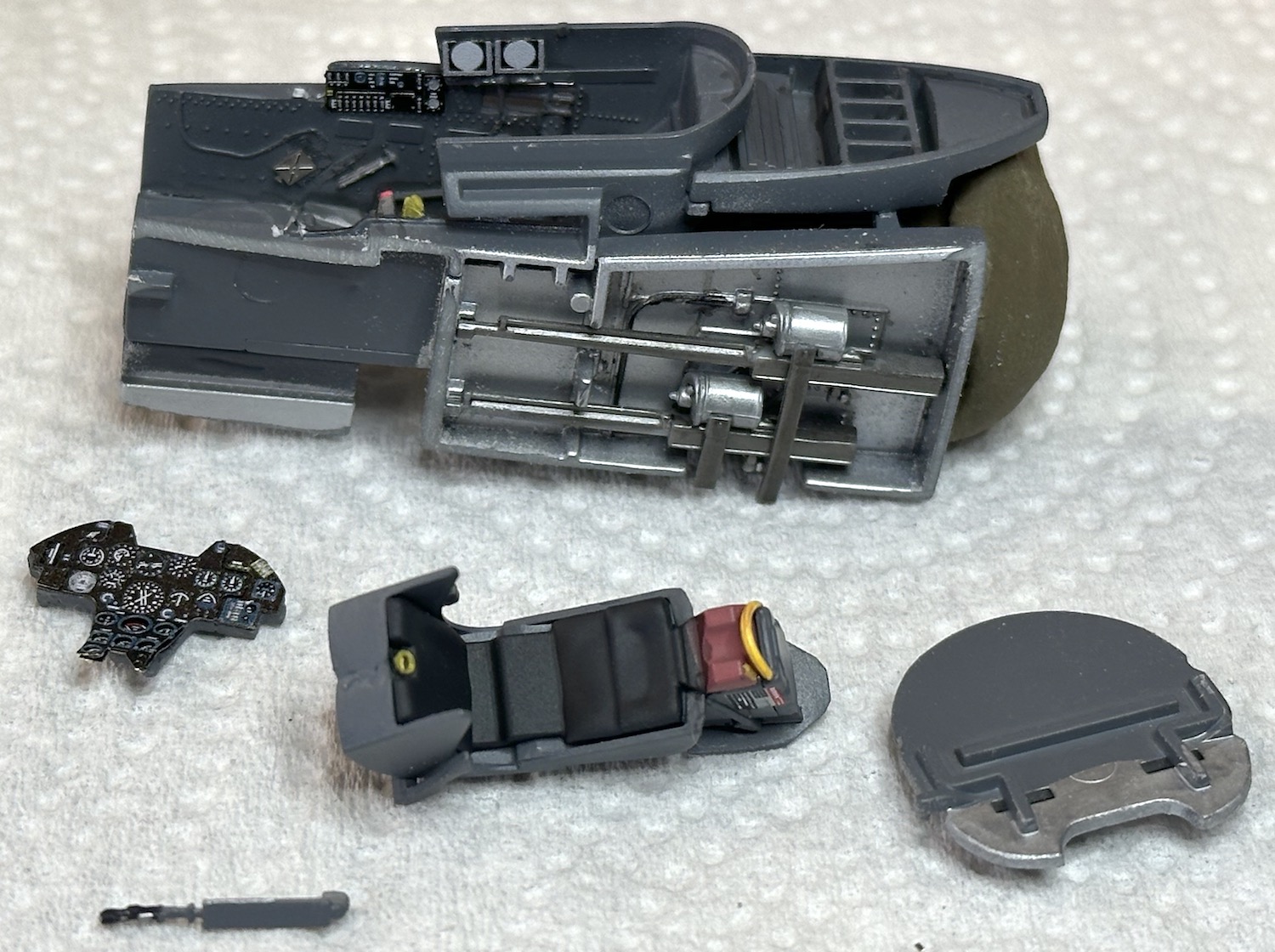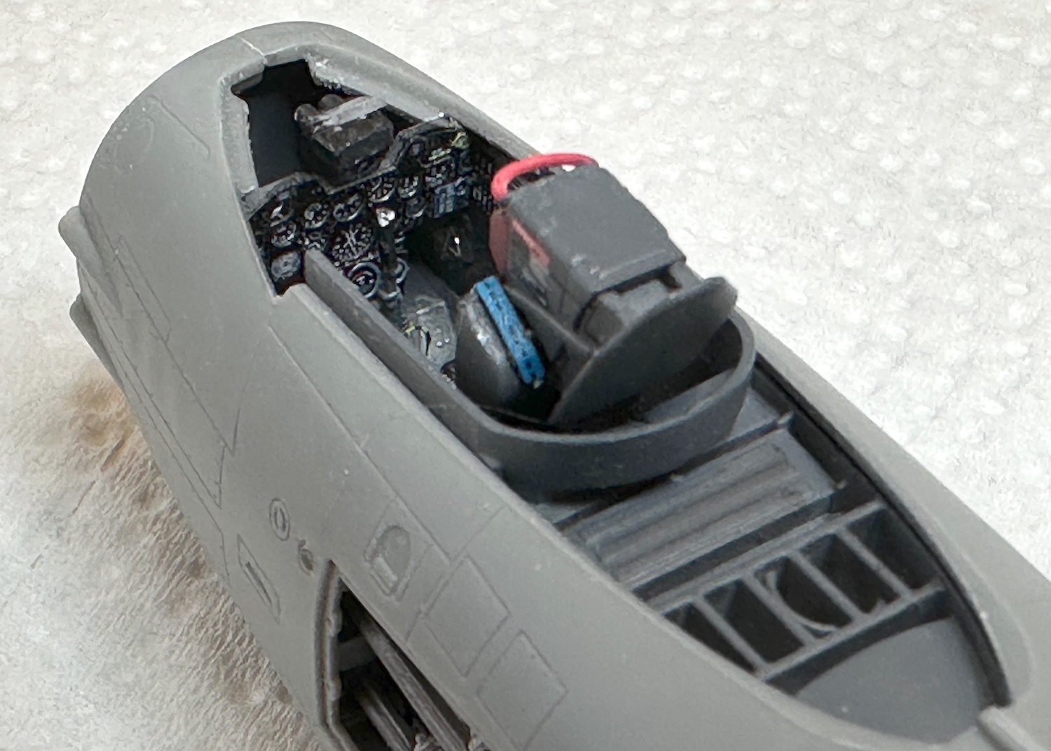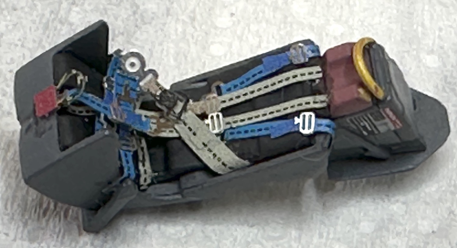 The Eduard cockpit set is really a treat. It has a laminated instrument panel that looks really great. There are far more bits than I used, partially because I had already built the cockpit and could no longer reach everything and partially because some of the PE bits were too fiddly for my skill & patience. The ejection seat with its belts came out really well. I do wish I had waited to install it. It turned out to be in the way in many future operations including trying to fit the canopy. It is just a bit too tall to allow the canopy to close which upset my plans for masking the canopy and using that as a mask to protect the cockpit. We are getting a bit ahead of the narrative though.
