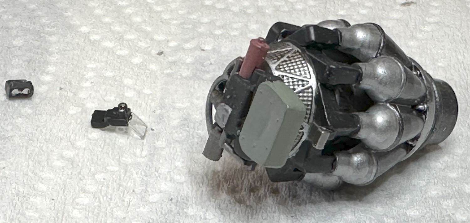 Sadly, the BBs added were not enough to cure the problem, this Meteor was still a tail sitter. The only two options I could see now were opening the belly of the model and adding BBs inside or loading weight into the conformal fuel tank. Modeling clay didn’t add enough weight so BBs were glued into the tank. I carefully sighted along the top surfaces to make sure none of them would interfere with a good fit to the belly of the aircraft. In checking that, the BBs moved and some DID get out of place and were now not going anyplace!