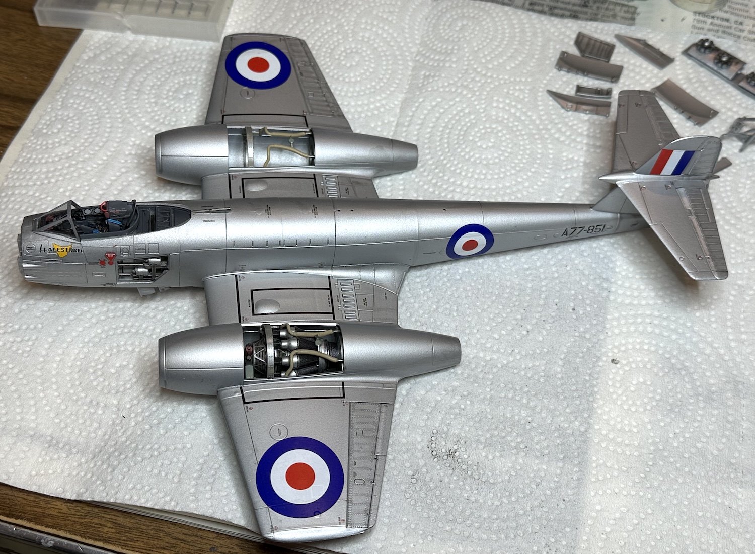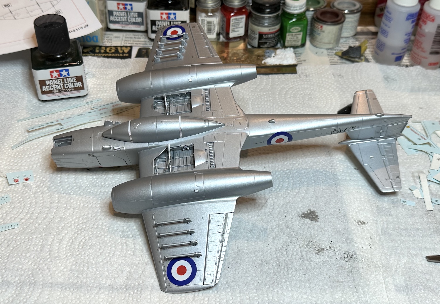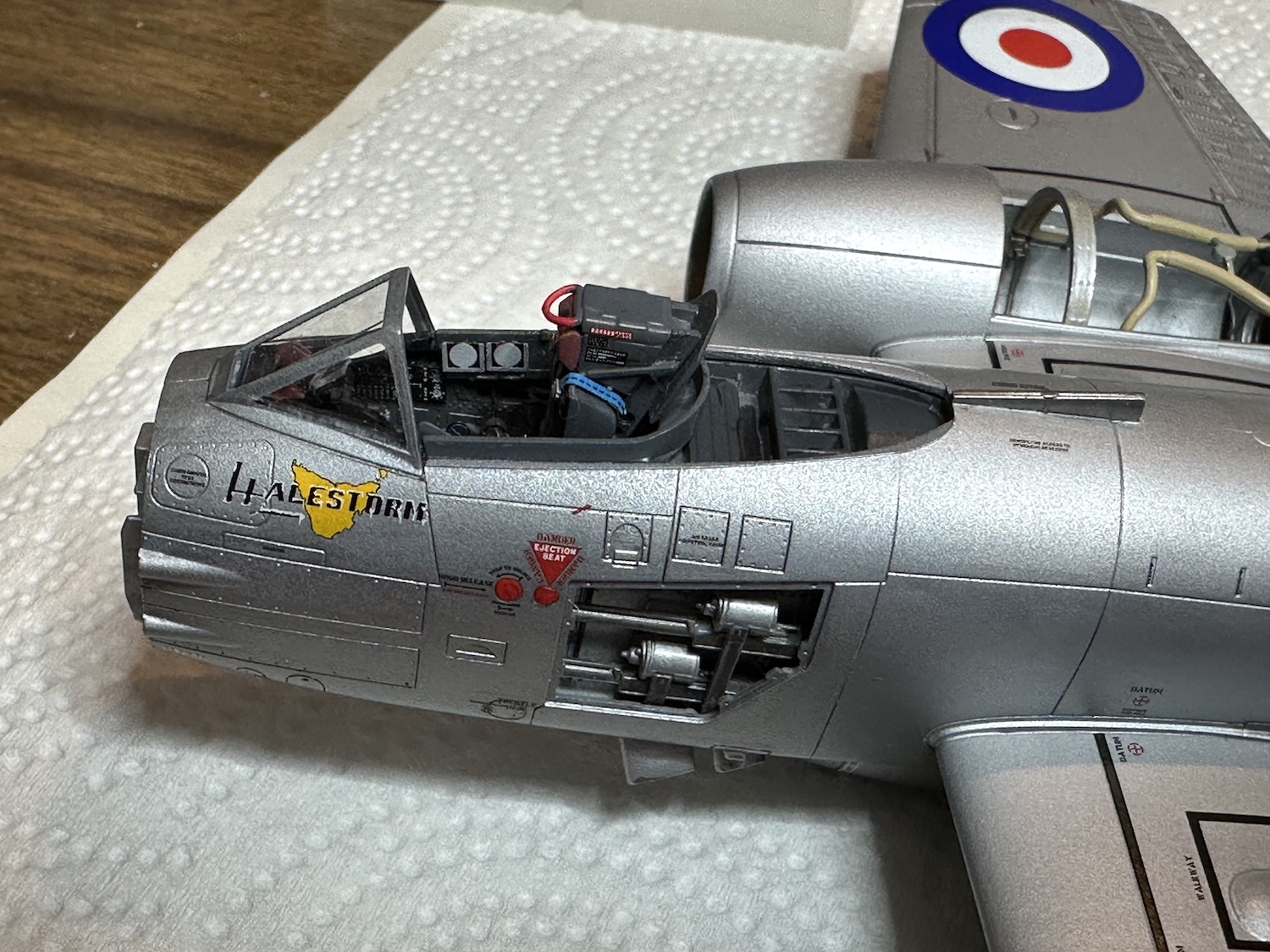 While the large decals had stuck to the model as they should, the stencils were a very different matter! These teeny tiny decals had little desire to be stuck to this Meteor. They took every opportunity to fall off, stick to my fingers or otherwise misbehave. Quite a number of them abandoned ship, some I found and could replace, others need to be replaced by spares that looked something like the original had. There is at least one that disappeared with no trace and could not be replaced. Oh well!