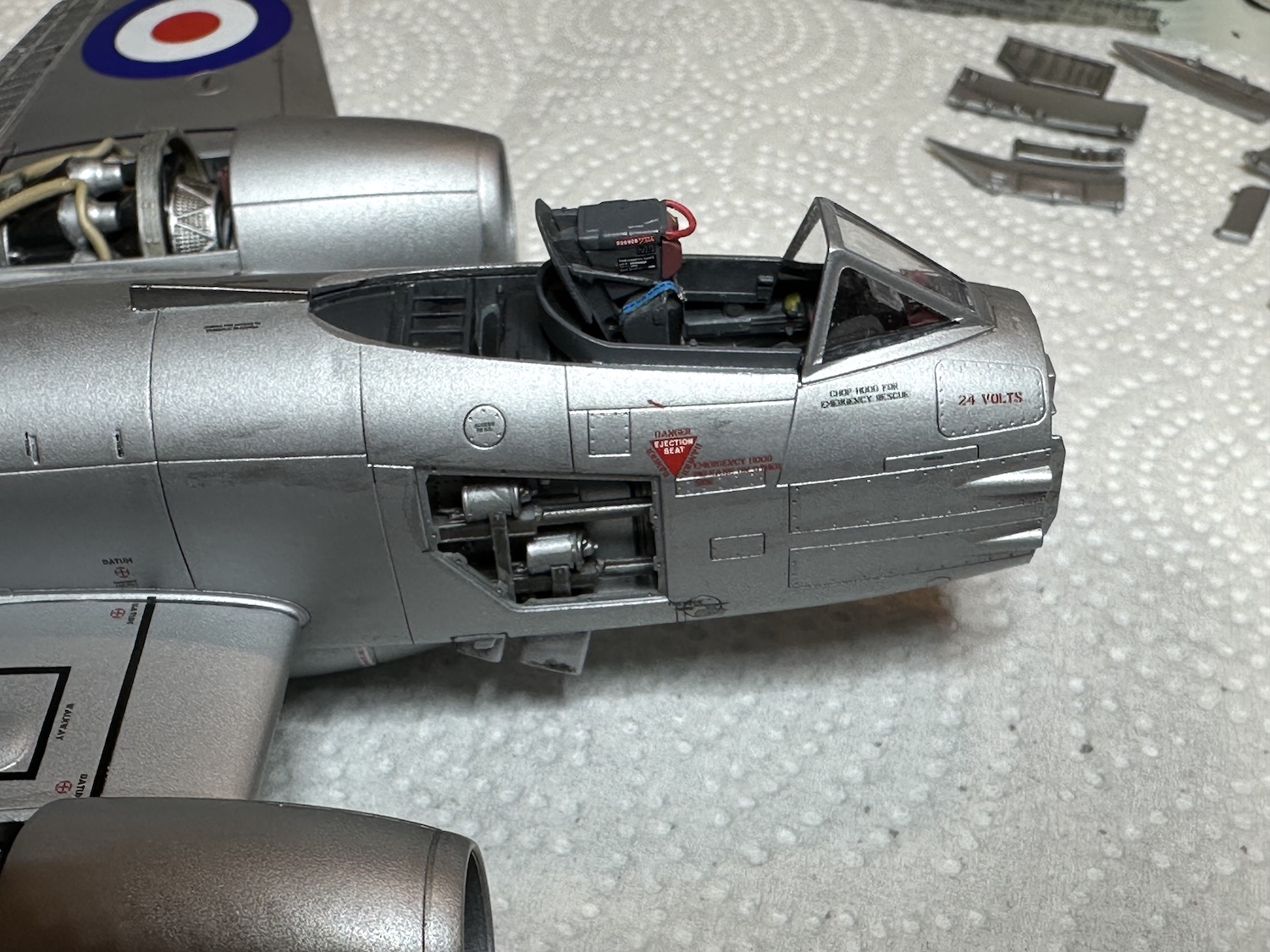 I got some more done on the wonderful 1/48 Airfix Meteor F8. I like to add the decals so they can share whatever weathering and panel line accents are done to the rest of the model. This proved to be a four day ordeal. The major large markings went on easily. The decals were well printed in colors that looked correct to my eye. They took a long time to separate in the water but that was no issue outside of time too wait. With the many, many stencils, this was time well used trying to find what went where.