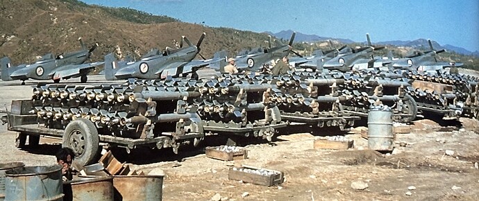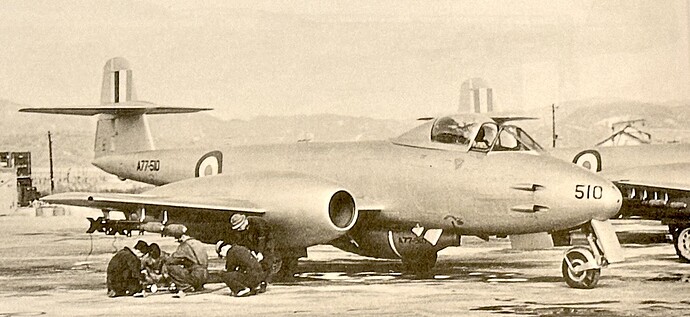 The Meteor is such an interesting aircraft and it just looks right to my eyes. This F8 version has to be the best looking of the line and Airfix did a great job with the kit. The plastic was nice to work with, the detail restrained and in scale and the kit was well engineered. Even the decals, but for the adhesion of the stencils, were great, well printed and with believable colors. Only the directions let the kit down. They were the pictograph style and had no color call outs outside of Humbrol numbers. Also, the building sequence was suspect but that it pretty normal. Almost all kits need to be studied to develop a realistic path to completion. Just now, comparing the kit air intakes with the pictures, I’m wondering if I have the correct ones on the model? I thought the destructions called for the large ones on this version but the photo of the Aussie Meteor being armed seems to show the small intakes . . .