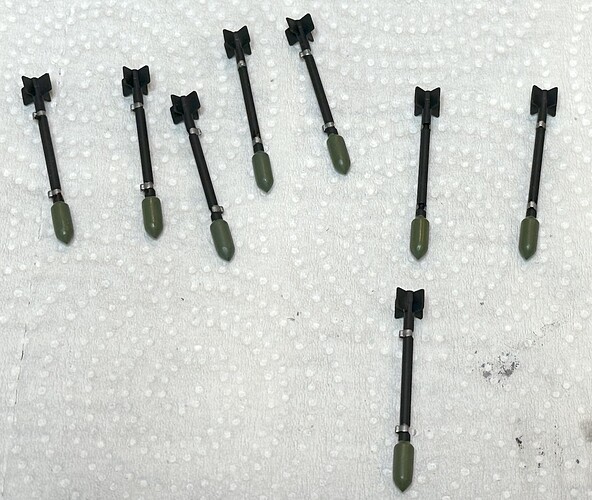 The warhead is decidedly a darker color and OD seemed right. The body might have been a grey but I had already painted it black. A yellow was added to the tailpipes also.