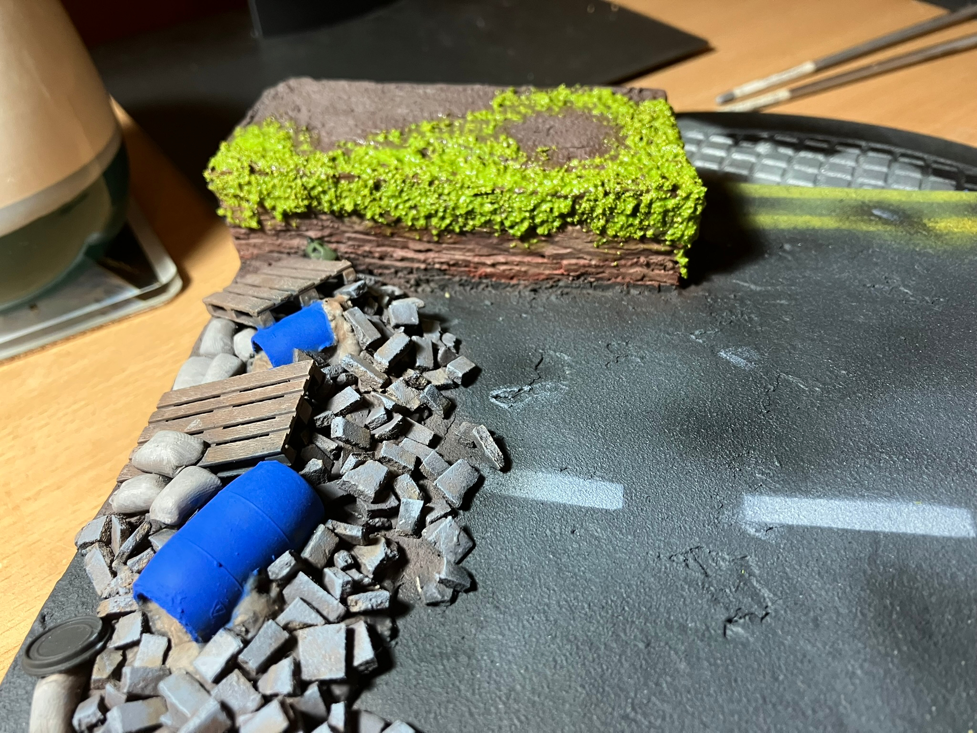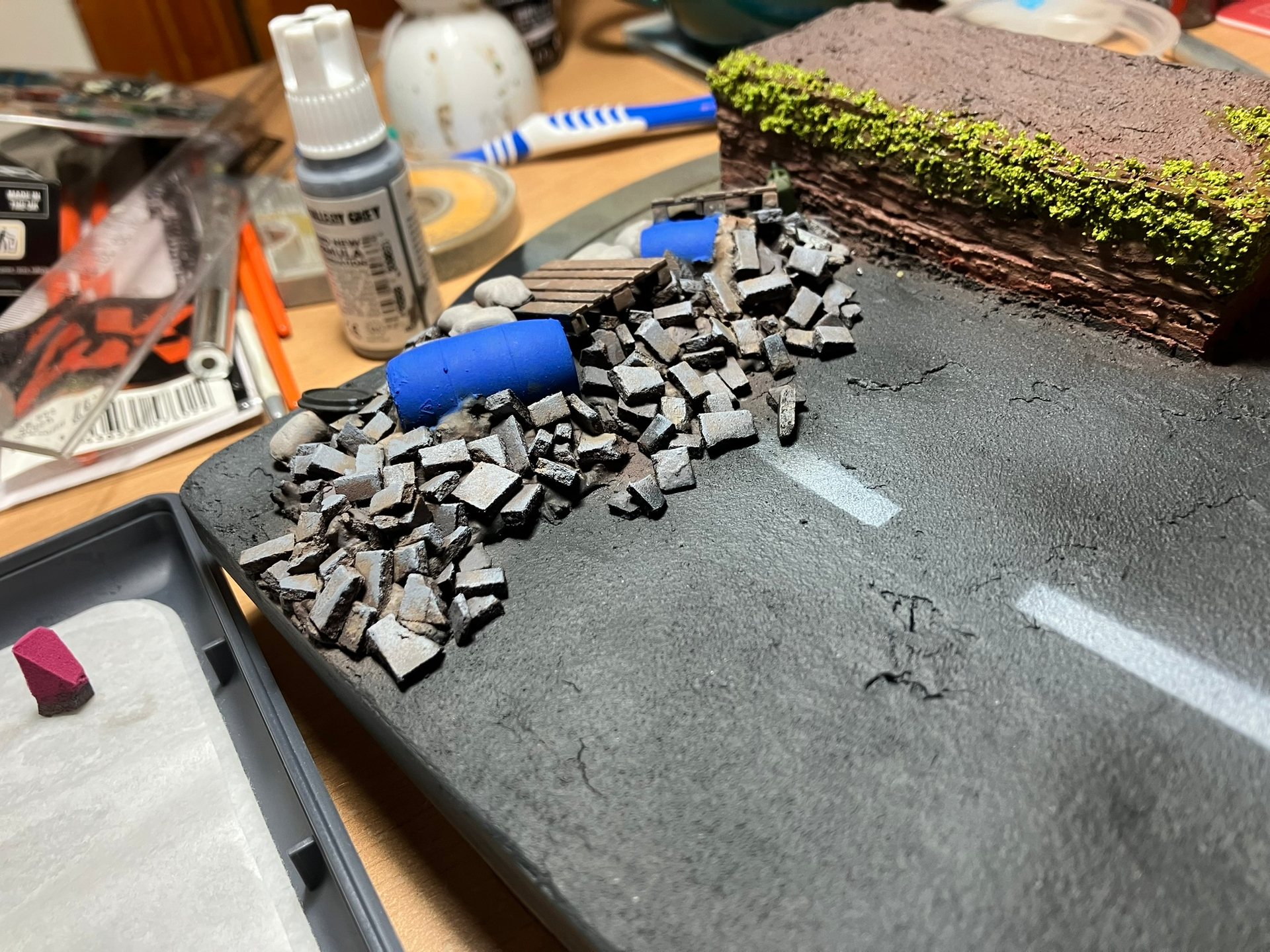For the piles of Rubble I painted a few different colours onto various parts to try and give variation and then went over it all with some grey tones after words to tie it together a little bit. Once I can get some varnish on it and then use some pigments etc I think it will fully tie together. And the same with the road surface, with a few small puddles on the surface to give it some depth.