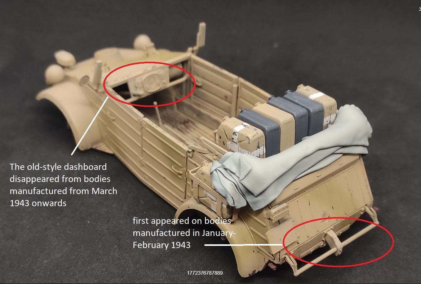+now this model has many features characteristic of Typ 82 models produced in early to mid-1943. Vehicles like this could not have been sent to the African front, but could easily have appeared in the Italian campaign in 1943+. Desert wheels were also used in the Italian campaign.