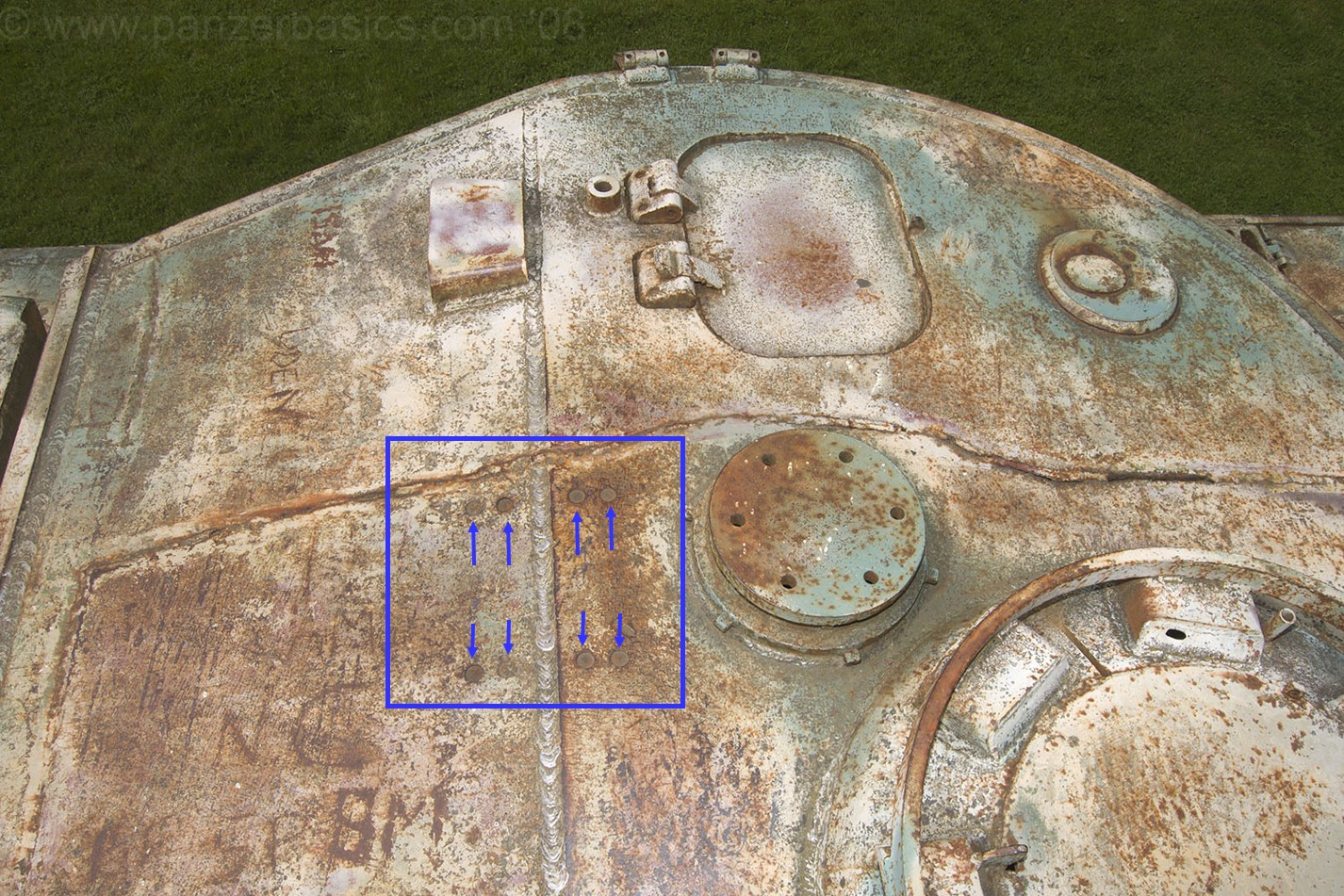 It is hard to find pictures of the Bovington Tiger that show the bolt recesses on the roof. This is the best I found :