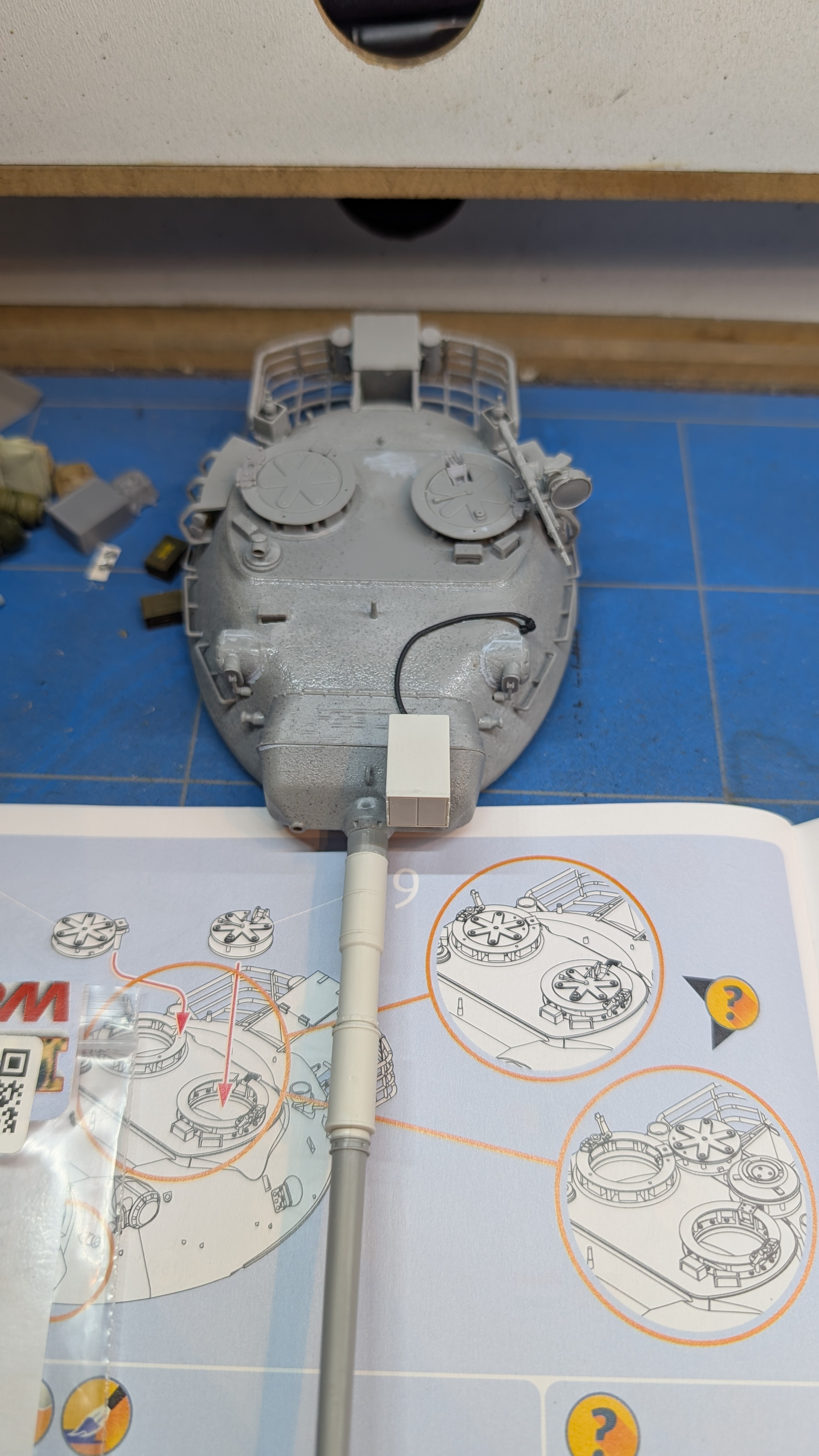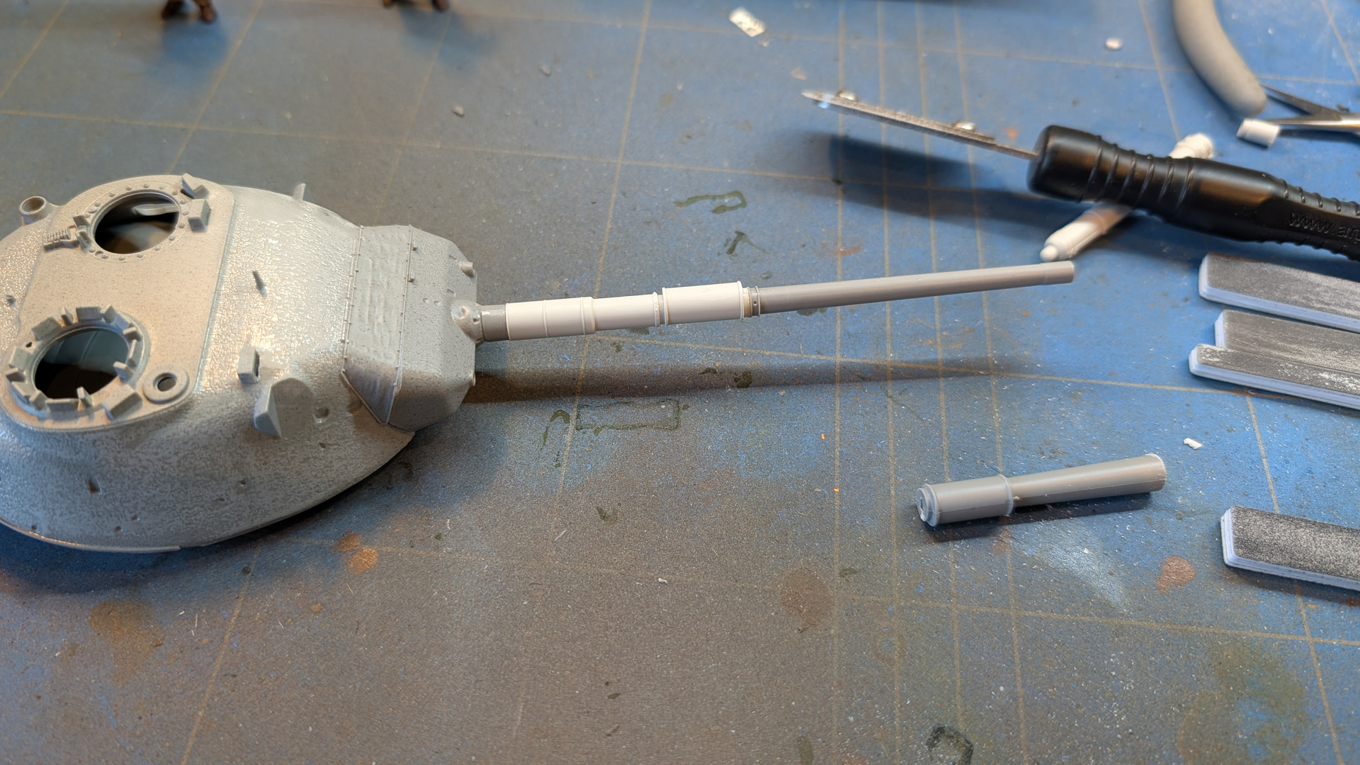 The Revell kit of the early Leo only comes with the Naked barrel, so doing it that way wasn’t really an option. Instead I inserted part of a barrel of a Meng Leopard 1A5 I have in the stash, that I have an after market barrel for. Easy.