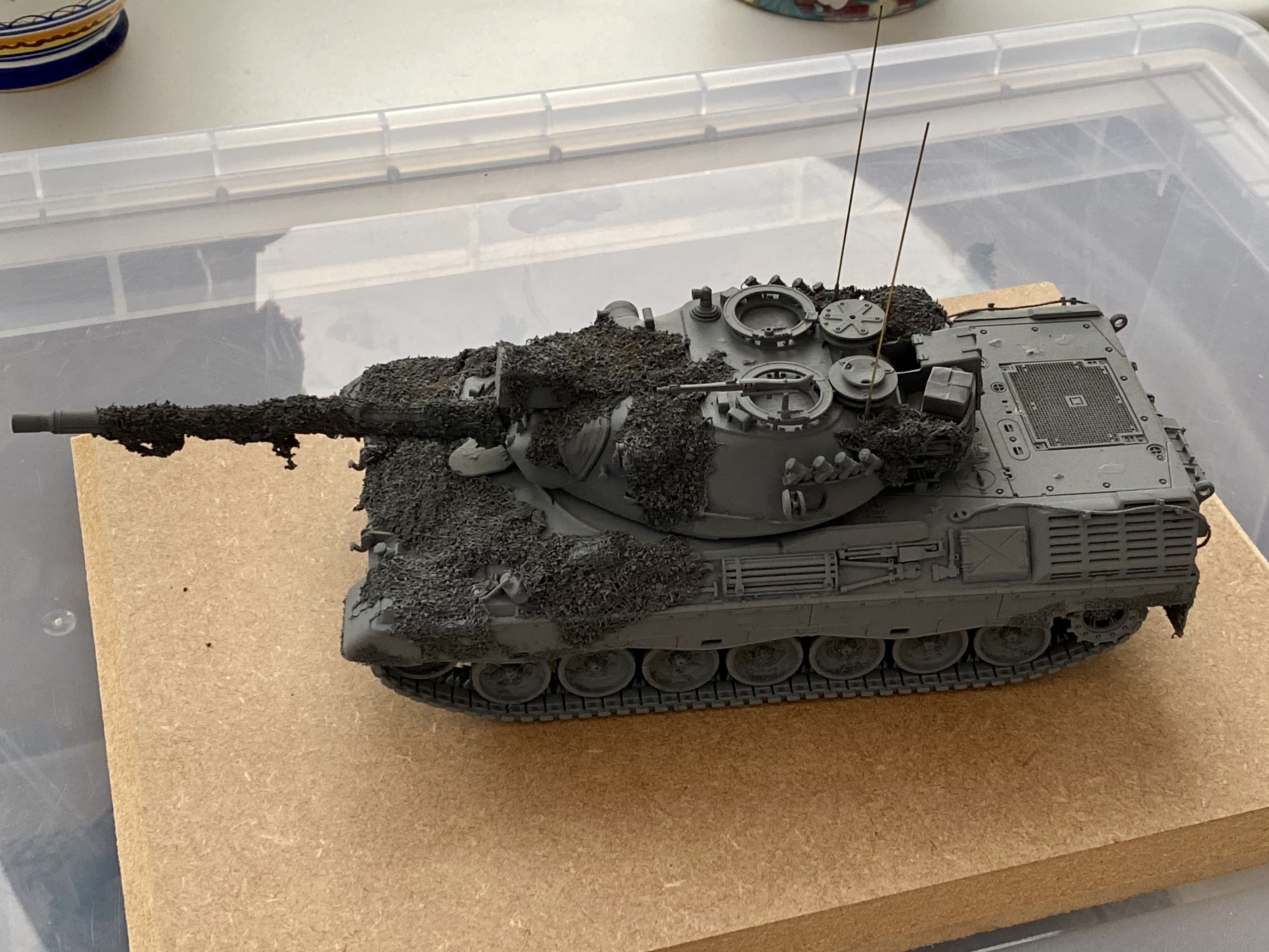 My latest build is the ancient Leopard from Italeri (No 374) advertised as a 1A2, but it is in fact a 1A1. I started the build ages ago (sadly a recurring theme) then abandoned it but have recently dusted it off and set to. It’s not that bad a kit although I was horrified by my inattention to detail back when I started it at least a decade ago: poor fit and glue seams everywhere. That said, the kit was a little deficient in that an episcope was missing and sink marks and knock-out pins abounded. I replaced the engine cover with an excellent etch set from Perfect Scale Modellbau which was a vast improvement over the kit’s mesh. I also added chains to the smoke dischargers -always a must I feel on Bundeswehr models, and obtained a set of plugs for the mantlet cover from Leopard Workshop, and very good they are too although a bit of a test for the eyesight!