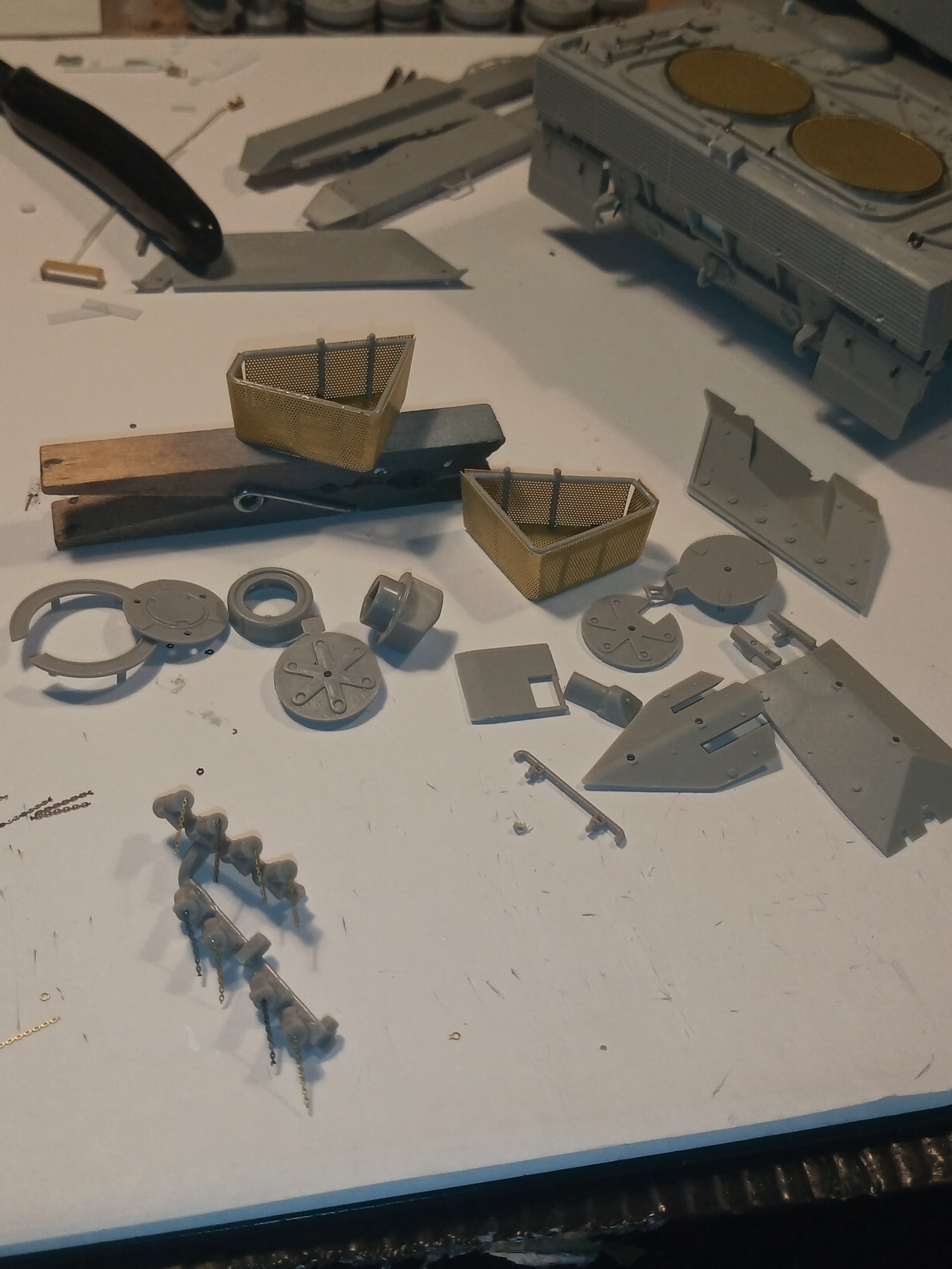 Both the outer rear baskets needed a bit of persuasion and work to make them stay together and also the lower smoke grenade mounting bar needed to cut down and reglued to get it to fit.