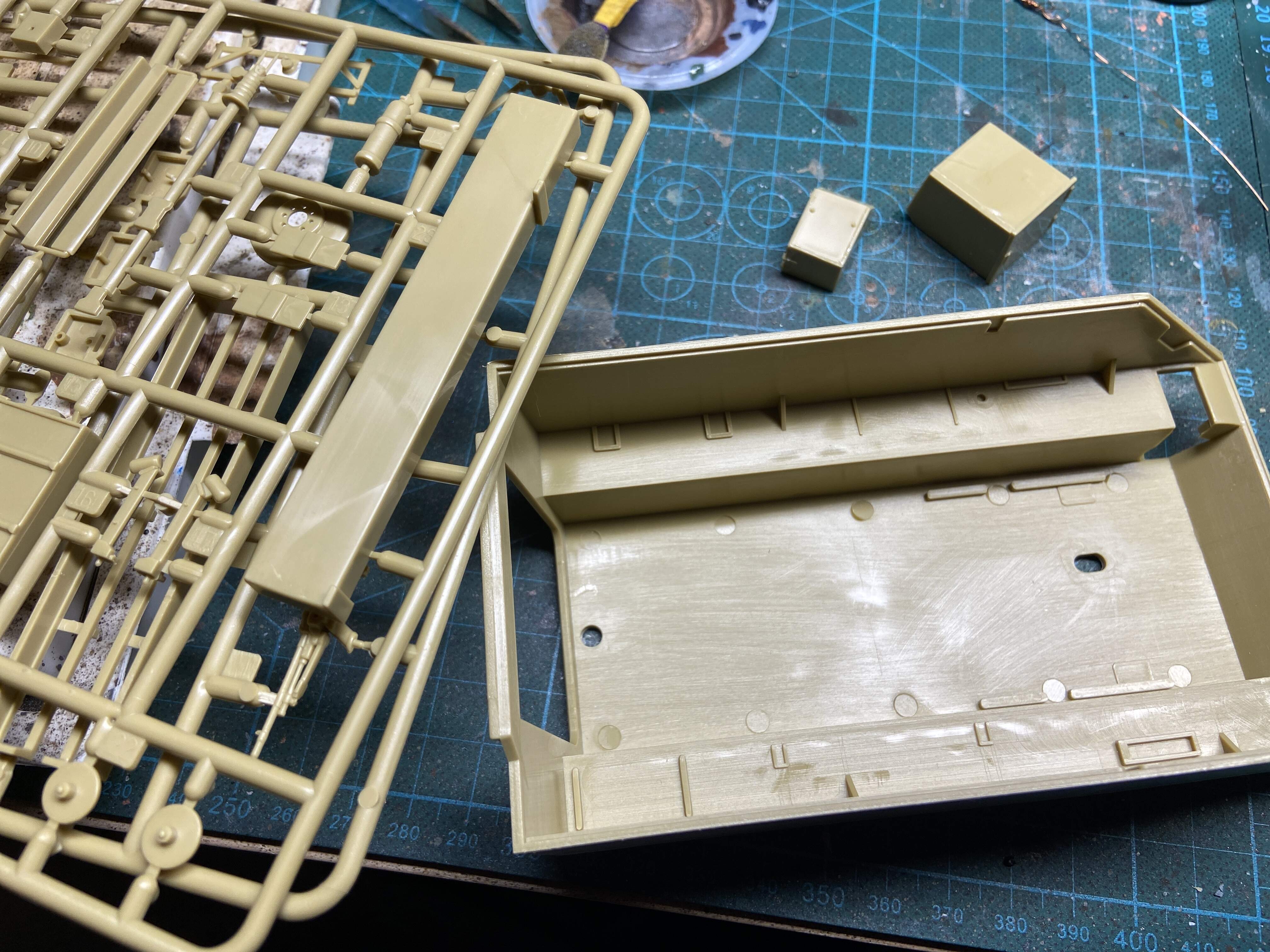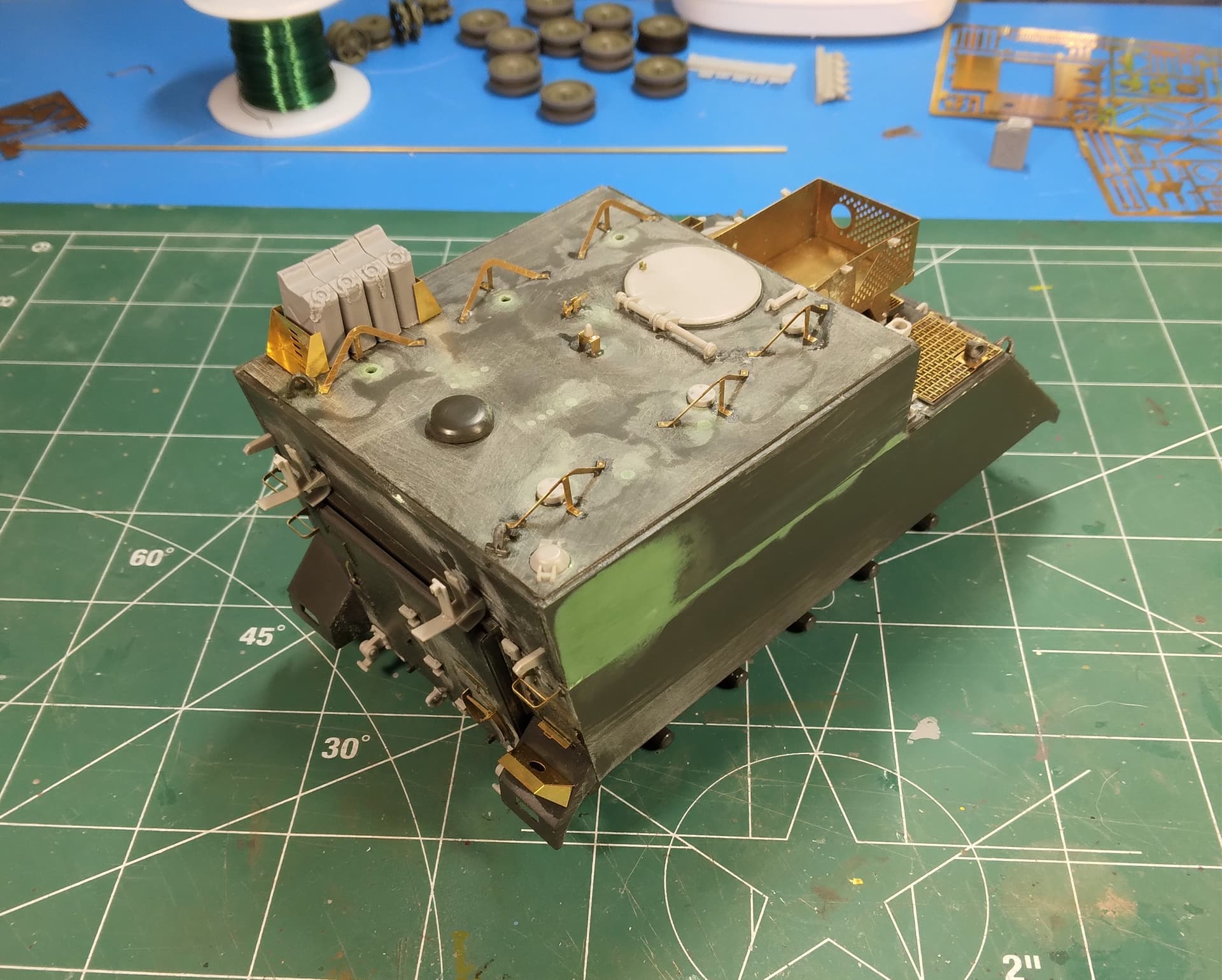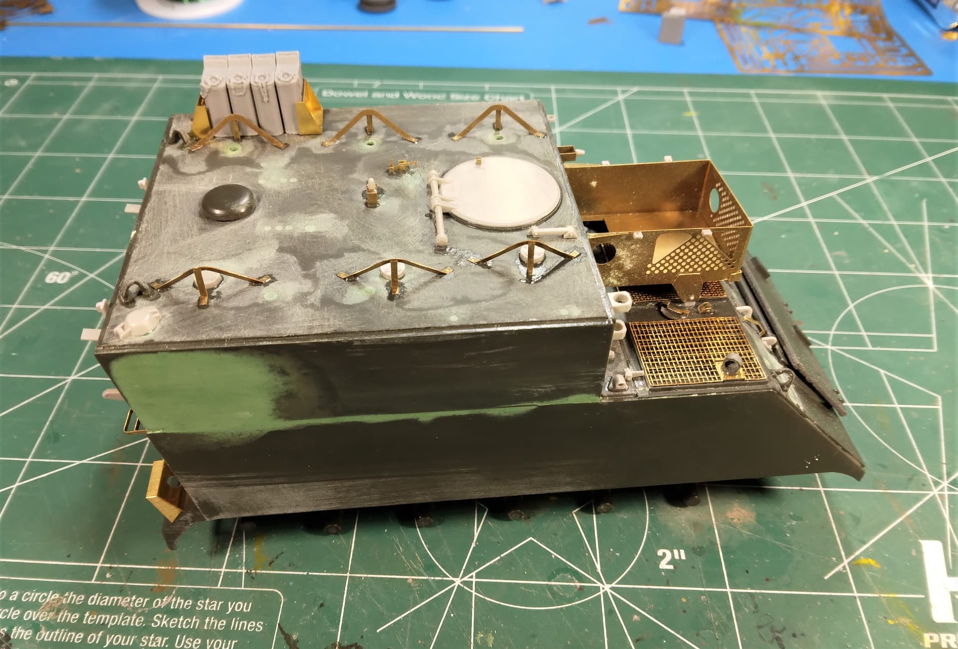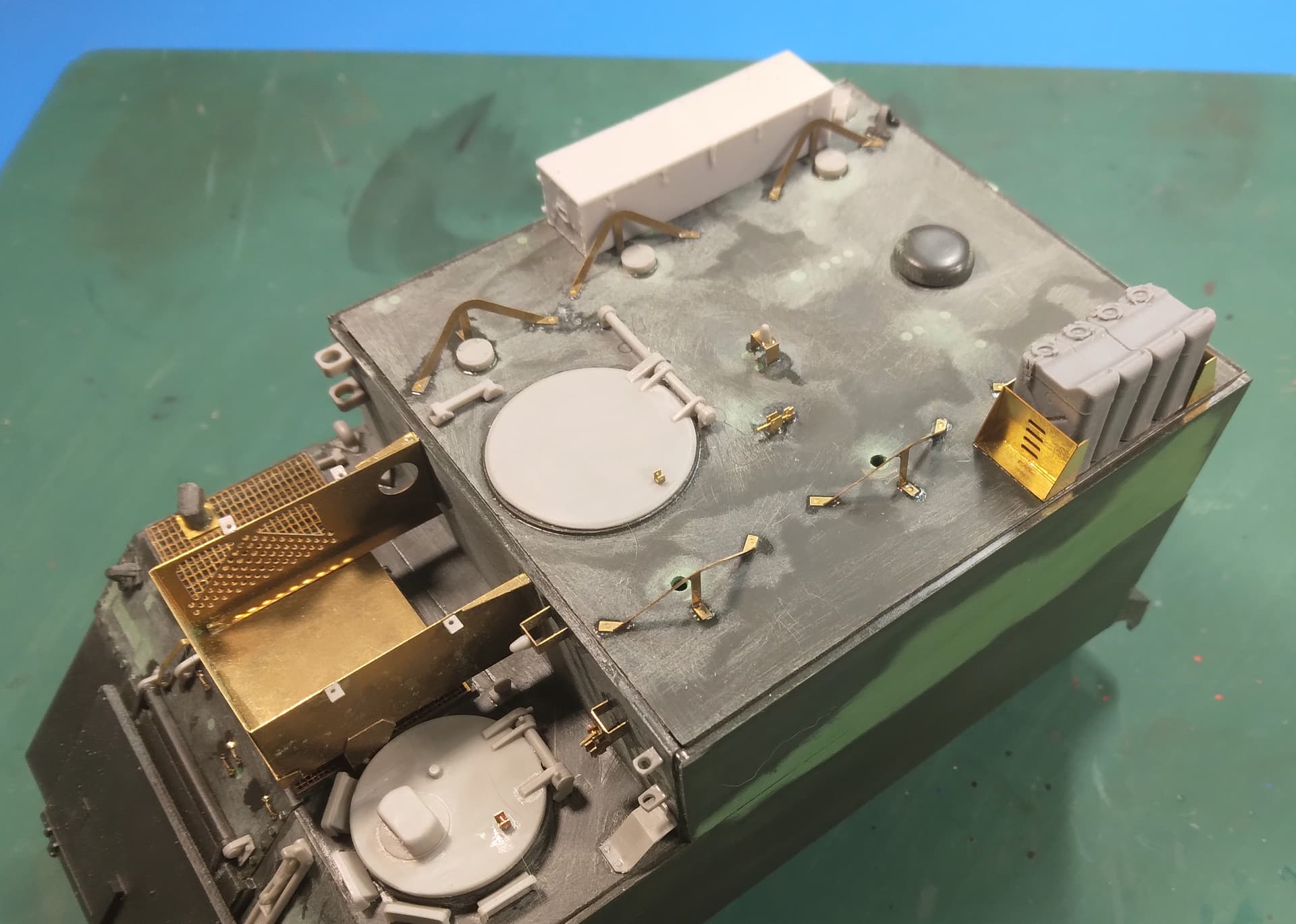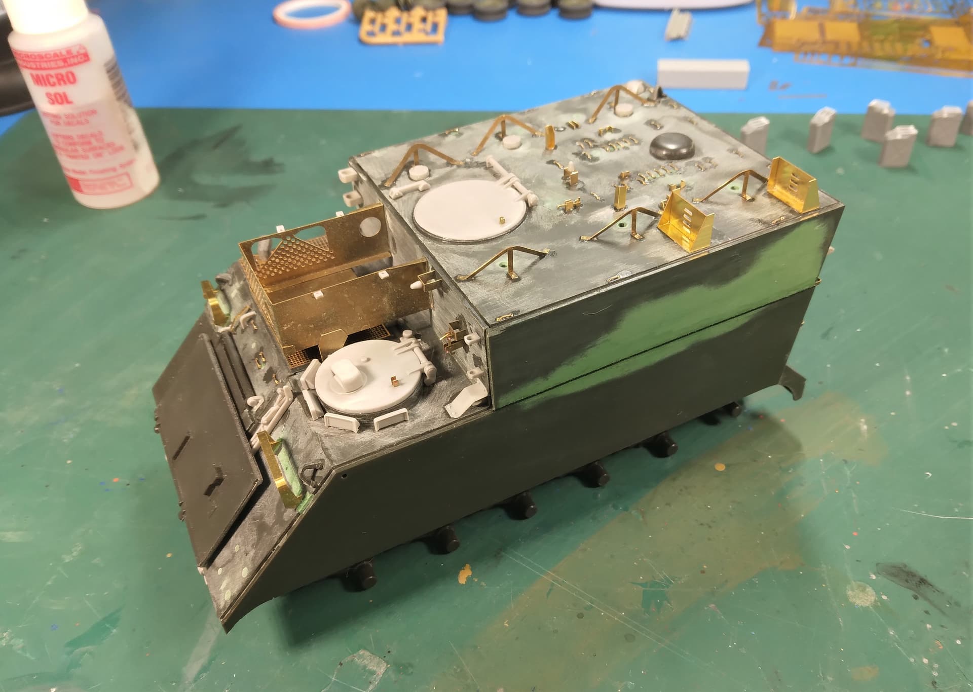 Right off the bat, Iāve found and used four parts from Eduardās set that are integral to the M577ās Iāve had; the two brackets on the driverās side rear. We used them to hold the fuel cans instead of the ballasts (that Iāve never seen in any FA unit Iāve been in). Also, the fuel can brace on the right rear above the āfenderā and the bracket on the fender itself. The other part(s) are the two straps that cross the front of the trim vane.