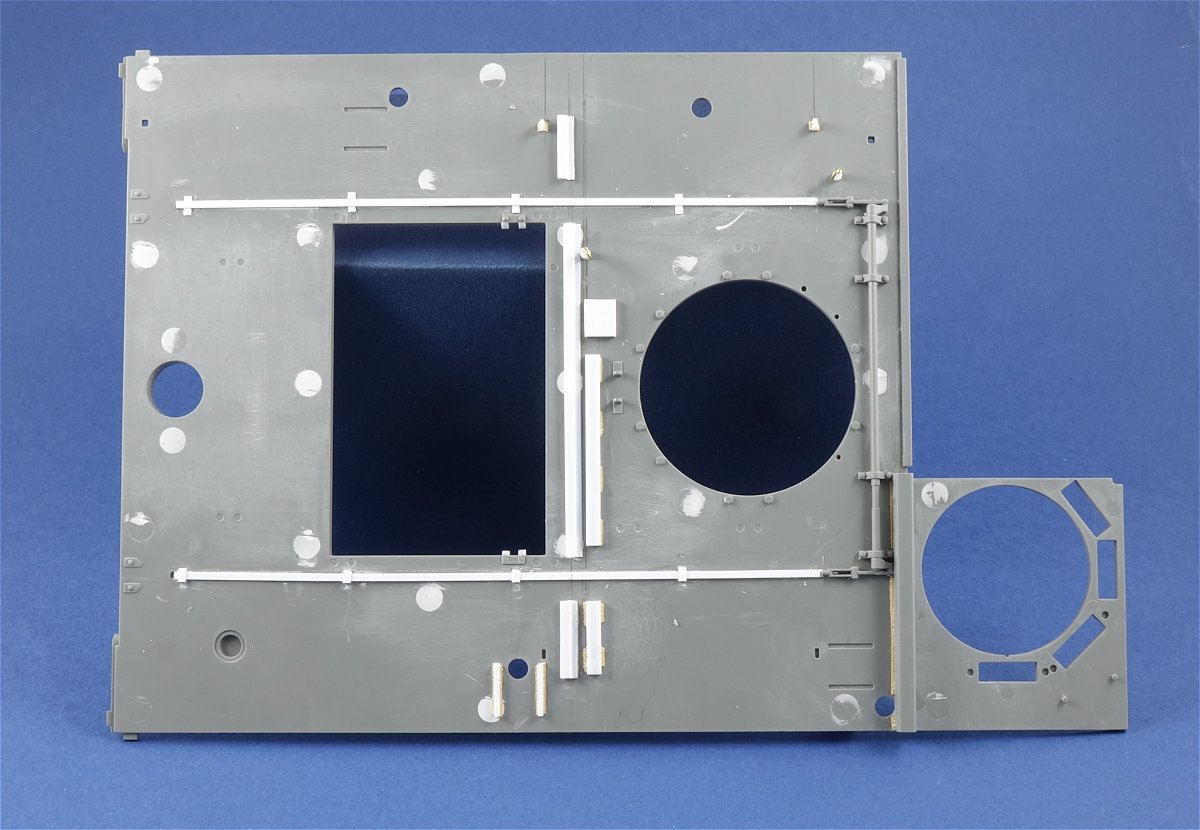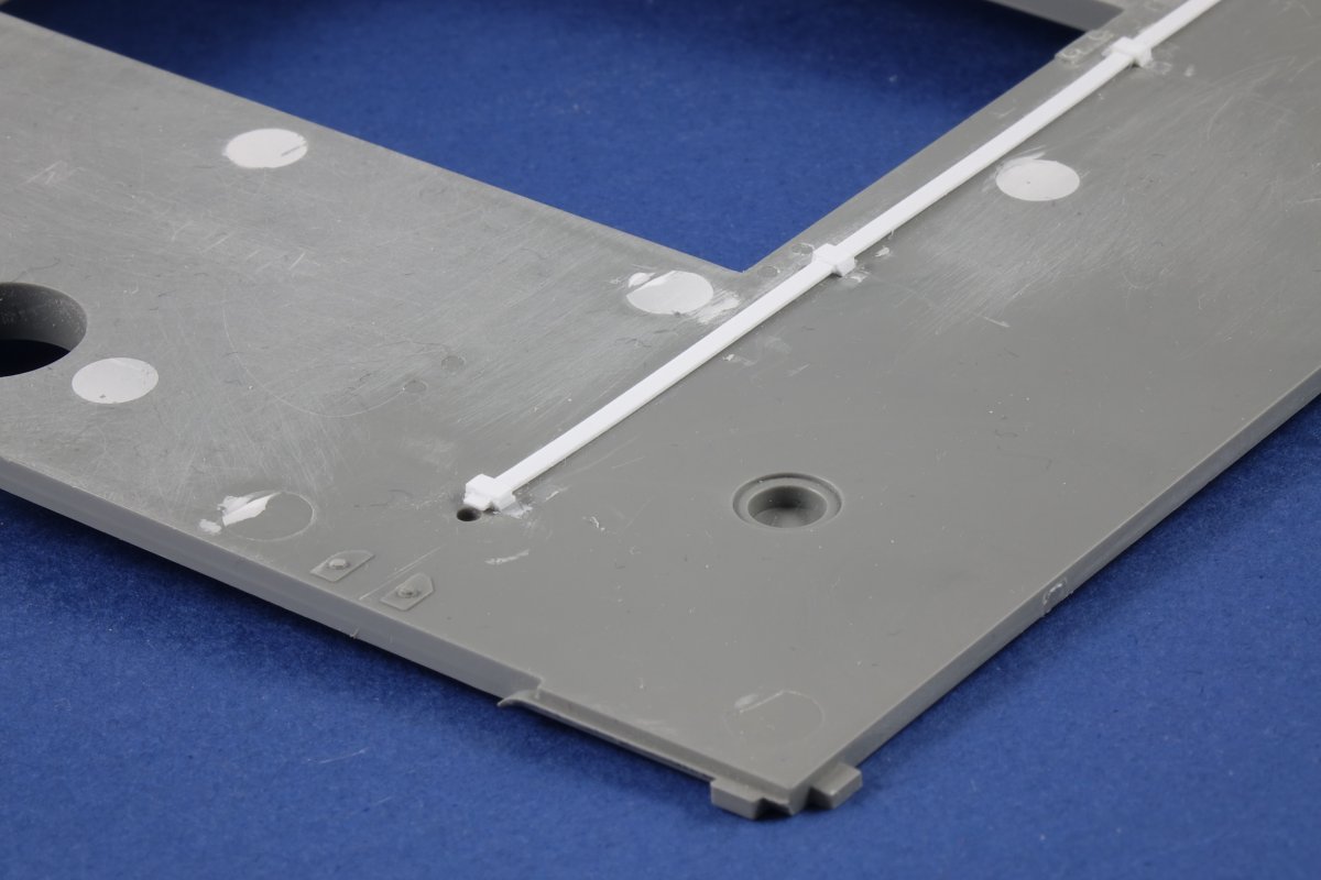 Now I’m back, I’ve been focusing on the underside of the roof. There is still a bit more detail to add but it makes the roof a lot busier than the plain kit part. The pieces across the panel are cable ducts made from Evergreen profile.