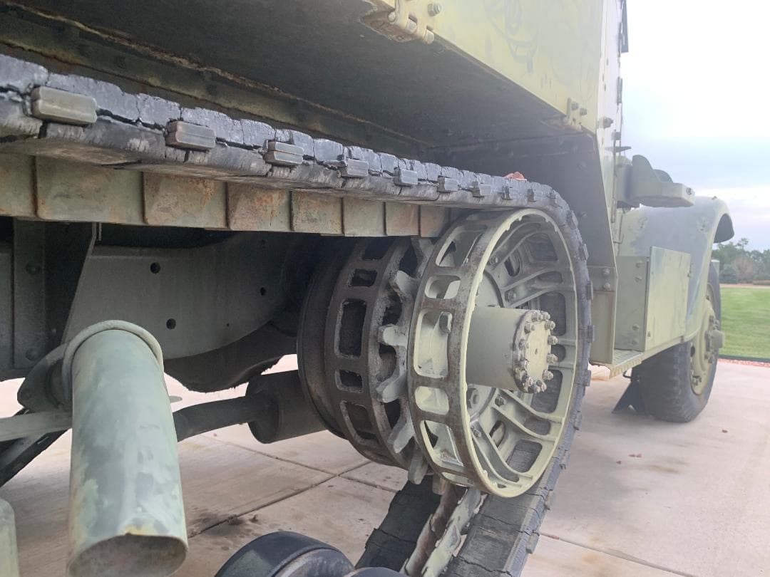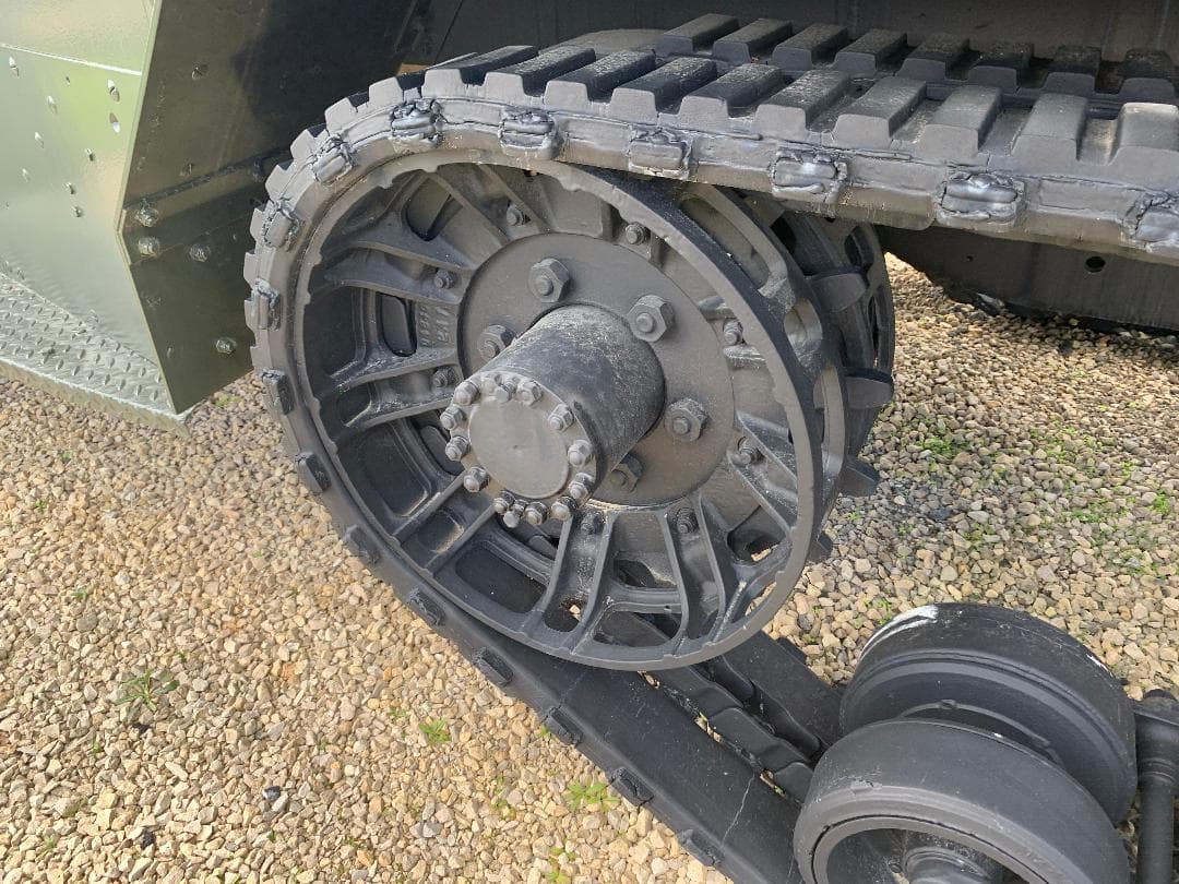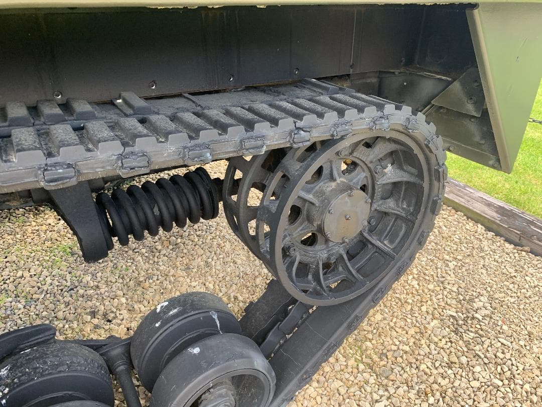 As an interesting aside, some of these halftracks have a horizontal tension spring for each idler wheel. In some photos of test vehicles, these tension springs look glossy black!