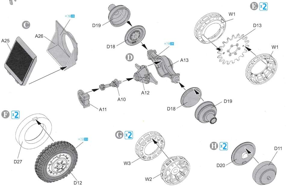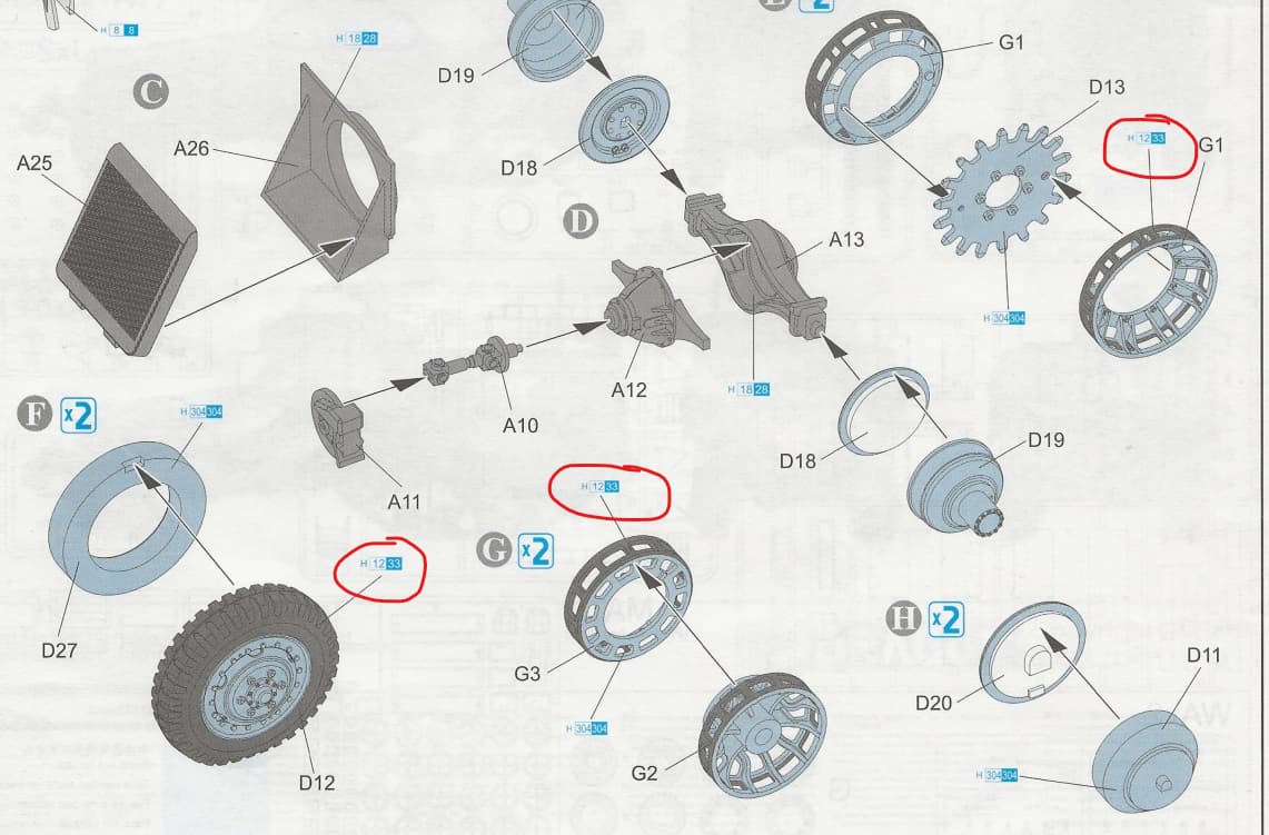 The part designations also follow the same pattern, the black wheels are G-parts (G1, G2 & G3) and the non-black are W-parts (W1, W2 & W3)