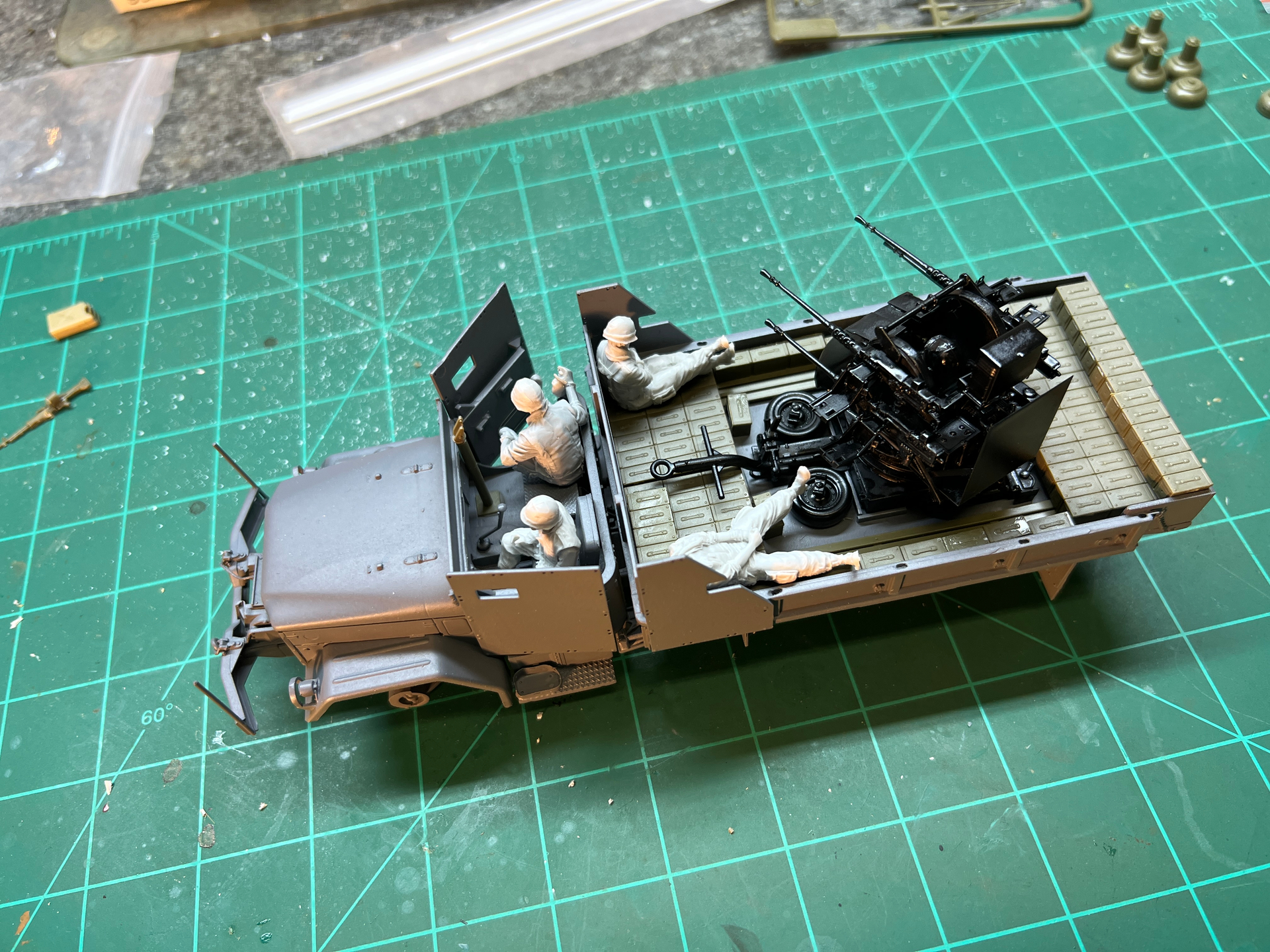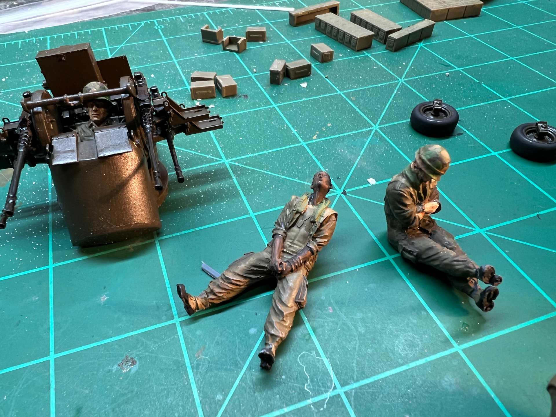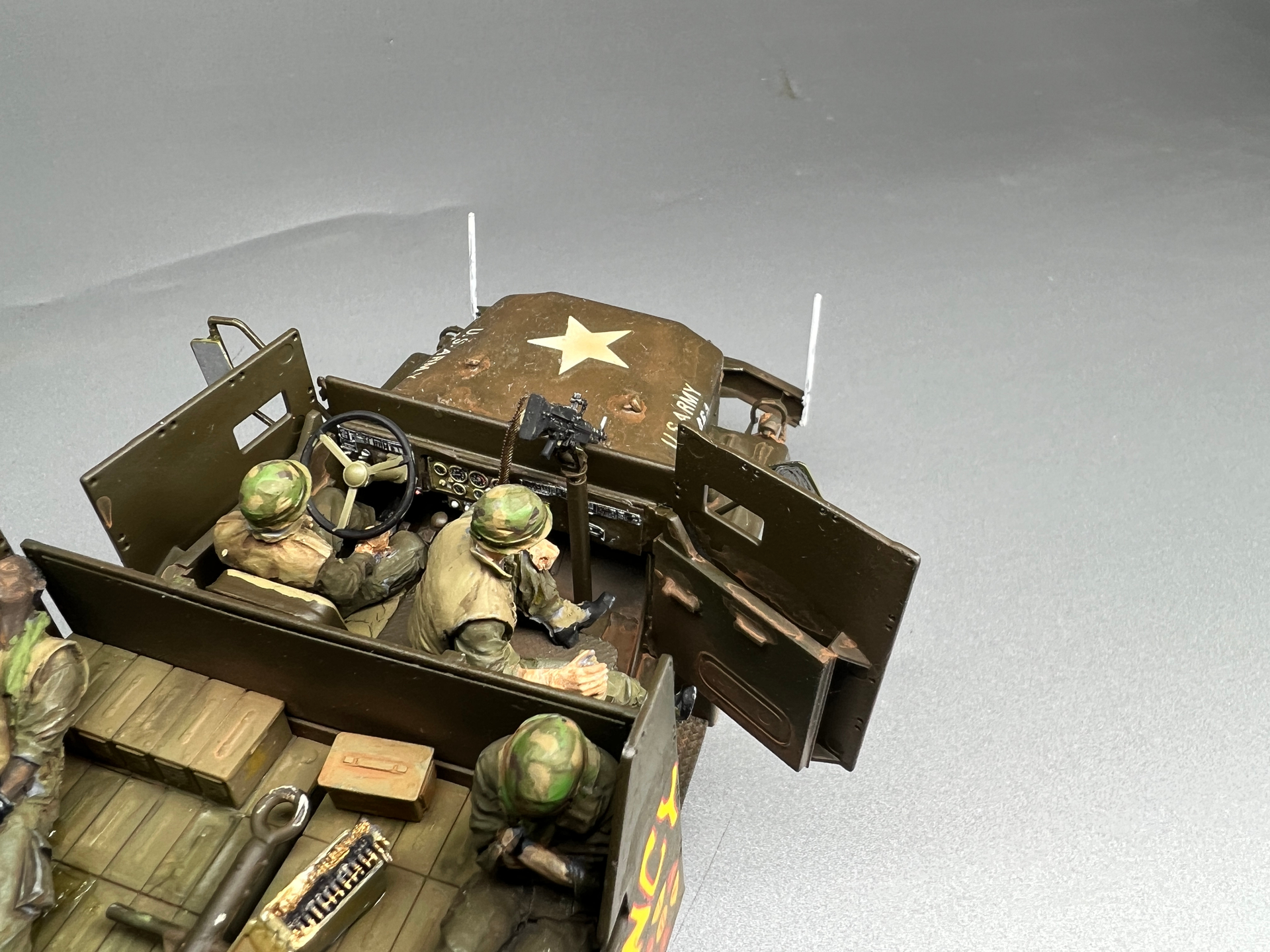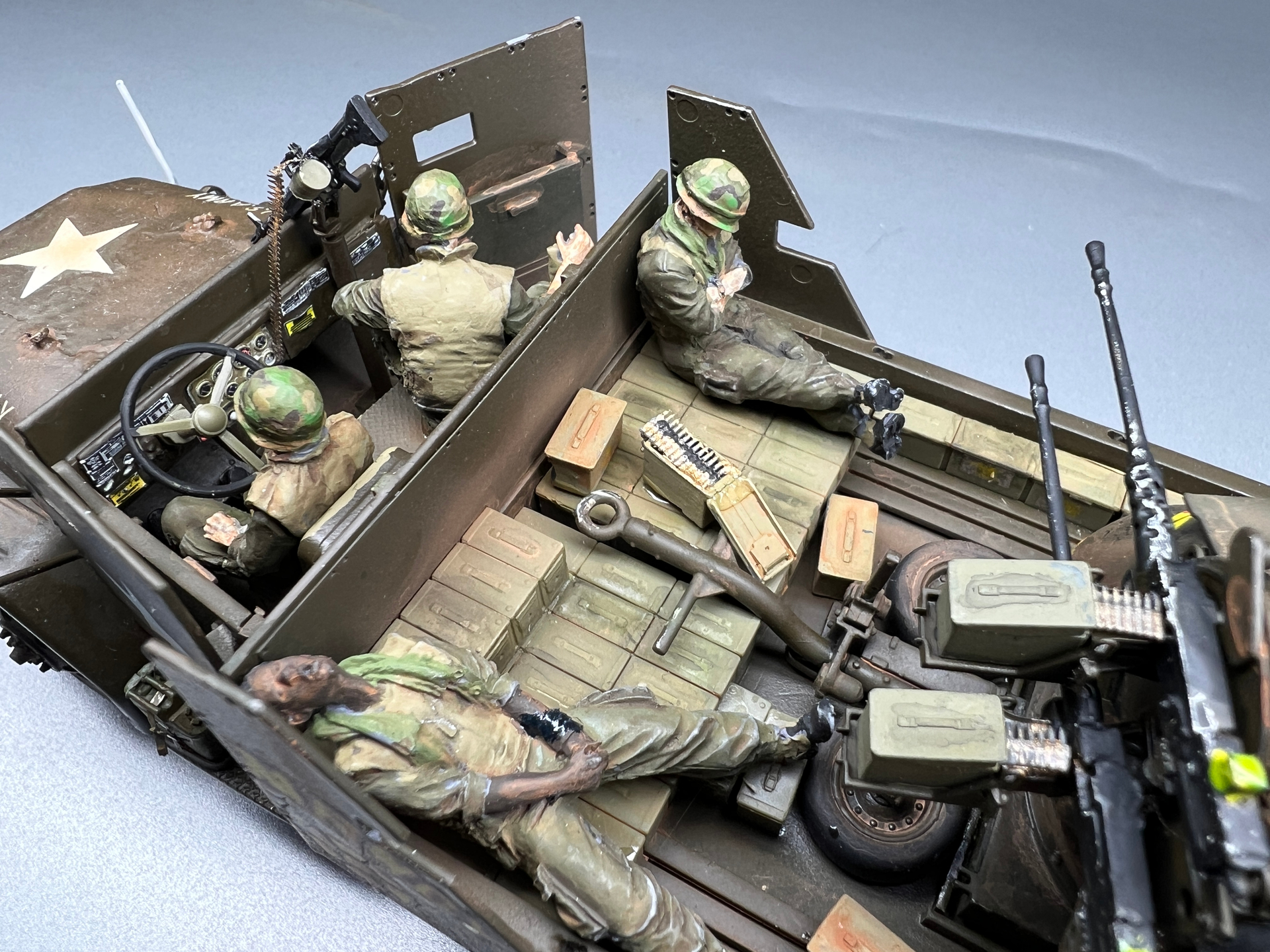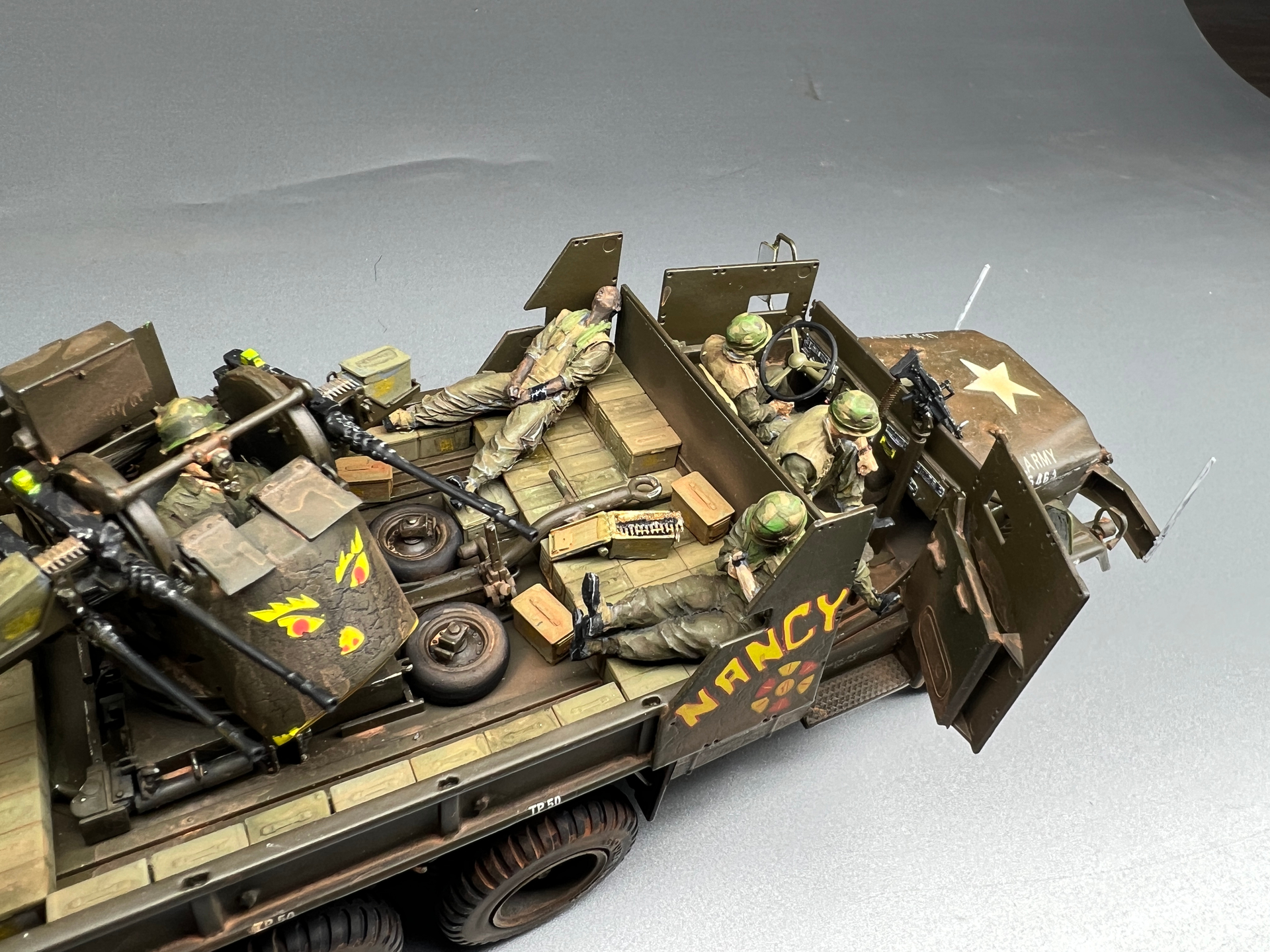 They are from Paracel “The Tourist” set. I have used a couple of those sets to fill out several of my previous builds and these were some leftovers. I changed around a few of the heads and changed the front passenger out from holding a rifle to holding a canteen. Plus I shaved off all the extra gear from them like ammo pouches and canteens so that they just had on their flak jackets like pictures of the real truck and crew.