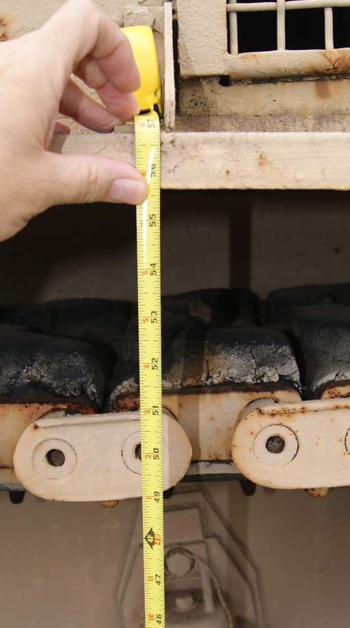 Tracks are well worn rubber chevron, approximately 2-3/4 to 3 inches thick, 23 inches wide, so T84 series.