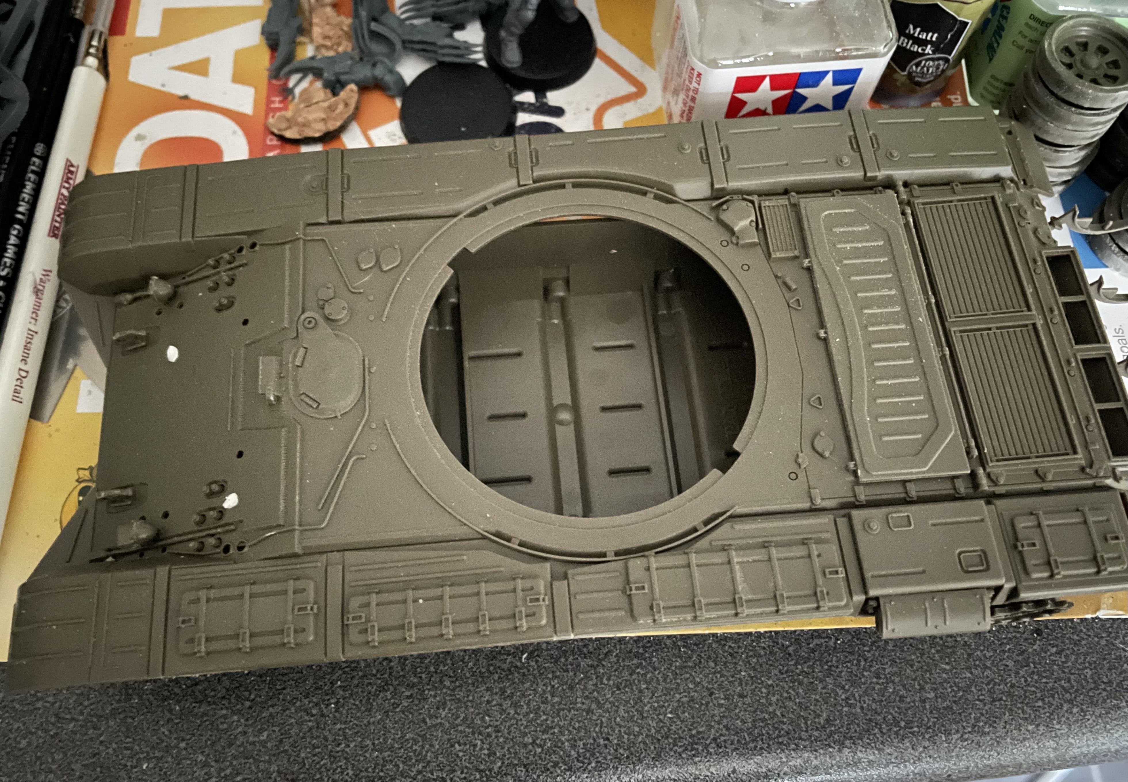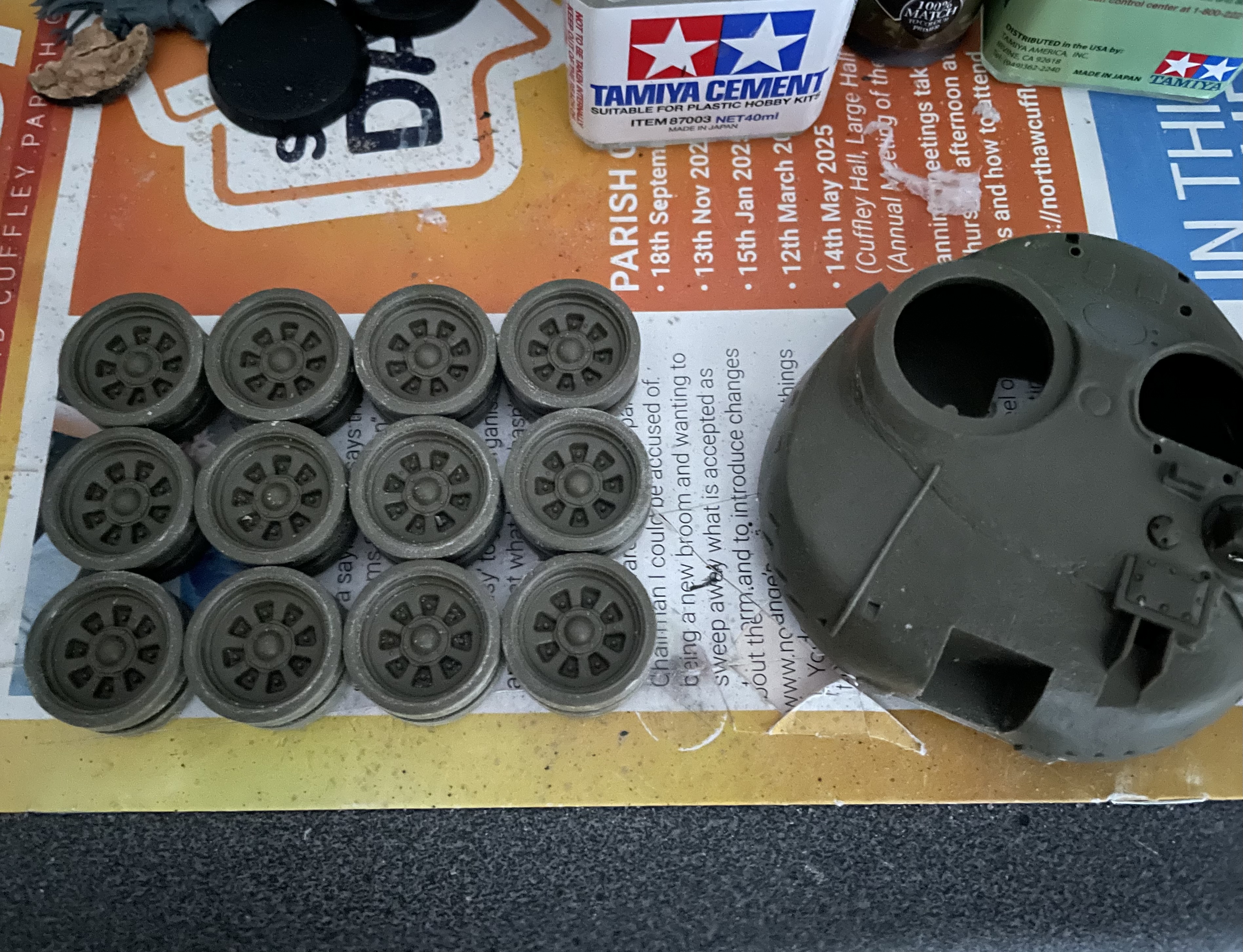 Progress today, hull mostly done with just the convoy/position lights and light guards to do and the splash guard at the front but two holes for the tow rope needed filling first as the kit tow rope will not be used. Rear and engine deck awaiting the Eduard set. Turret top and bottom glued together and filler added around the joint, wheels assembled all waiting for a date with primer and the spray booth.