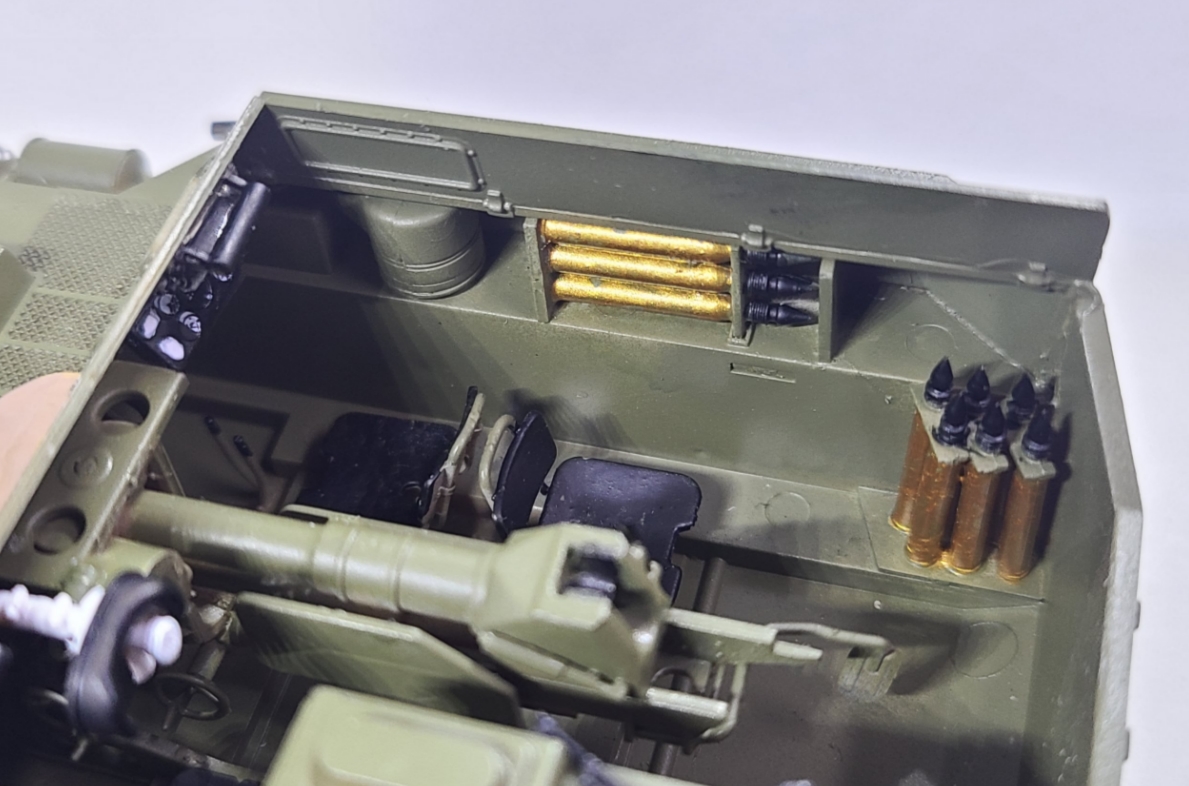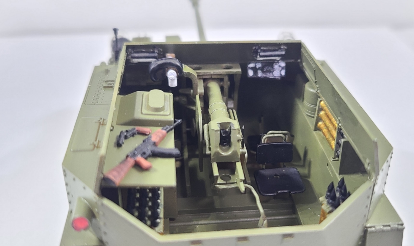 Cons. lack of engine and manual gear shift box, lacks crew compartment interior detail. For example, The SGM machine gun was stored in the crew compartment, intended for use by the crew in combat after dismounting from the tank.