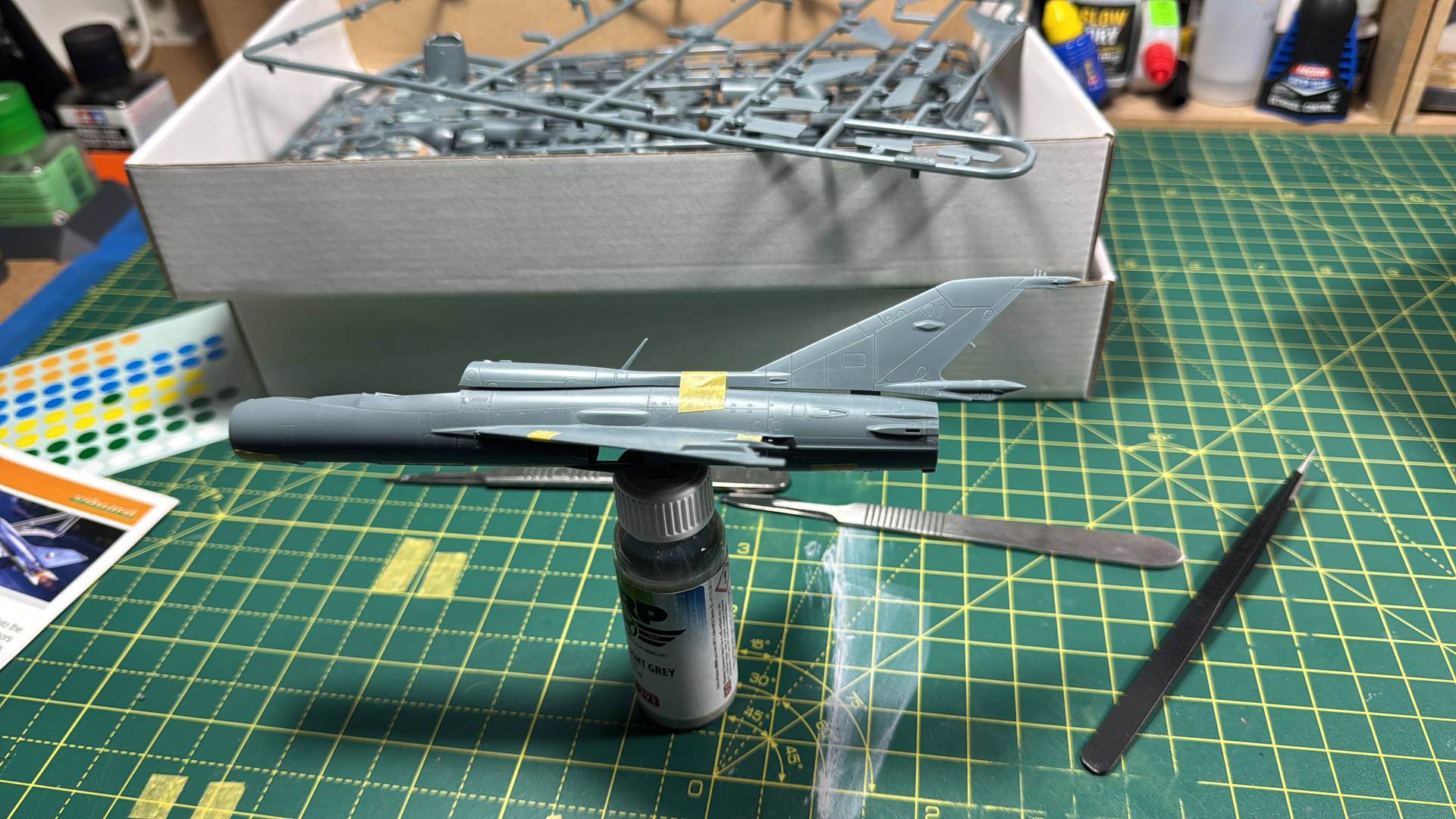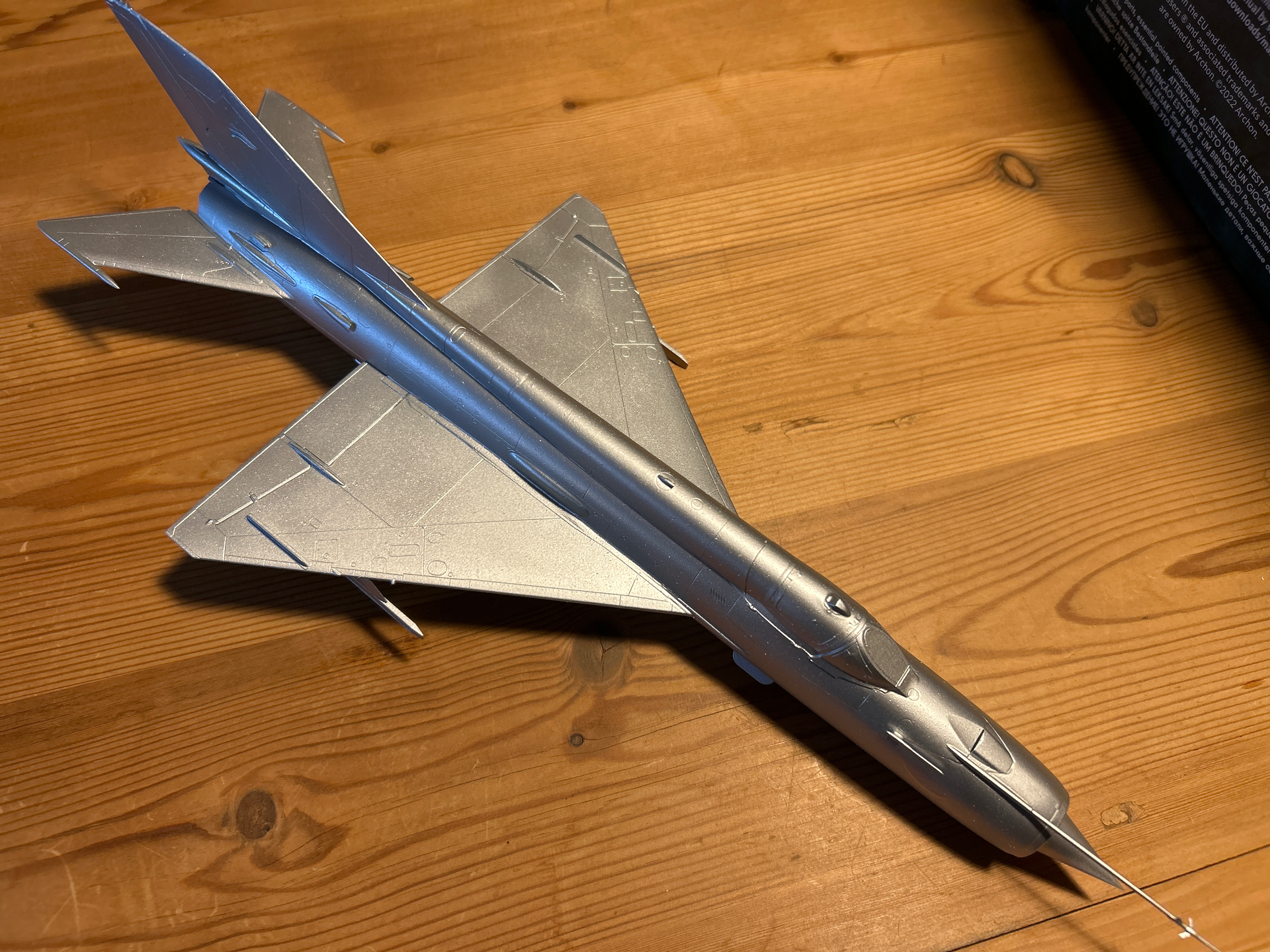 My Mig-21 has the base coat on - an aluminum coat. Next is some detail painting before the markings are going on.