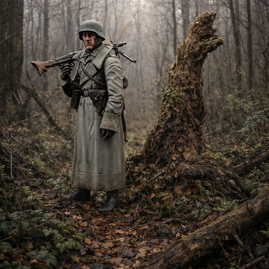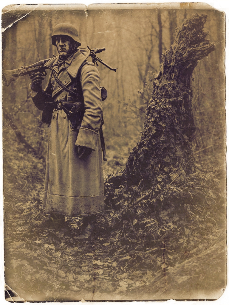 Really excellent effect! Try converting it to a B/W image, add some fake “scratches”, etc., and add a white border similar to photo processing of that period, and you will have what looks like an authentic photo. ![]()