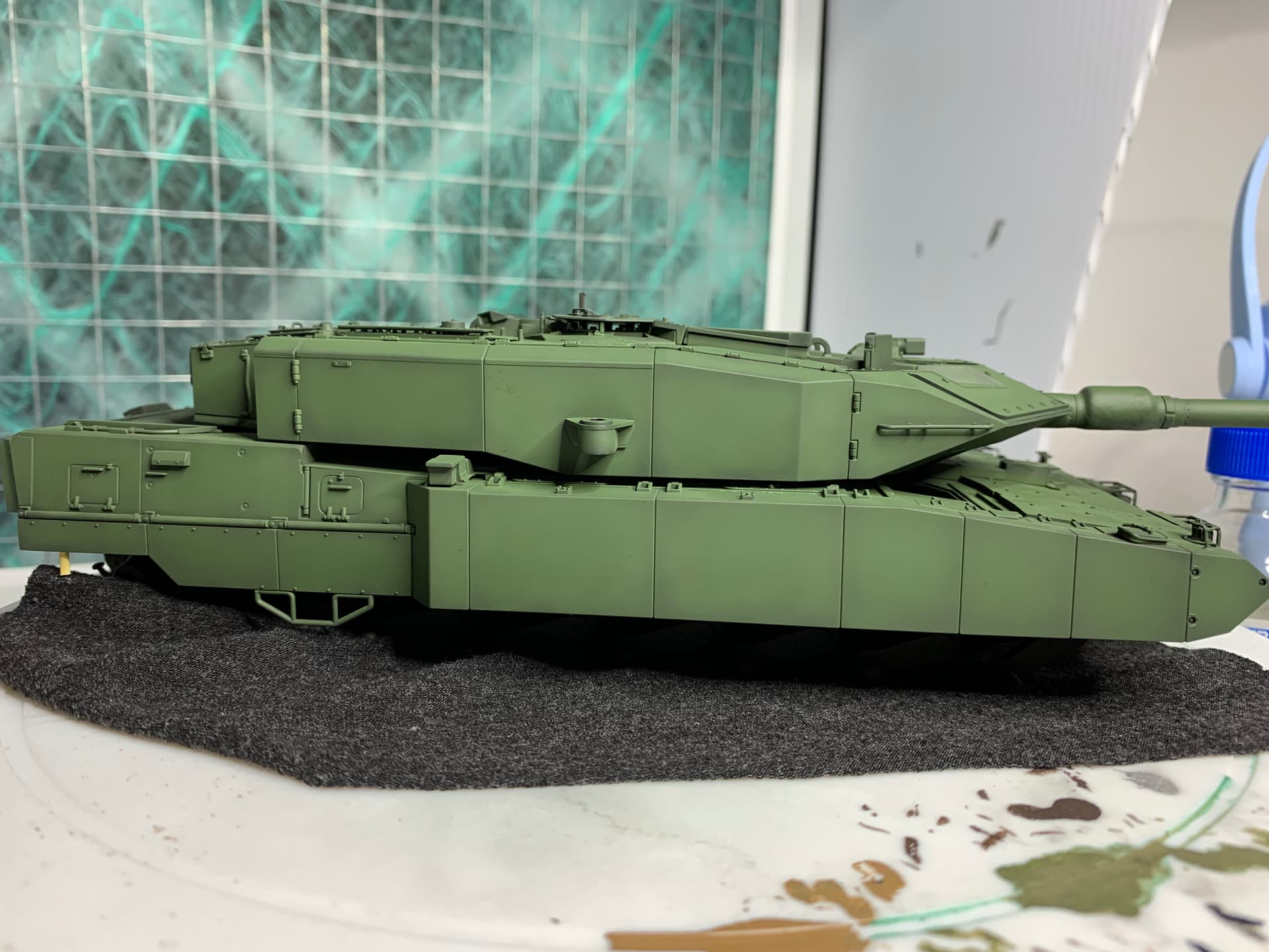 Ok, back to the model. Went with the AK nato green, with a little Tamiya x22 clear. It looks lighter in pics than it actually is. Next job is mixing up a lighter shade with a little Tamiya yellow-green added for highlights. Can’t believe I spent almost two hours spraying this base coat, it’s a big old cat!