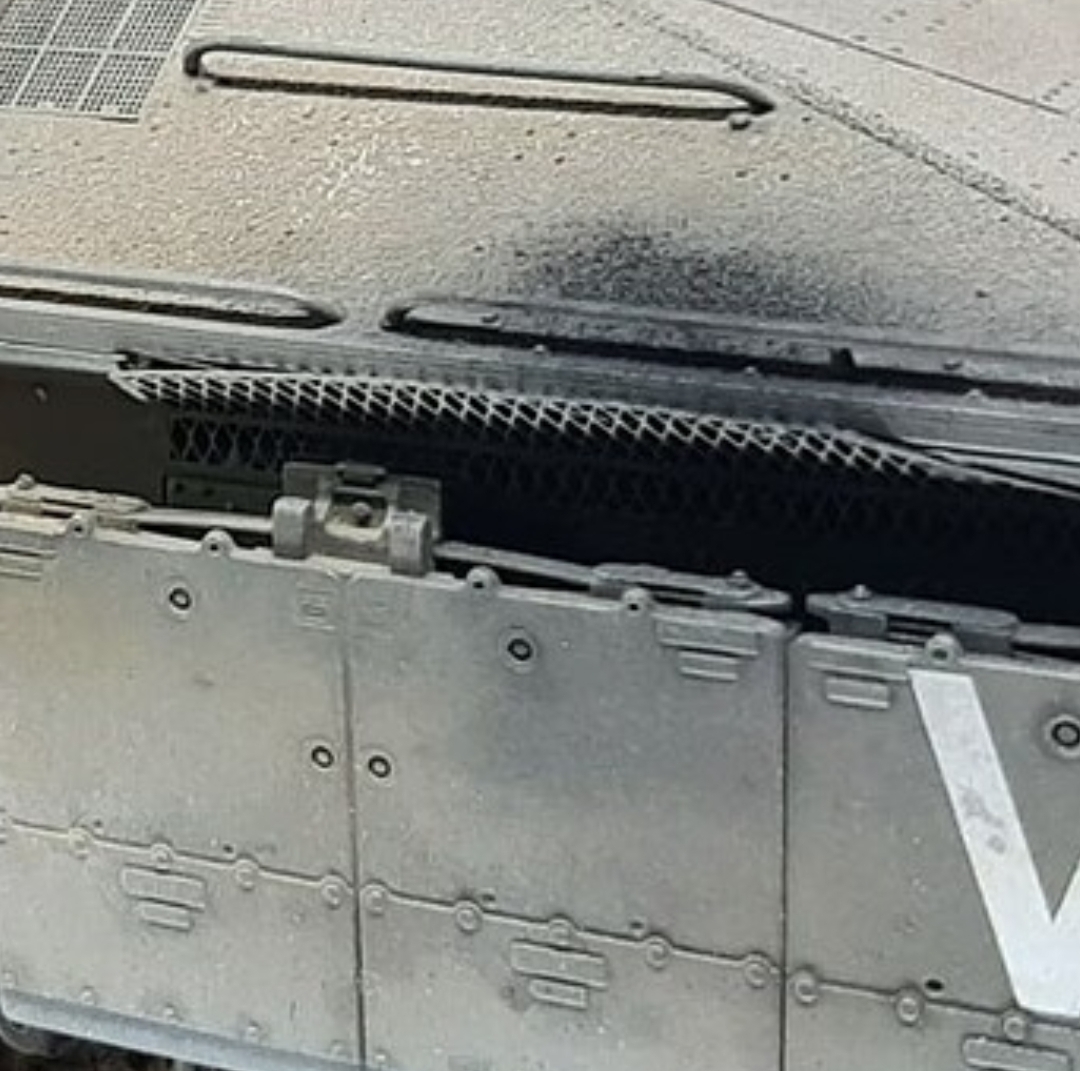 No, this vehicle has not been in battle, it is however, a common artifact of normal wear and tear, widely observed (apparently) on Namers - the top angled top run of the grill is exposed to collision with obstacles more often than on Merkavas (for some reason), where the exhaust cover grill is flat - whereby the 15mm bolts that attach the grill, four per run, become damaged or detached and the grill becomes bent.