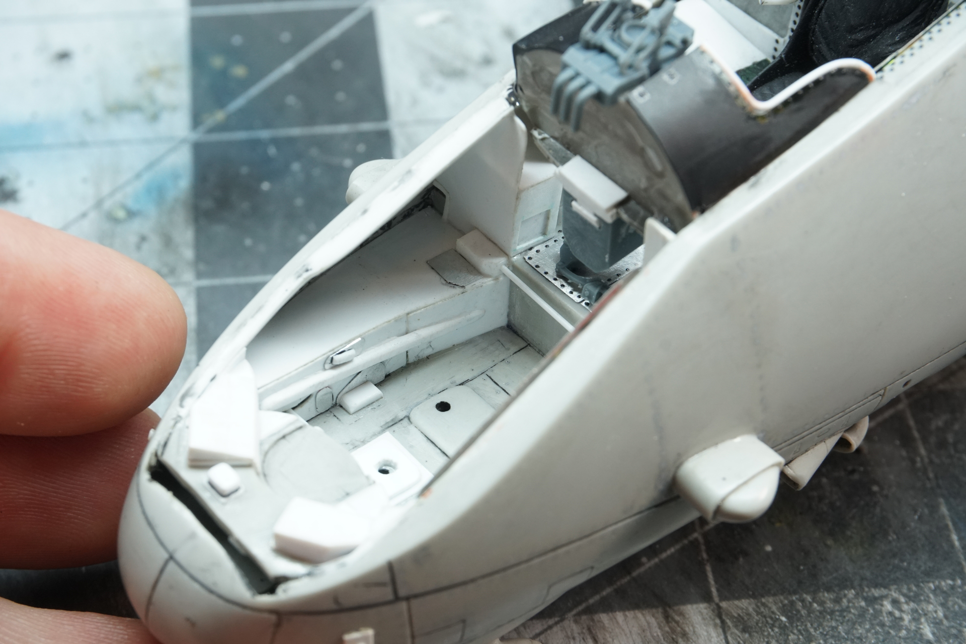I have been working to get the cockpit done, and I am almost done with the pilot section! I rebuilt the ‘hallway section’ because the shape of the aftermarket part I crammed in there was a bit wrong and meant for the stock parts, which no longer fit with my modifications. I did a quick and dirty design with styrene and slapped some paint on it because it will not be seen at all, other than the part that connects to the new cockpit shape.
