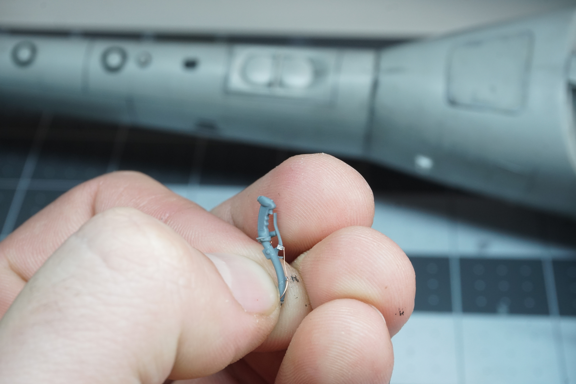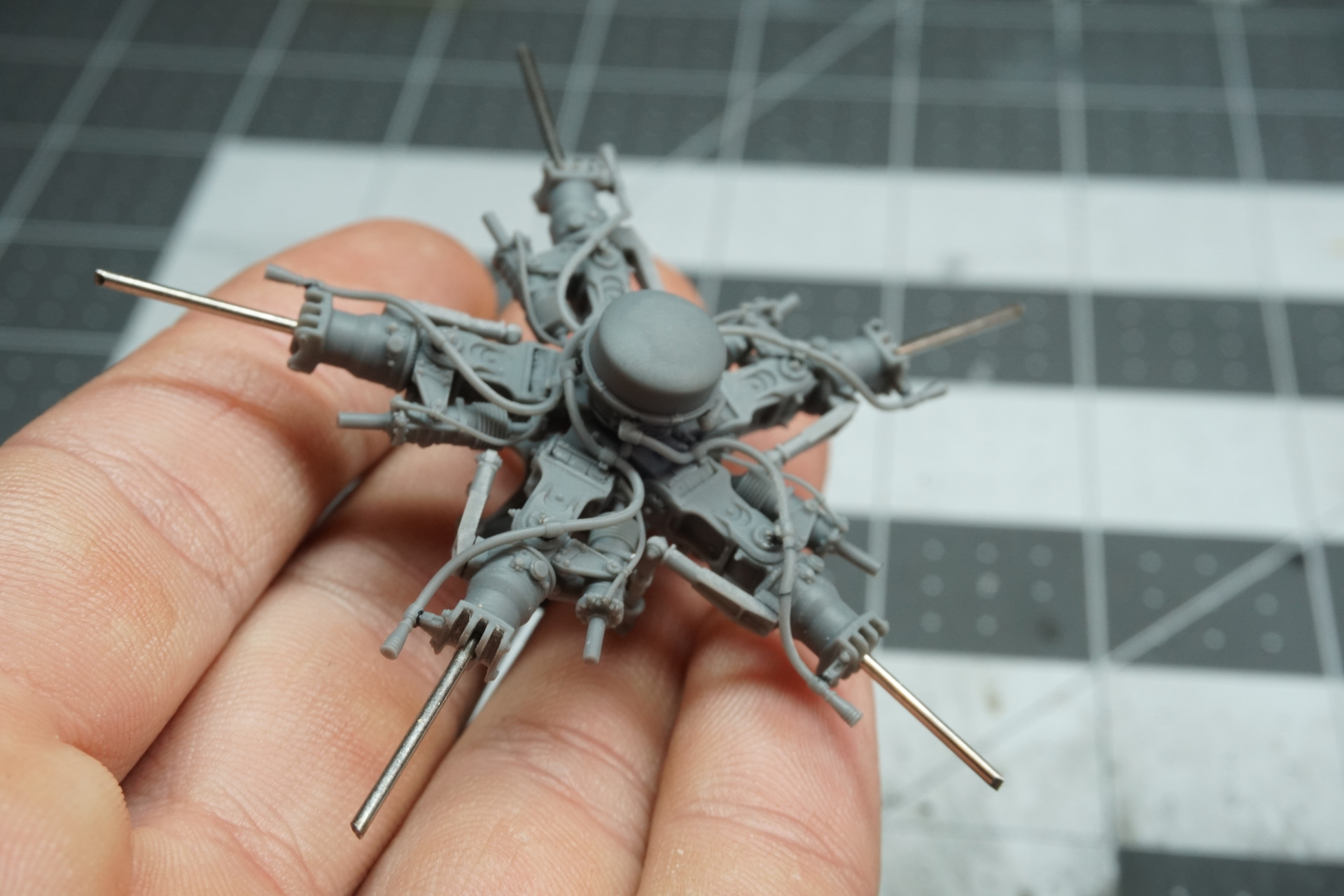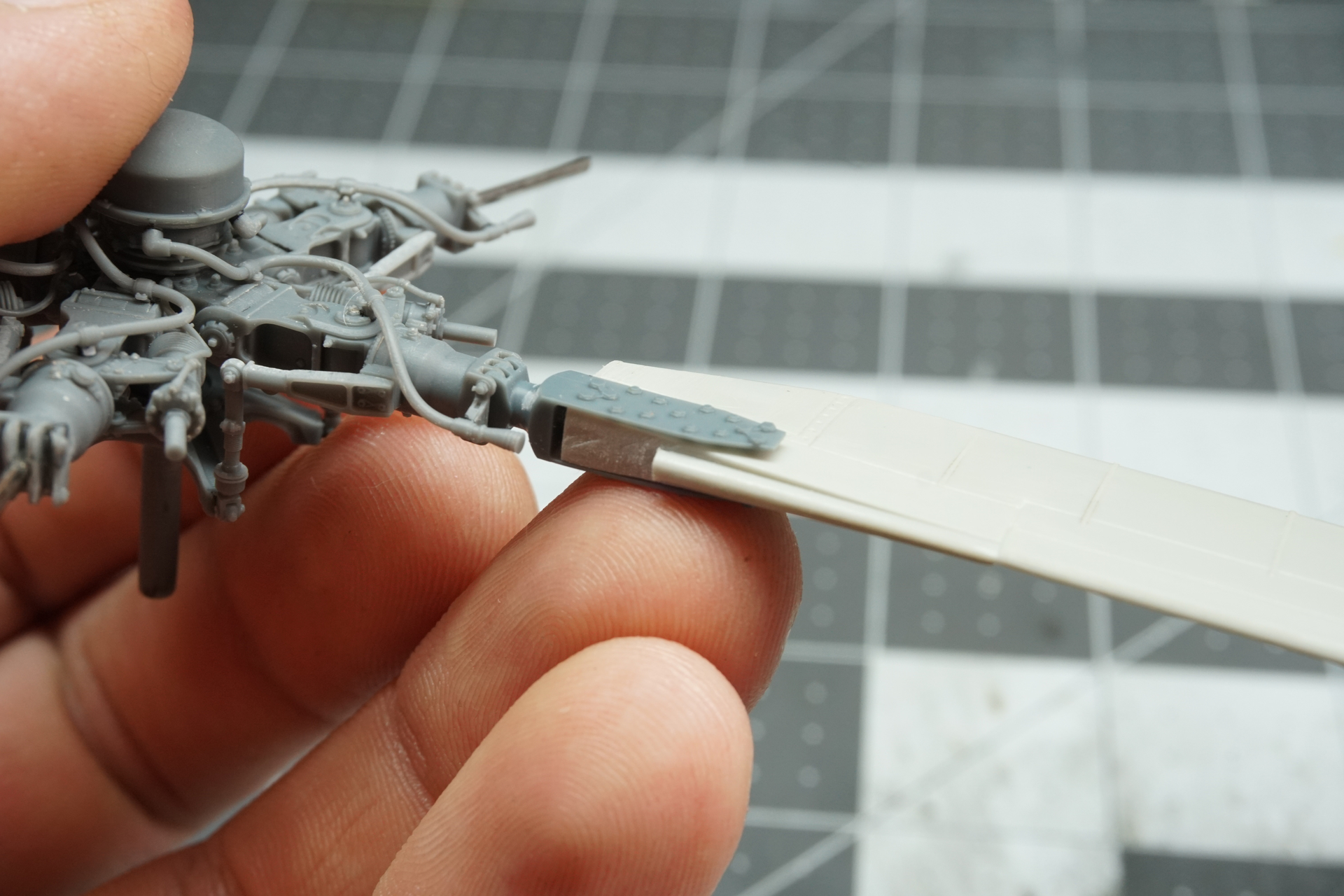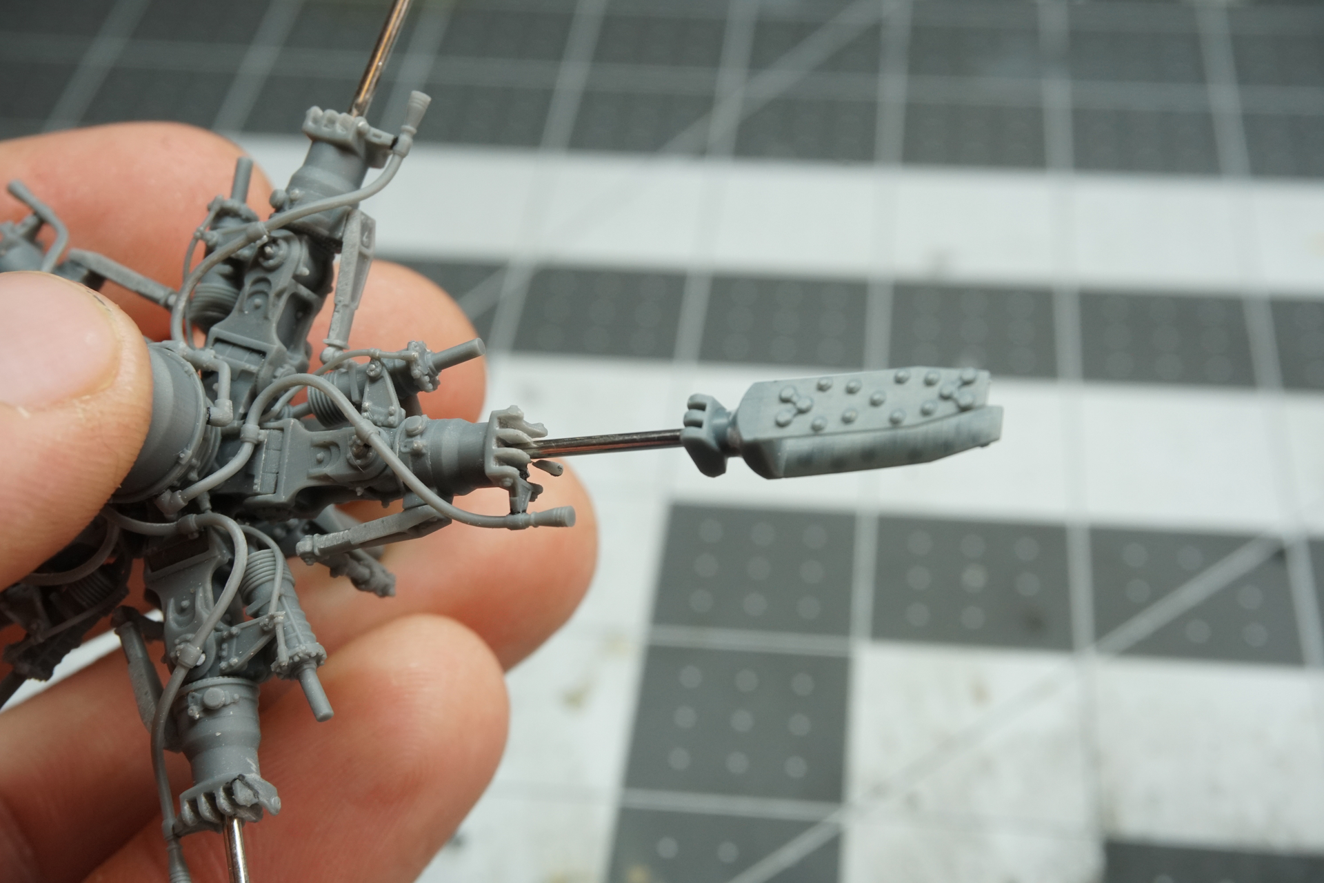 You can probably see that I have cut out the “transmission” because I ended up purchasing the reskit rotor hub. I did this because the reskit one is not only amazing but also contains metal rods. This is important because the span of the rotors prevents me from putting the heli in my glass shelves. With the reskit hub and some modifications, I was able to make the blades removable.