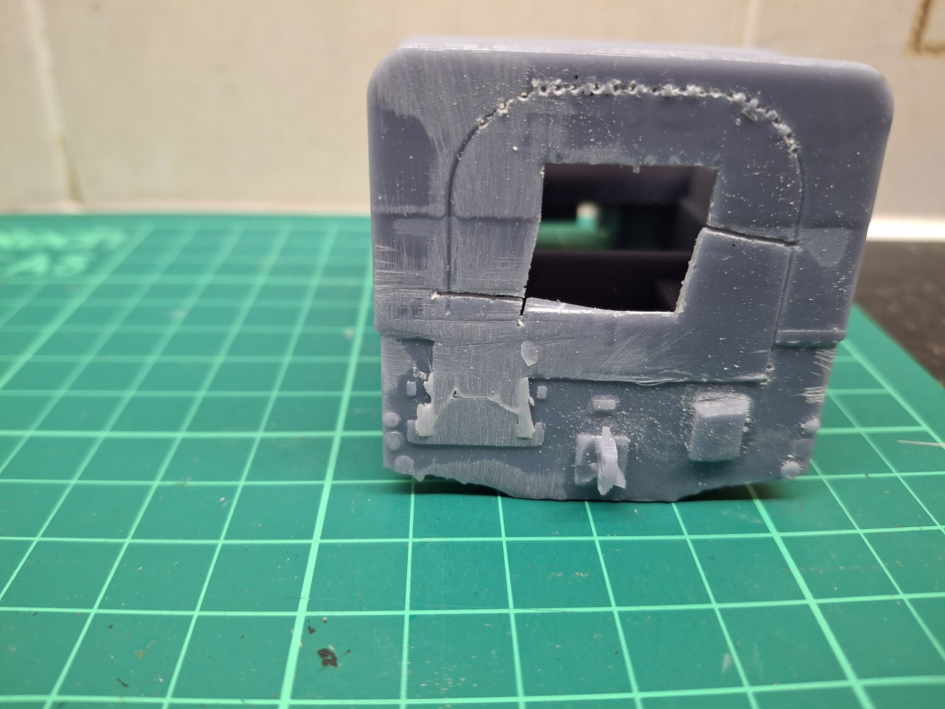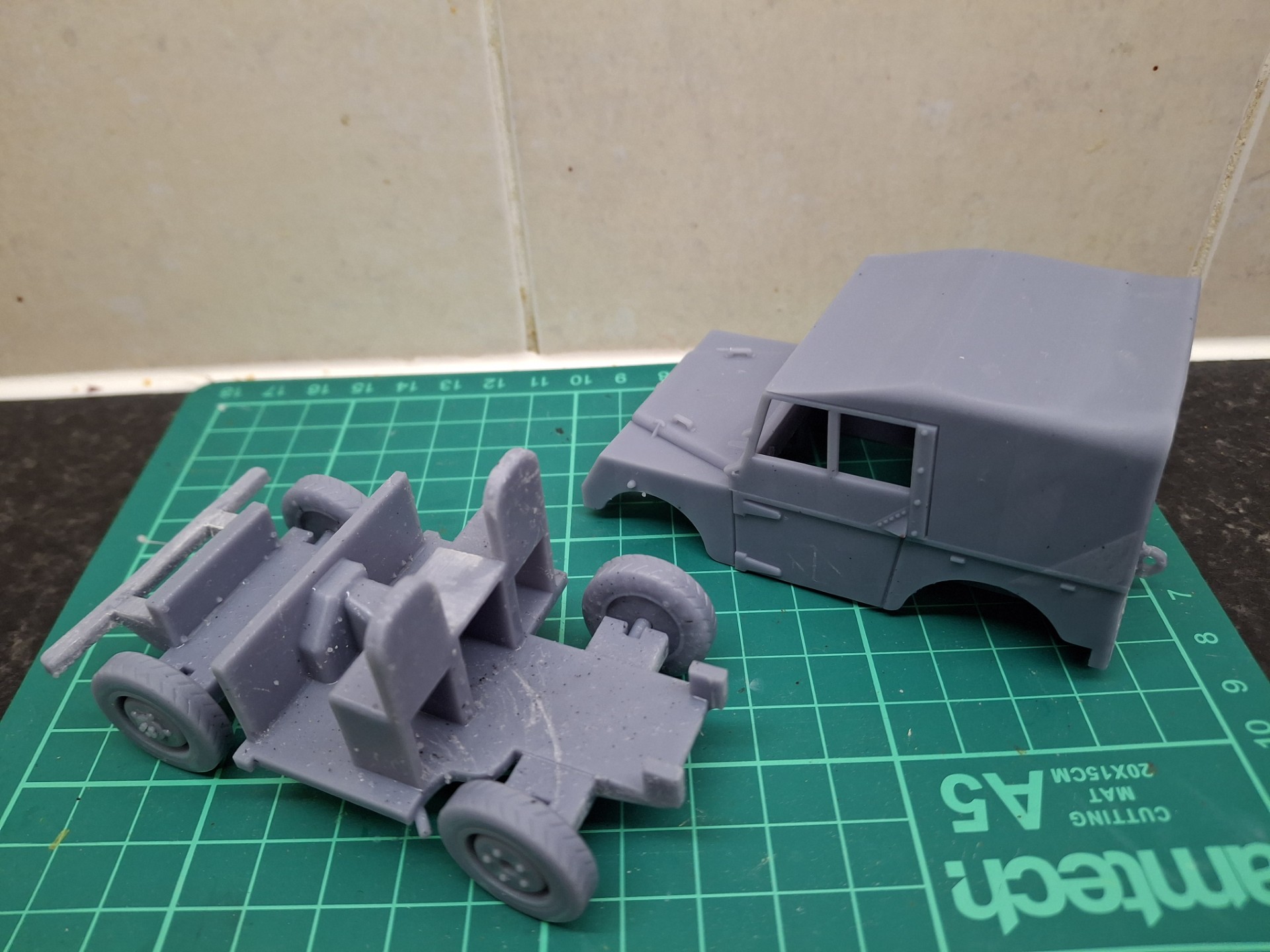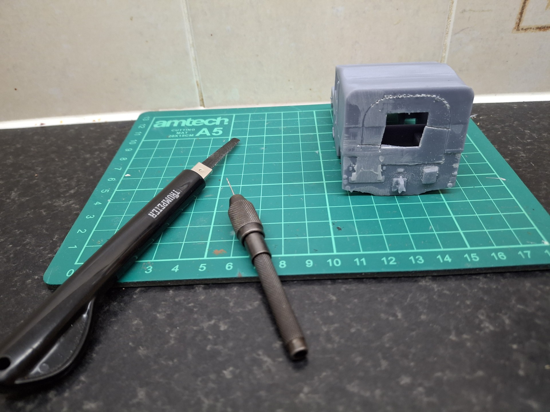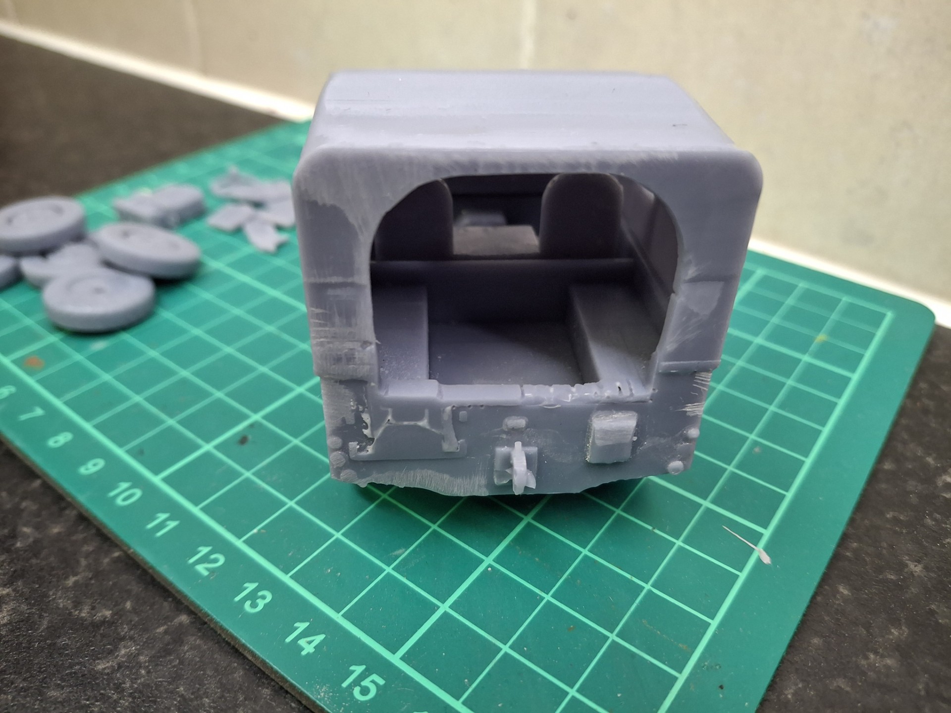 First off, as I say, it’s very simple, coming in two parts which sort of click together. The wheels are separate and that’s about it. All other details are moulded on. It’s going to be tricky to add details to the interior given the way it’s designed; I think it might have been best to saw off the roof, but instead I opted to remove the rear, and that took considerable butchery.