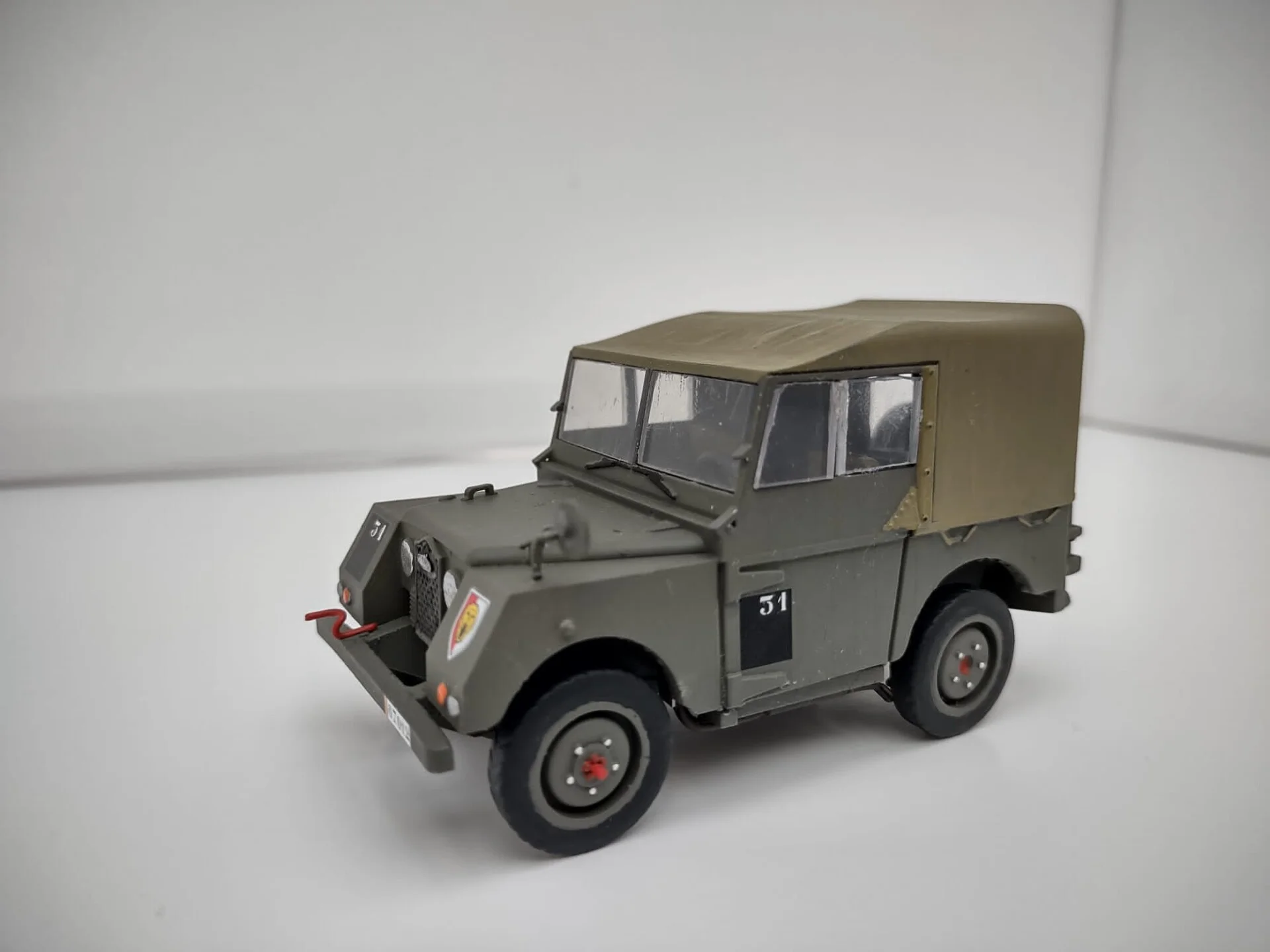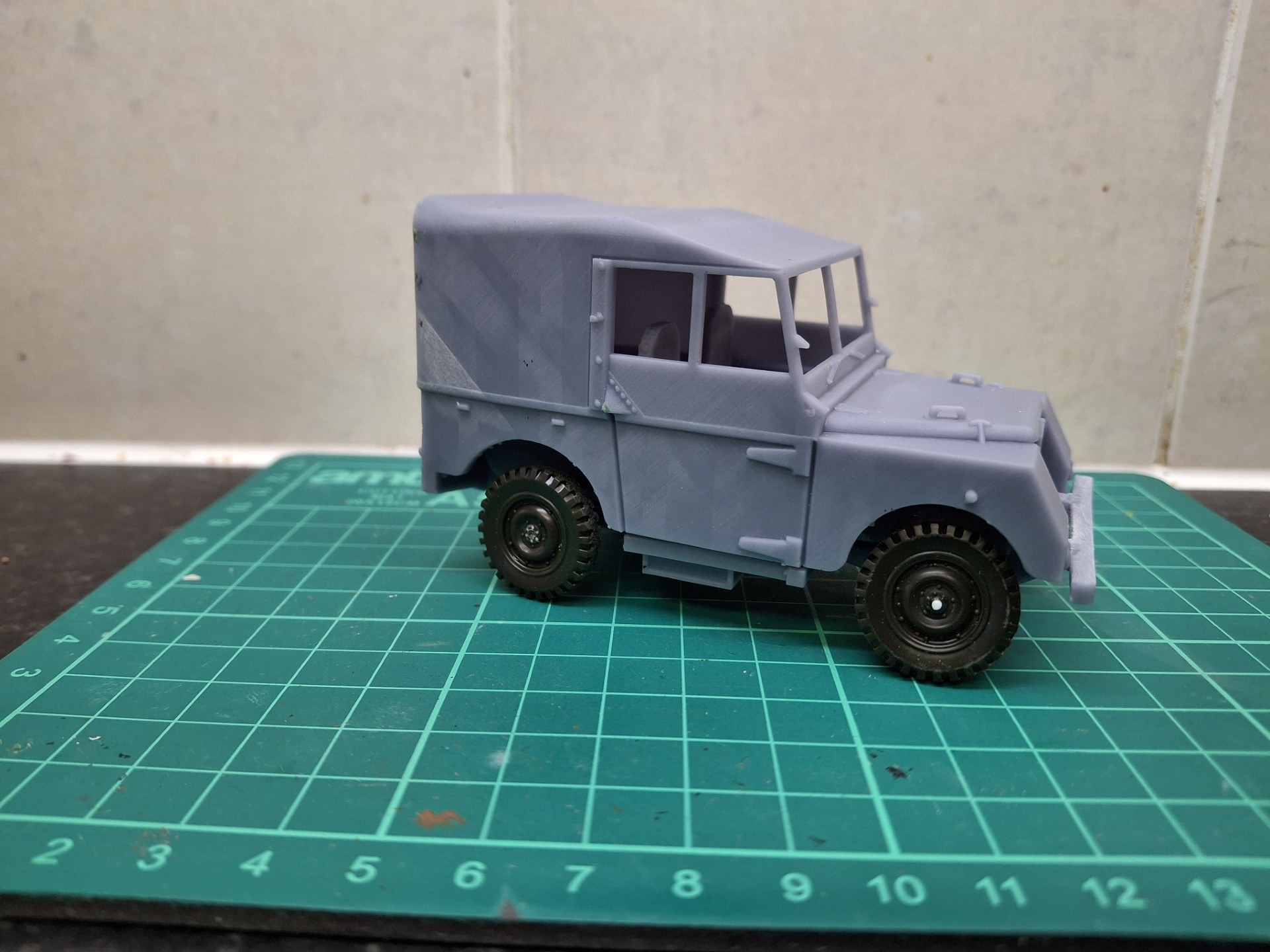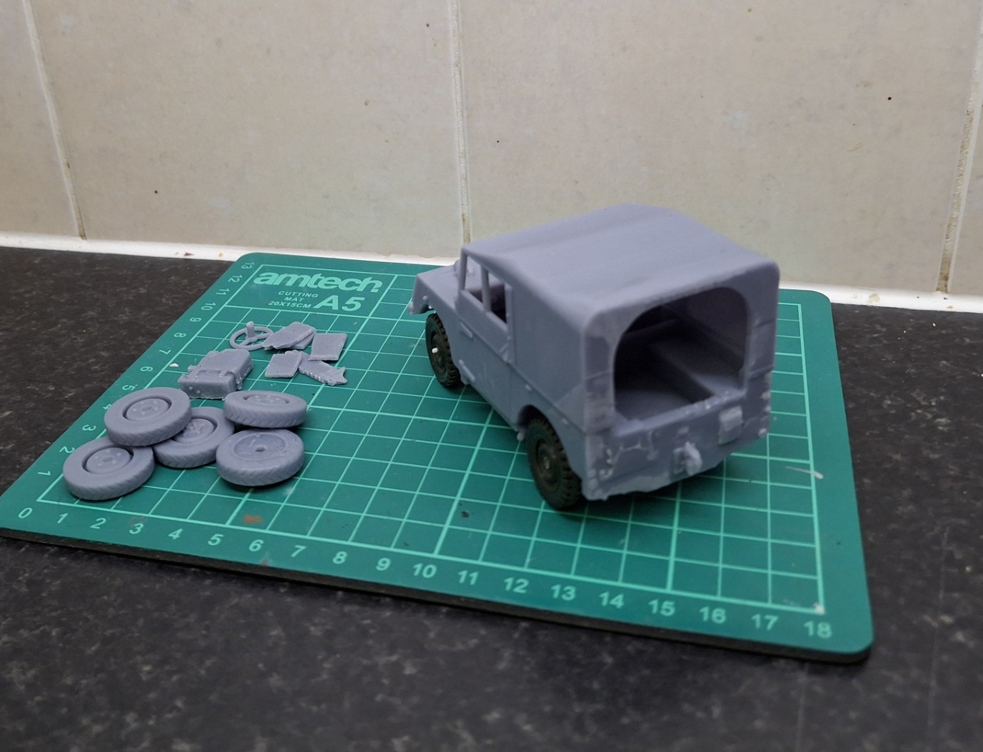 The wheels weren’t really detailed well enough at all, so I thought that some Jeep wheels might do the trick so I acquired an ancient Tamiya version. They needed a few mods and I still haven’ finished, but already, in my view, they look a little better.
