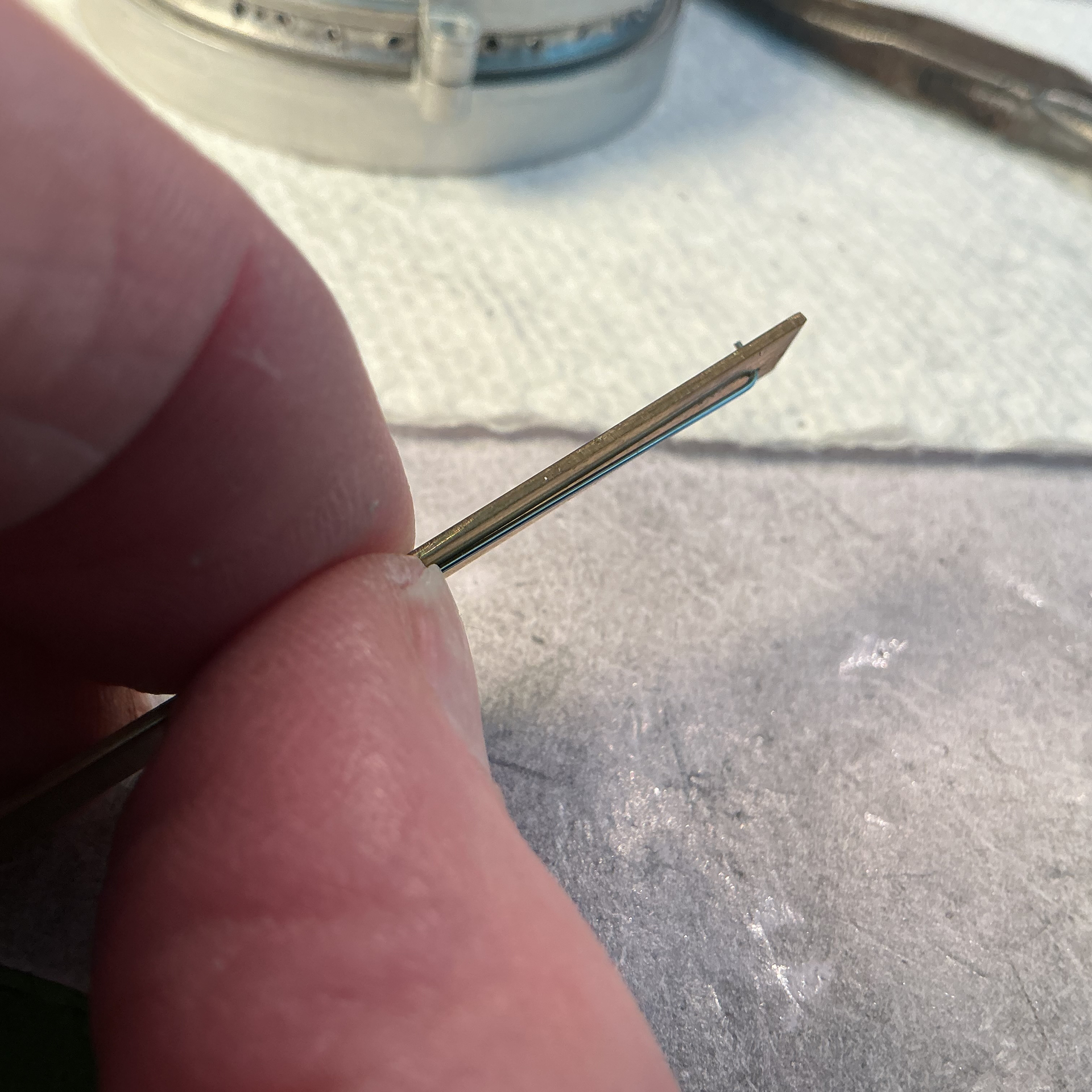 The rim clamped up in the fixture and a pair of spokes with their nipples installed to index the rim with the hub and outer spokes in place for one side of the wheel.