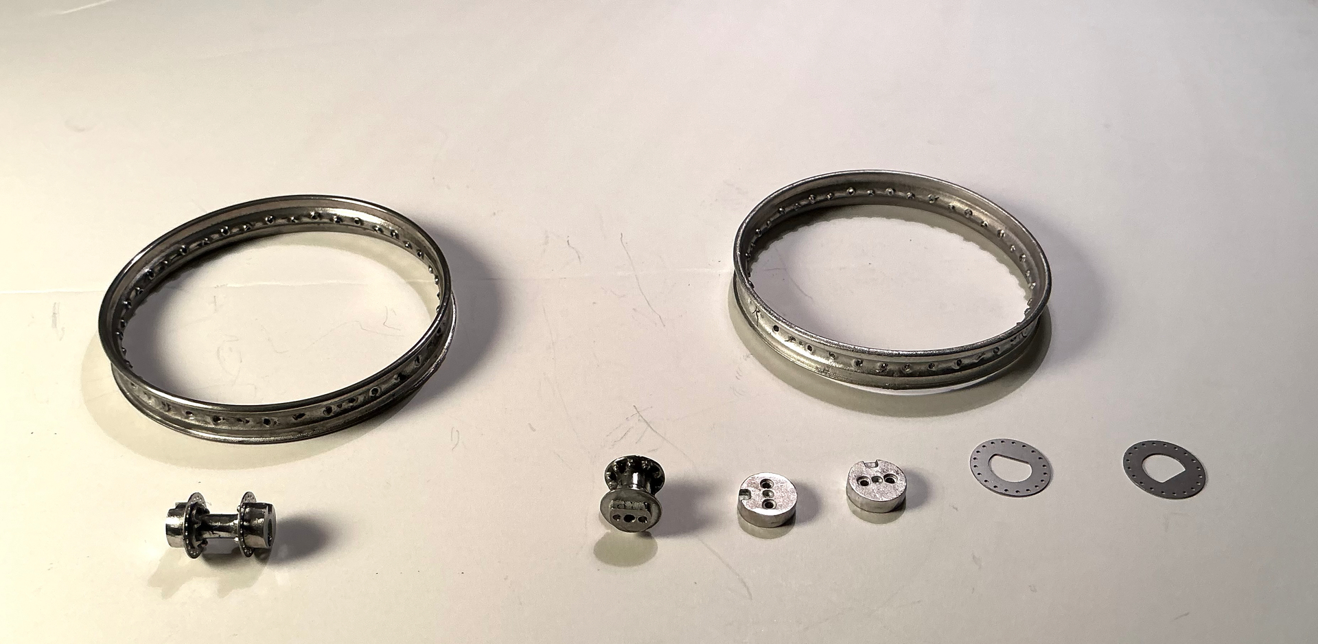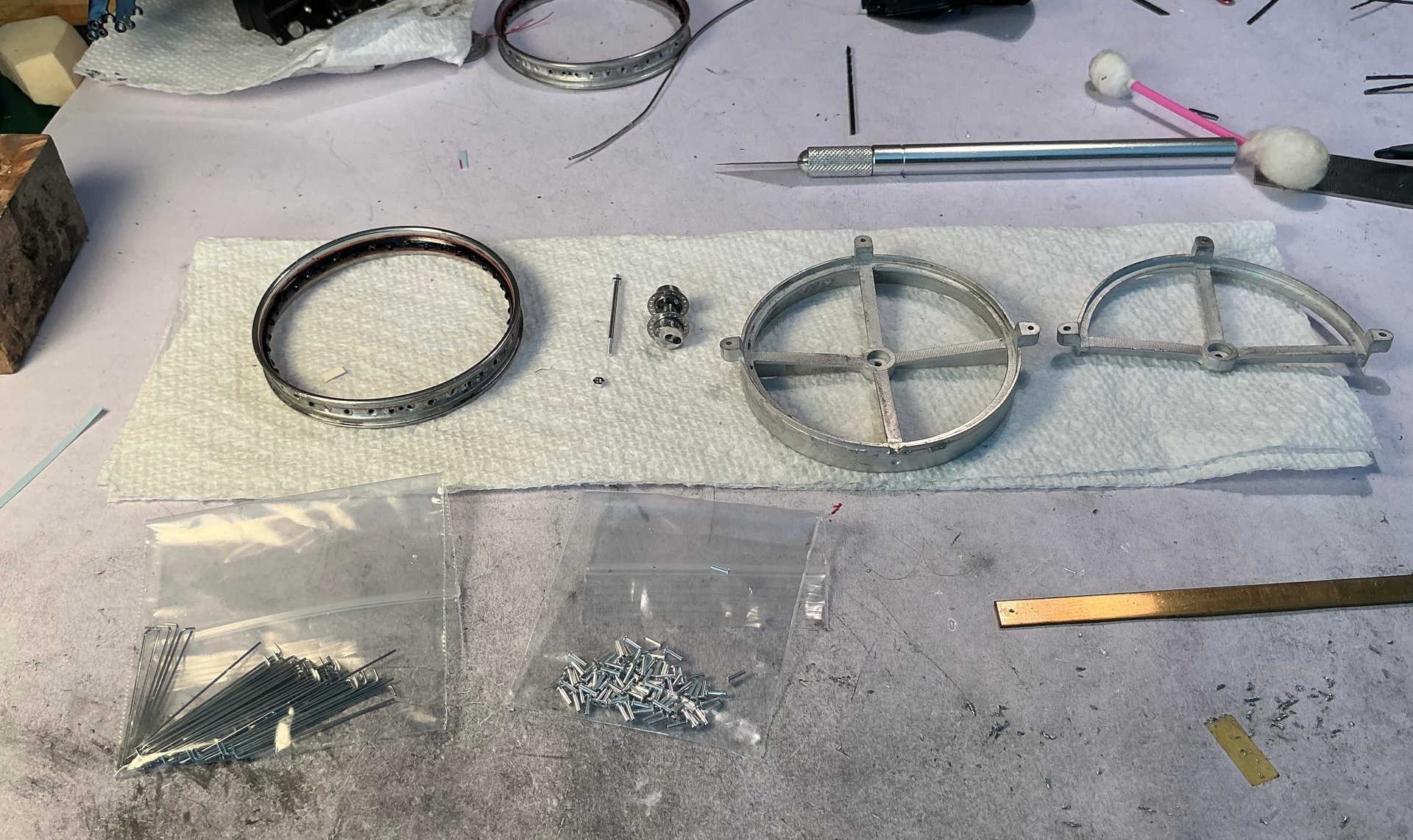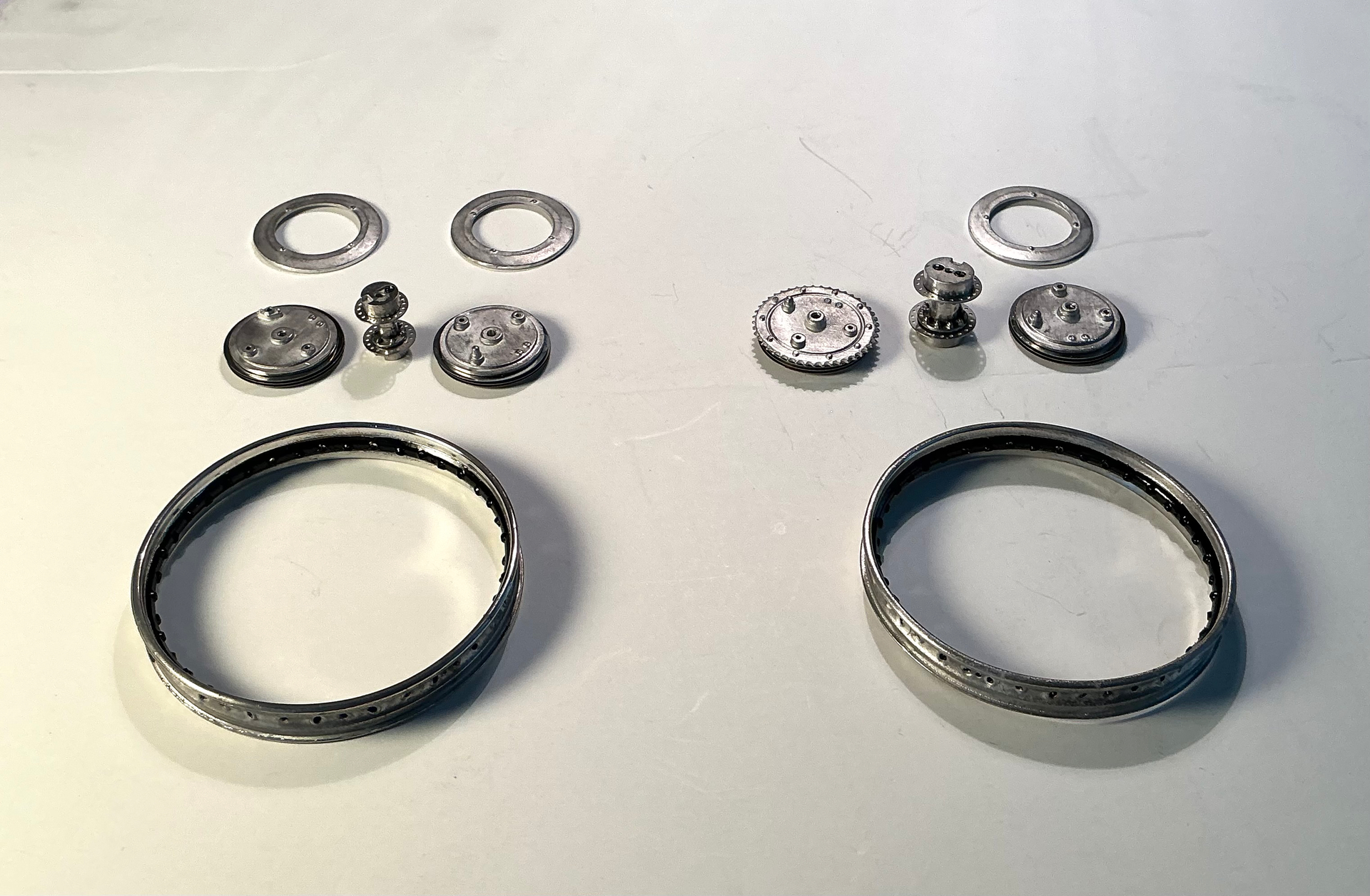 Rims drilled and polished - front hub built and components for rear hub ready for assembly-