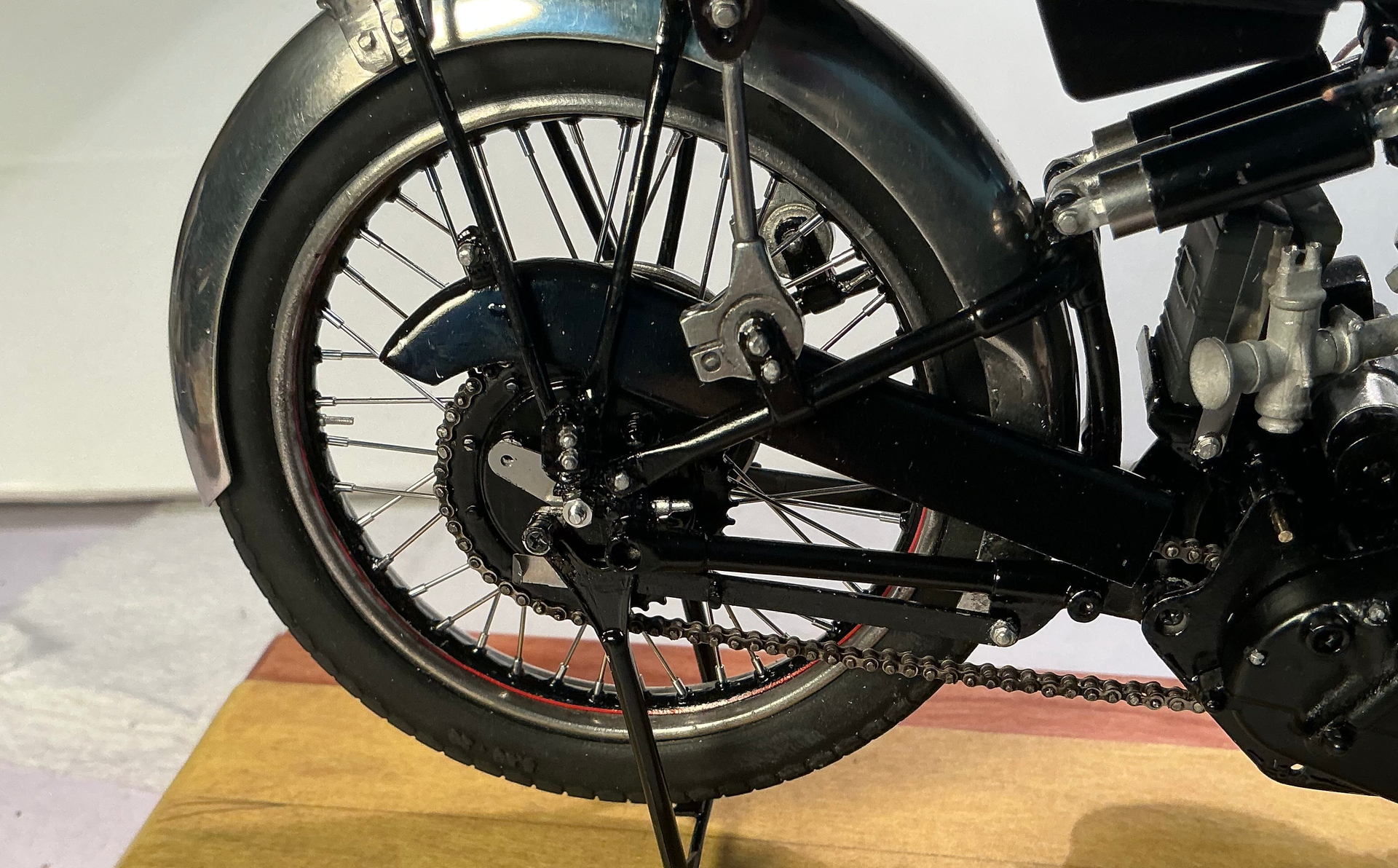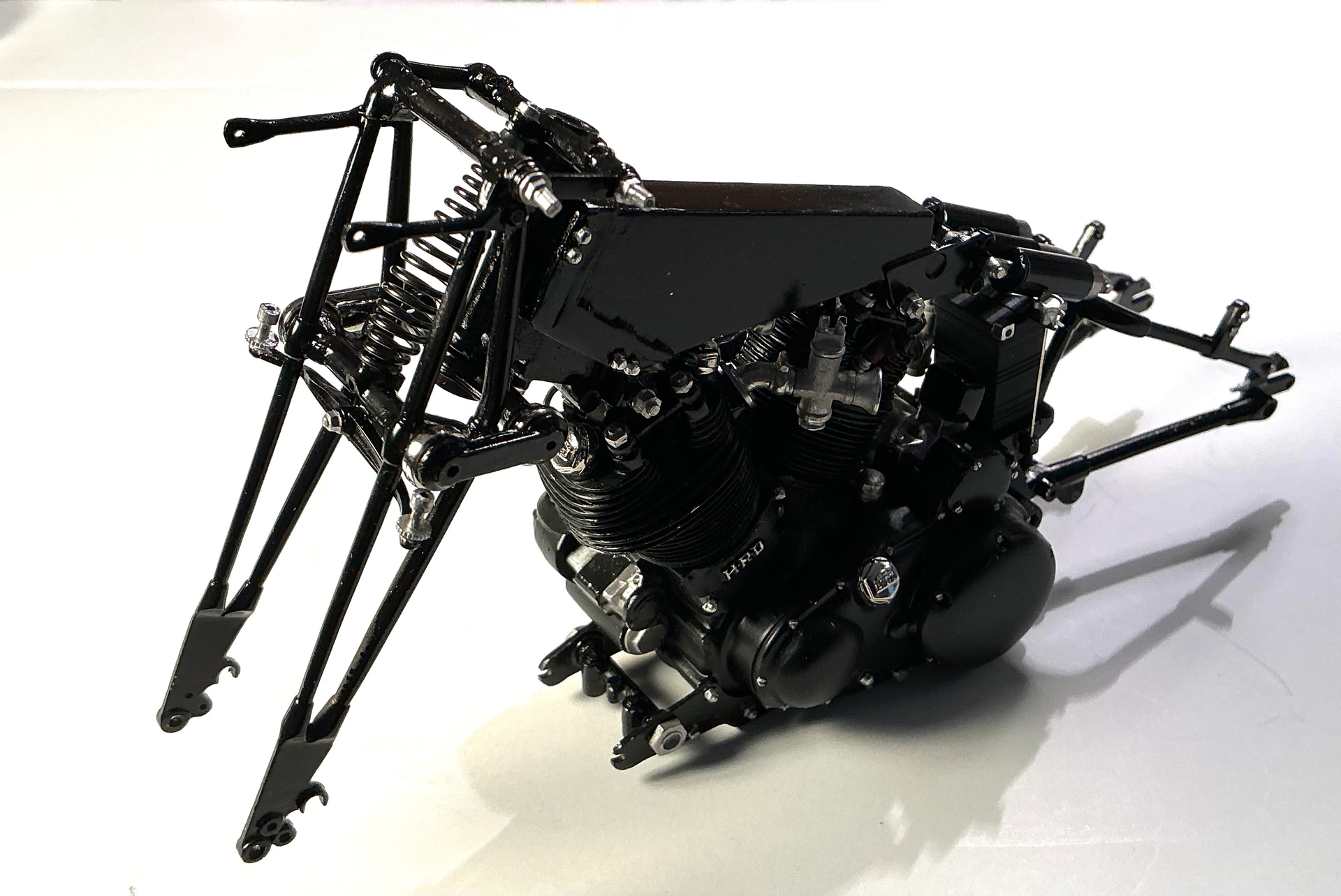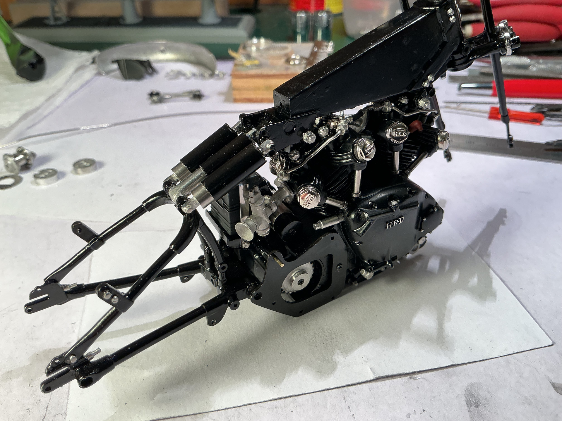 It looks really good. So you decided to go with the Black Shadow finish I see. One small point, that silver piece projecting from the rear of the timing case is in the wrong place. It looks as though it represents the valve lifter cable abutment. This goes further down and behind the timing chest, the ribs on the “B” chest are actually oilways with blanking plugs. It goes into the crankcases just below the rear inlet push rod tube and slightly further in than the gasket face for the timing cover. If you look at my photos, you can just about see a portion of it, behind the oil feed and rocker feed pipes, just in front of the generator. On the originals it is usually a source of oil leaks!