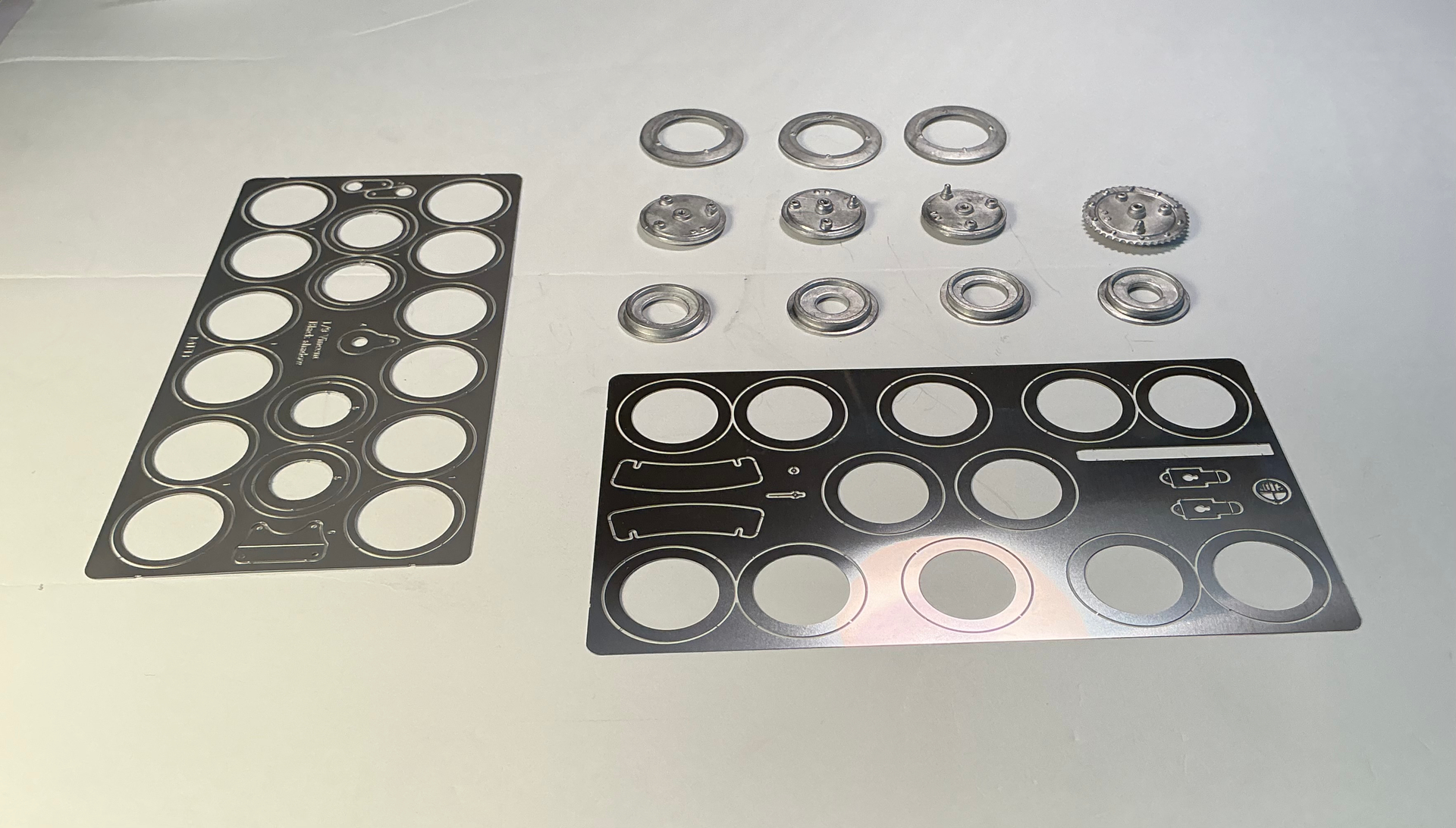 Brake drums built up of white metal backing plates and photo etch fins .