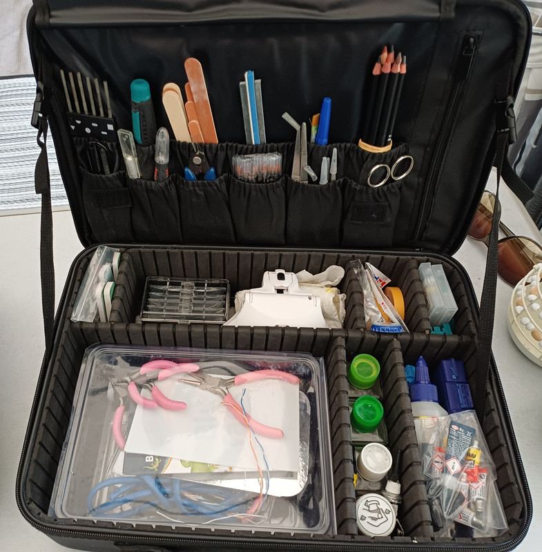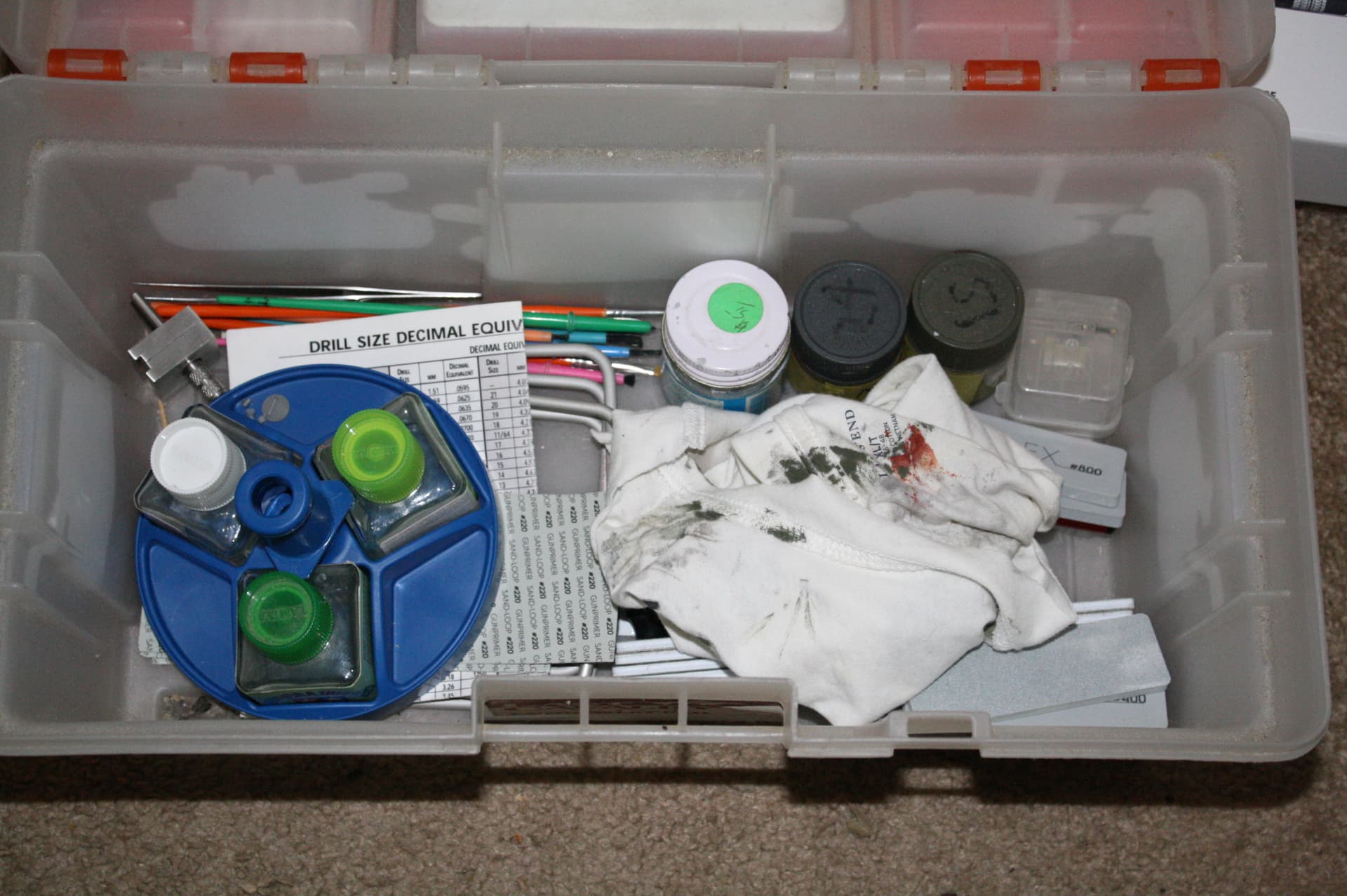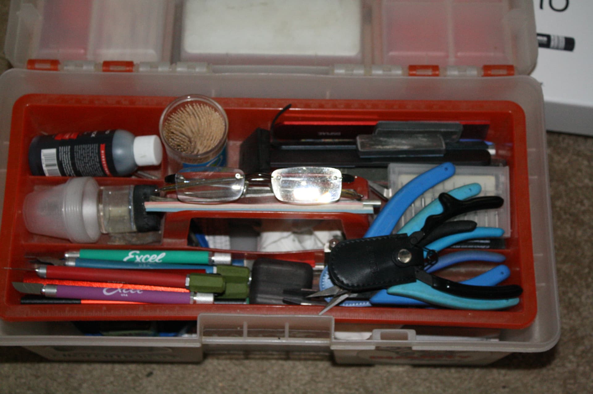 I have a small medical box that I use to carry my tools from the hobby room to living room or hobby shop. I have glue, blade, a few micro saw, nippers, generic micro drill bits, a few different types of scrapers, some different sanding sponges.