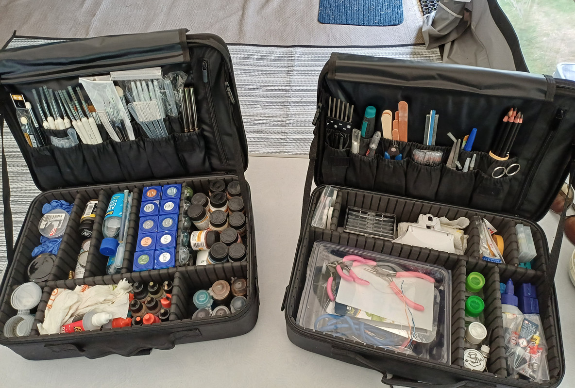 my travel kit is much like Tank’s. I have not tried to take on a plane, but just essential tools for building a kit and leaving paints at home. I also don’t try to take on a plane, but by car to a second home, I have a plastic lid locking box of 16x14x6 inches that holds the kit box, tools, a cutting pad, glues, and it’s small enough to travel easily. I can take paints, but then I have solvents, and brushes and ? shakers and it’s just too much, but I can build a lot and several subassemblies and then paint when I get home.