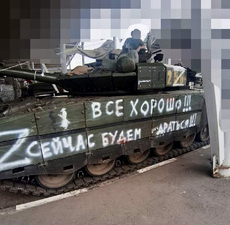 Soldiers from the Surgut OMON in the NVO z with a T-62 behind them.