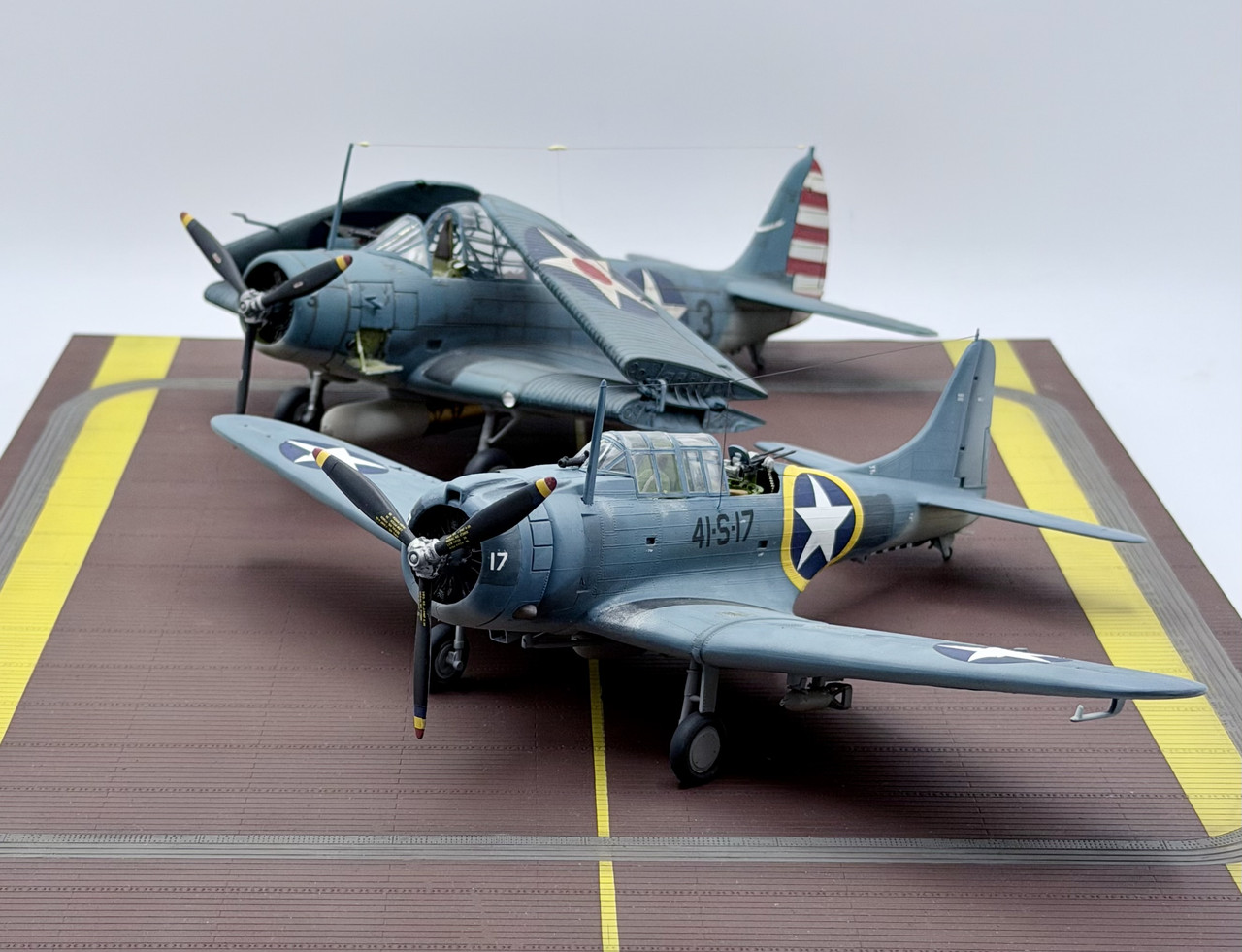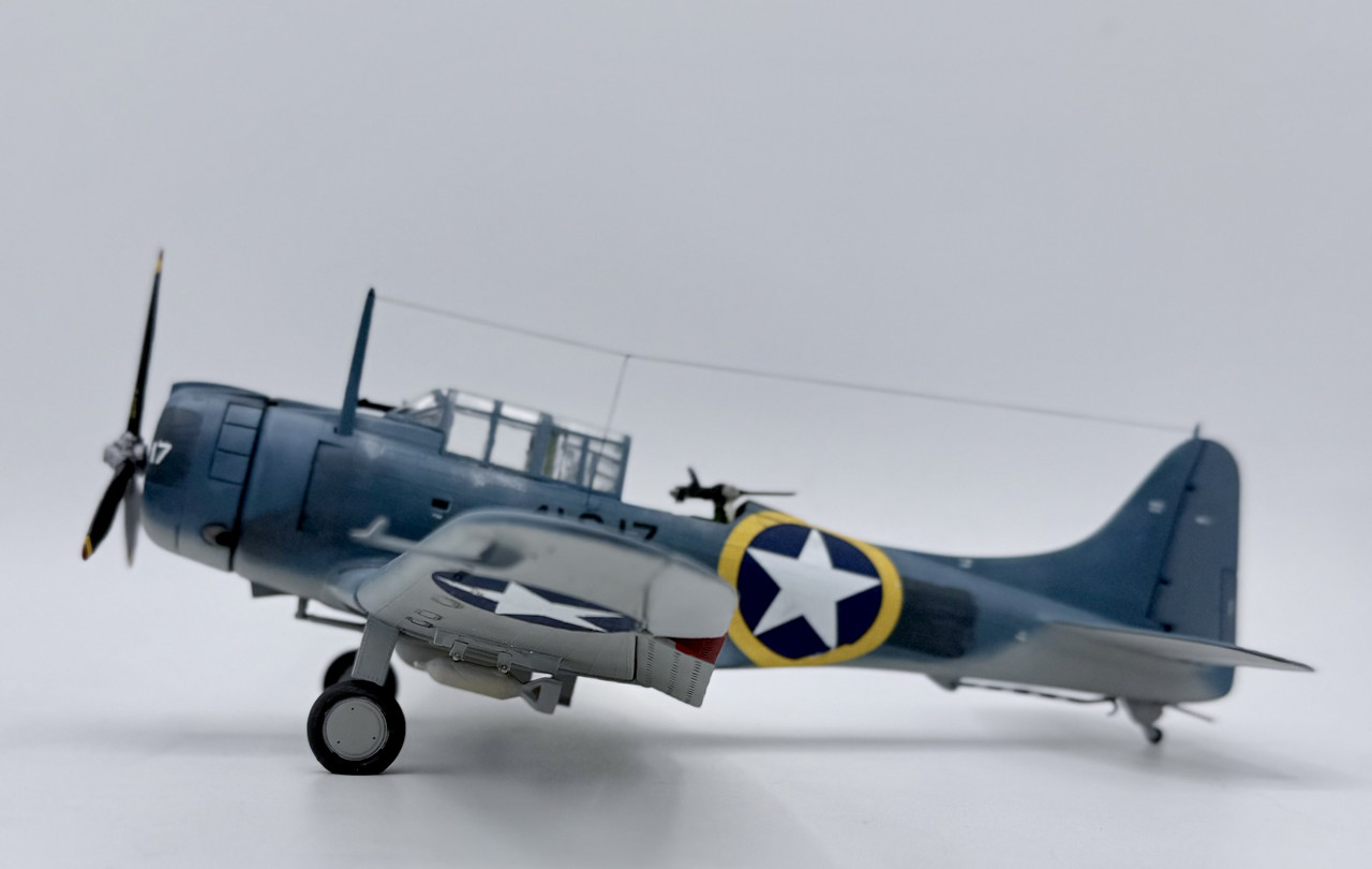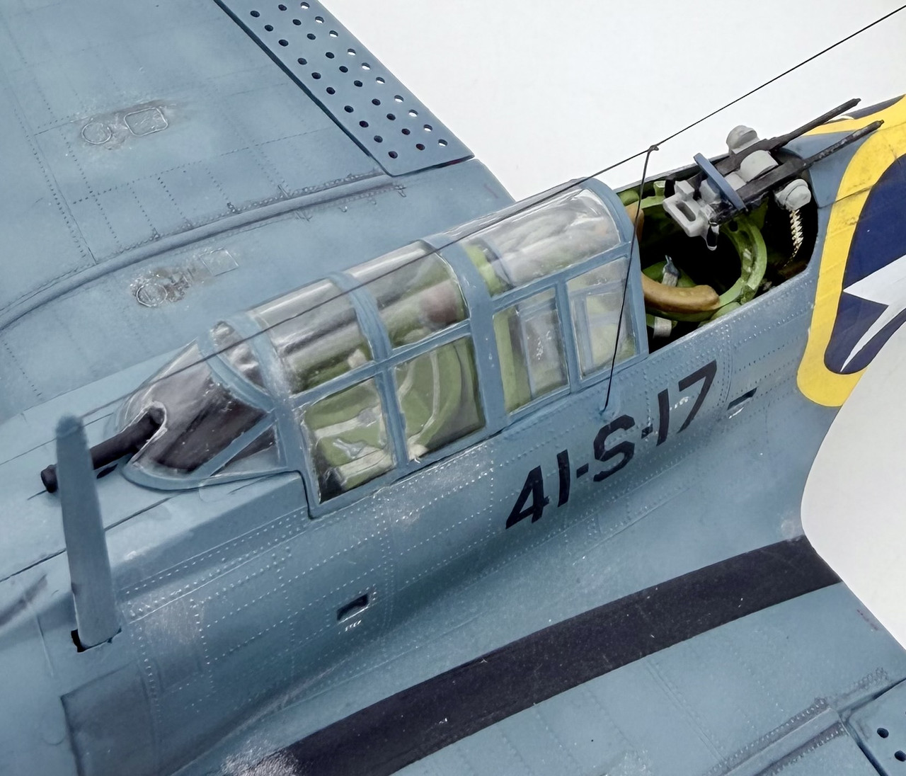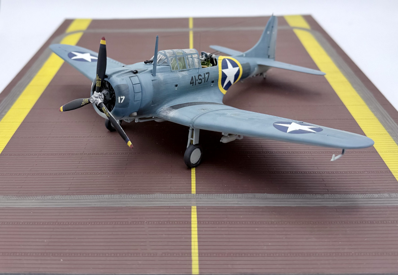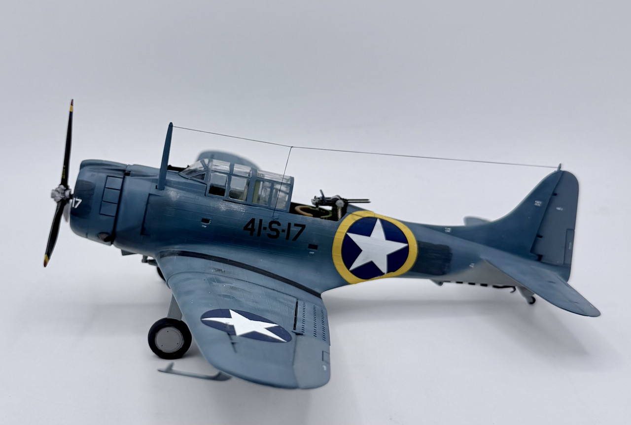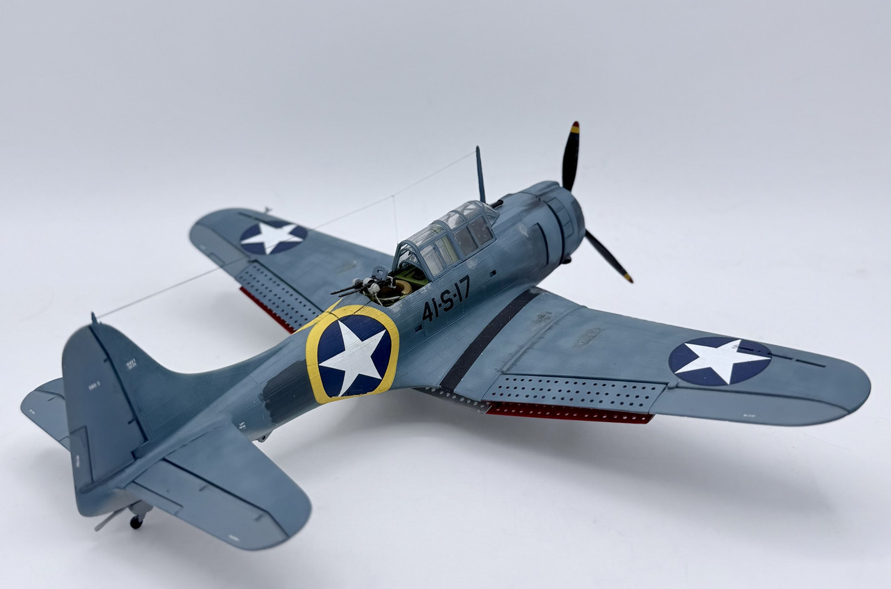 This was a project that I started back in the mid 90’s when my skills were not quite up to my ambition. I started it before the Hasegawa and Accurate Miniatures SBD kits were first issued, but I wanted to improve and accurize the old Monogram kit, which is essentially a SBD-4. I took many components for the cockpit from a trashed Monogram TBD kit, such as the pilots and gunners seats, the propeller, and the pilots bomb telescopic bomb sight. I modified other kit parts, and scratch built other details, as well as adding some salvaged .50 cal.s for the cowl guns and a few items from a Hasegawa A-24 kit. This project went in fits and starts off and on over the years, but I decided to knuckle down and finish it up after this New Years. My markings intent varied over that time as well, until a few weeks ago when I decided to go with the markings for Scouting 41 (VS-41) during Operation Torch in November of 1942. VS-41 flew a mix of SBD-3s and SBD-4s during Torch, but I was able to locate a photo confirming that 41-S-17 was a SBD-3 at that time.