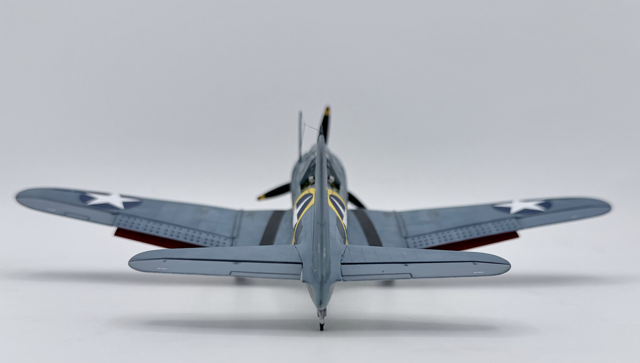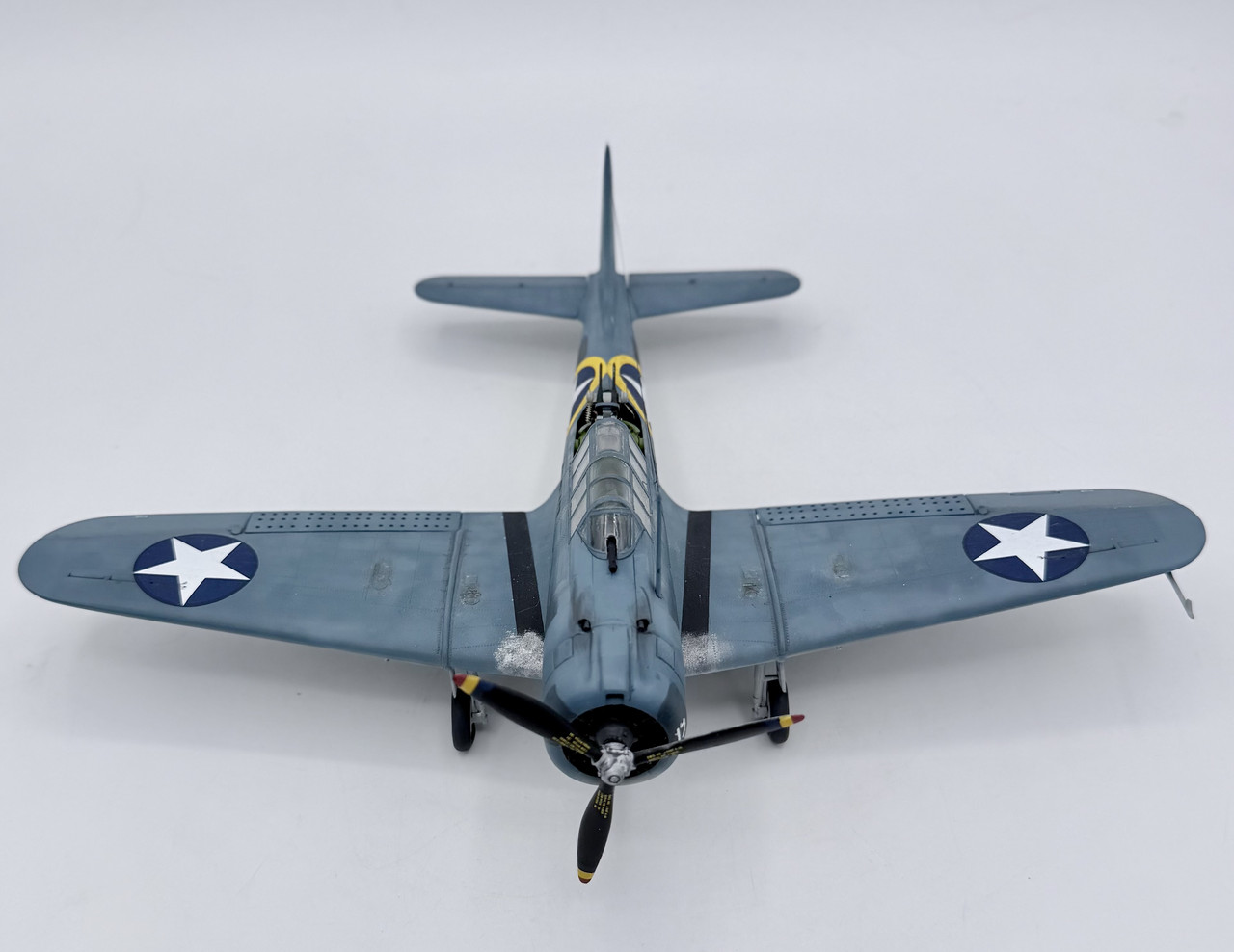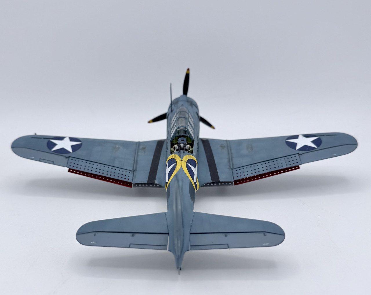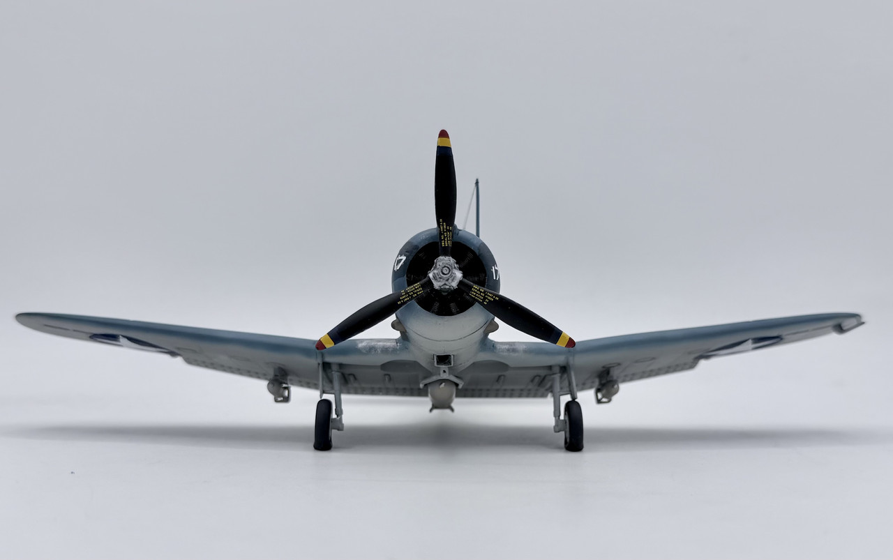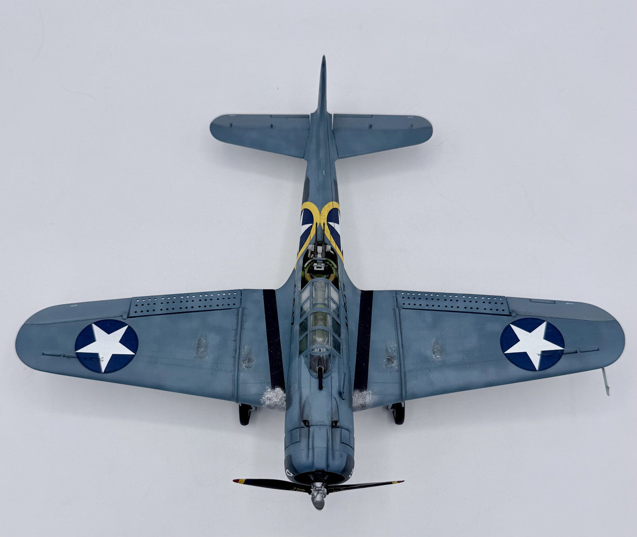 This was a project that I started back in the mid 90’s when my skills were not quite up to my ambition. I started it before the Hasegawa and Accurate Miniatures SBD kits were first issued, but I wanted to improve and accurize the old Monogram kit, which is essentially a SBD-4. I took many components for the cockpit from a trashed Monogram TBD kit, such as the pilots and gunners seats, the propeller, and the pilots bomb telescopic bomb sight. I modified other kit parts, and scratch built other details, as well as adding some salvaged .50 cal.s for the cowl guns and a few items from a Hasegawa A-24 kit. This project went in fits and starts off and on over the years, but I decided to knuckle down and finish it up after this New Years. My markings intent varied over that time as well, until a few weeks ago when I decided to go with the markings for Scouting 41 (VS-41) during Operation Torch in November of 1942. VS-41 flew a mix of SBD-3s and SBD-4s during Torch, but I was able to locate a photo confirming that 41-S-17 was a SBD-3 at that time.