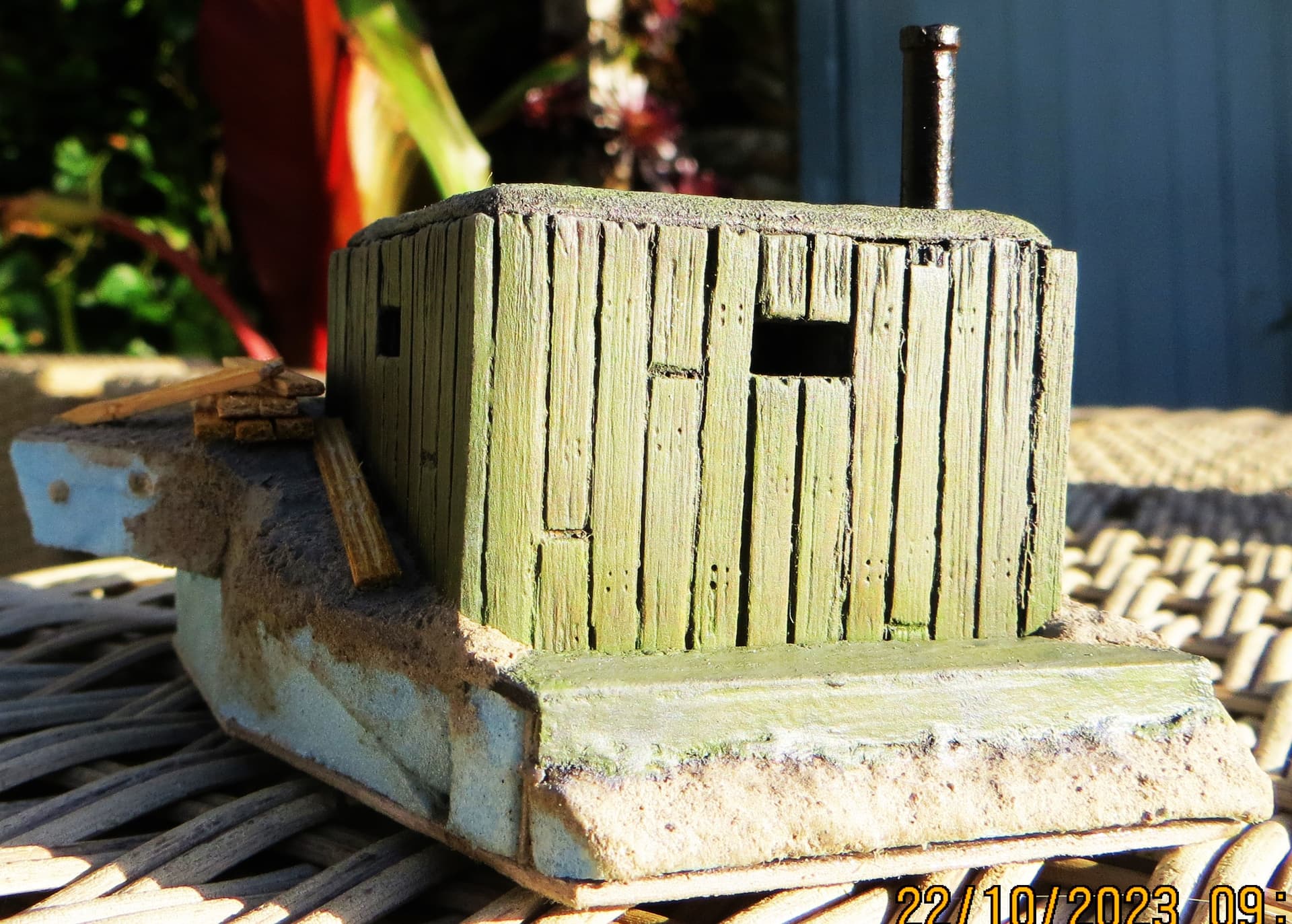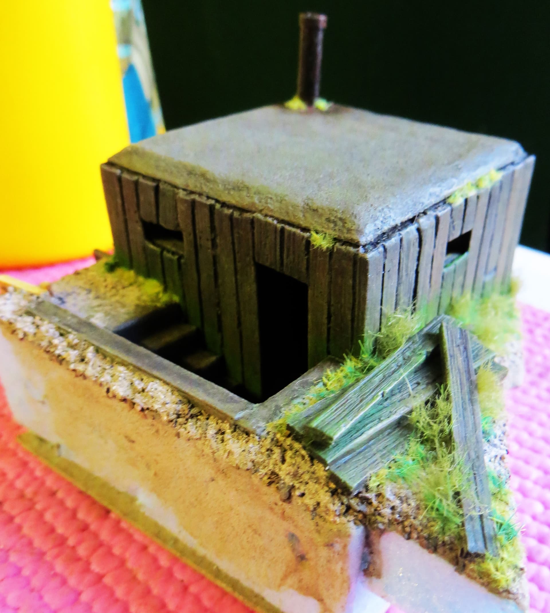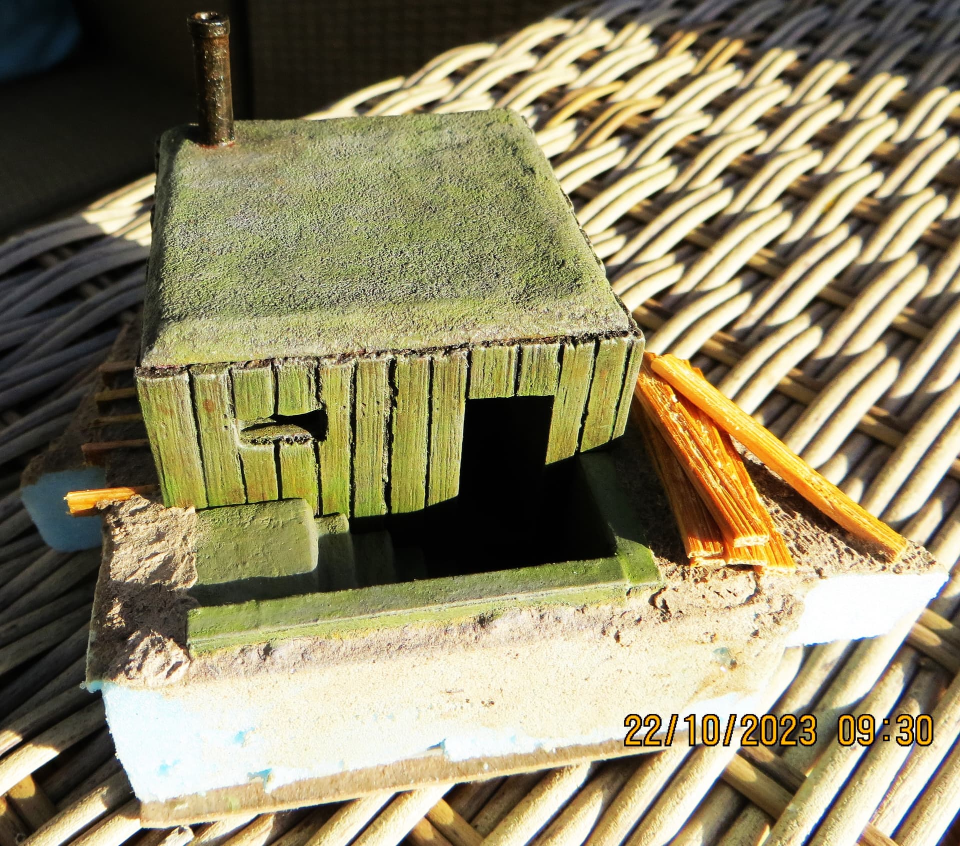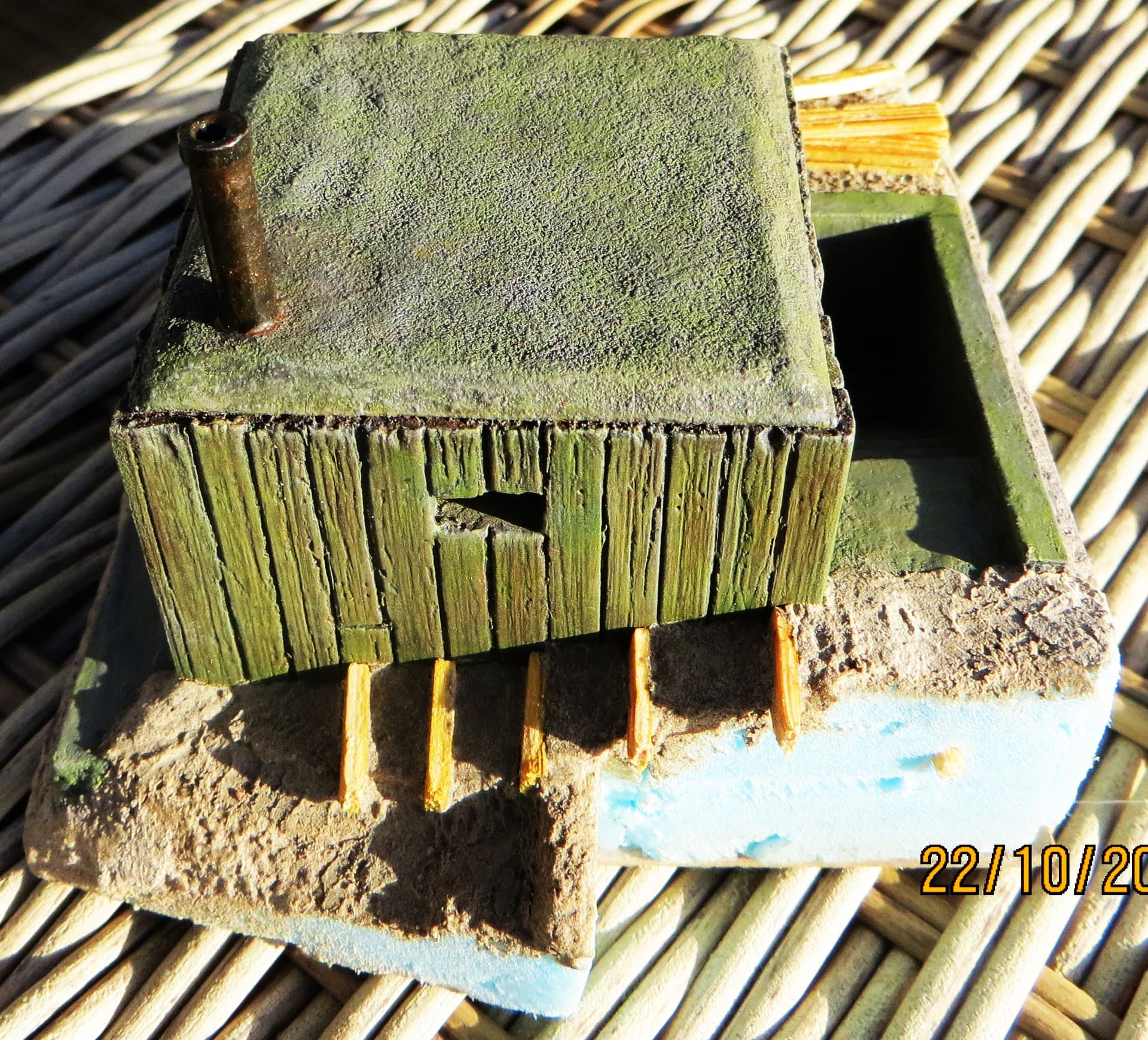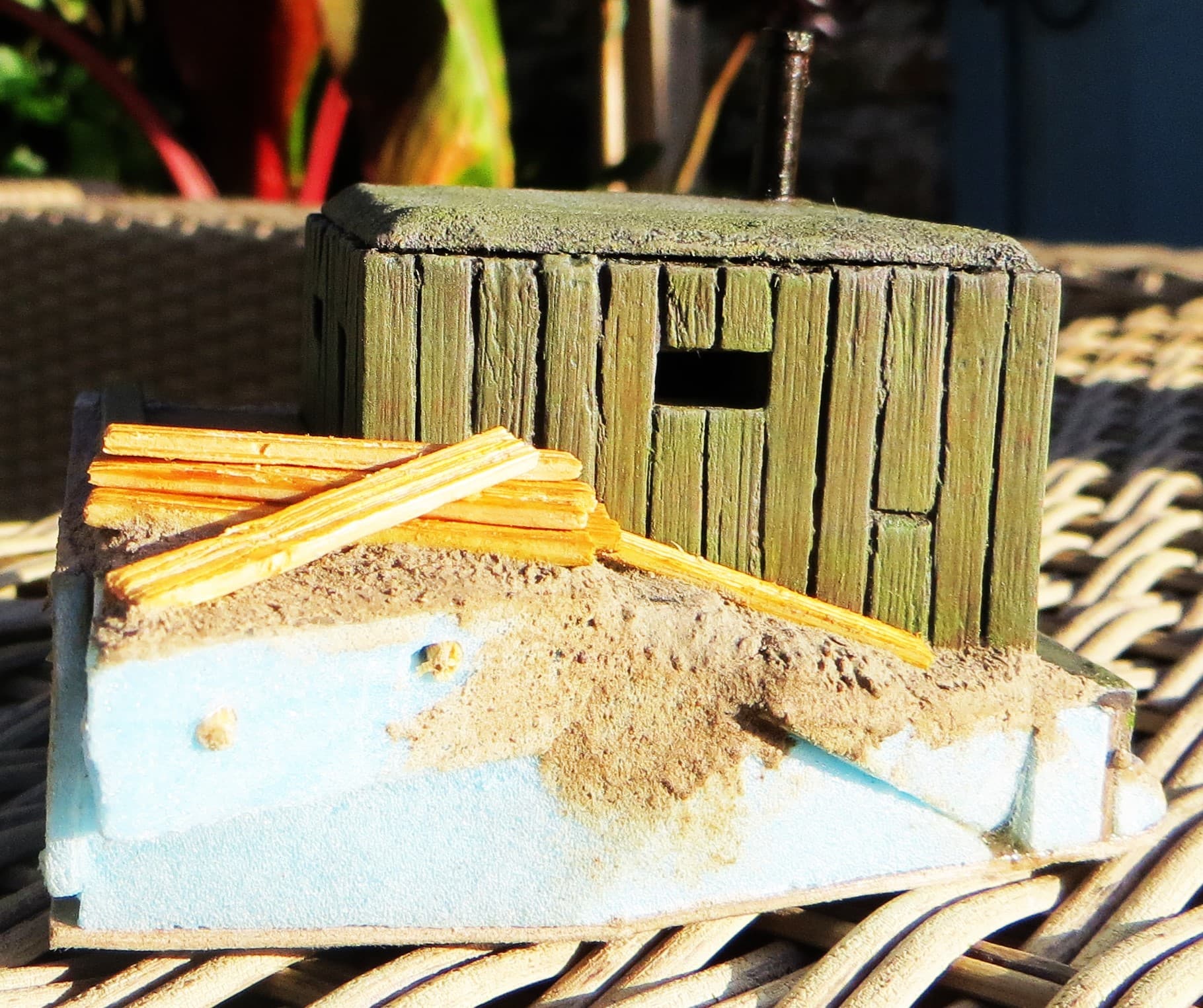 The camouflaged Type 26 pillbox construction almost finished. The image I found has the pillbox camouflaged as a lineside Platelayers Hut, with the verticals clad in what looked like old railway sleepers, and with a dummy chimney stuck on top.