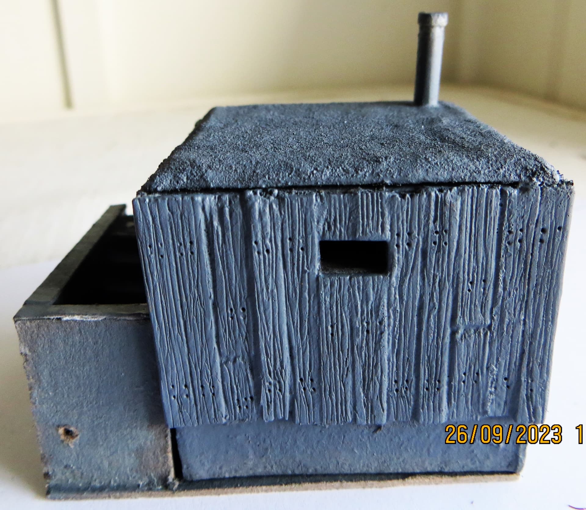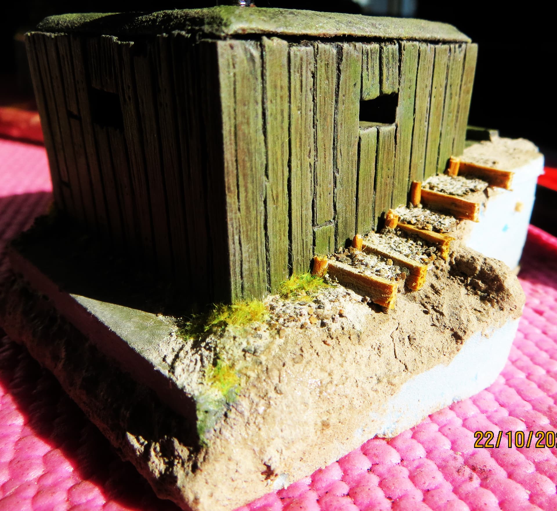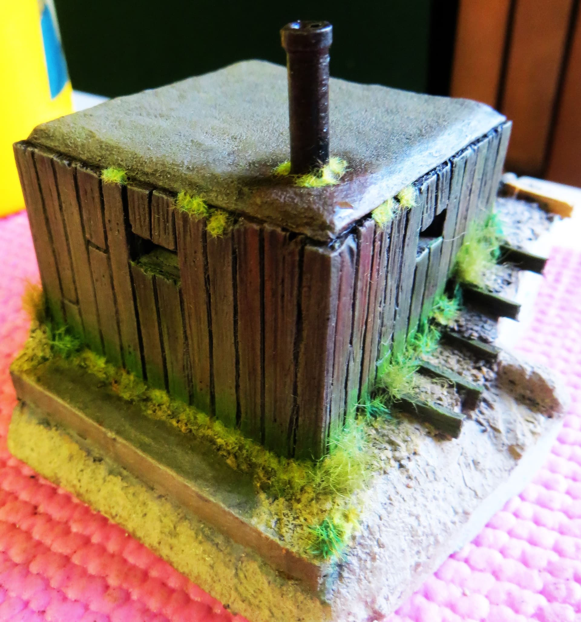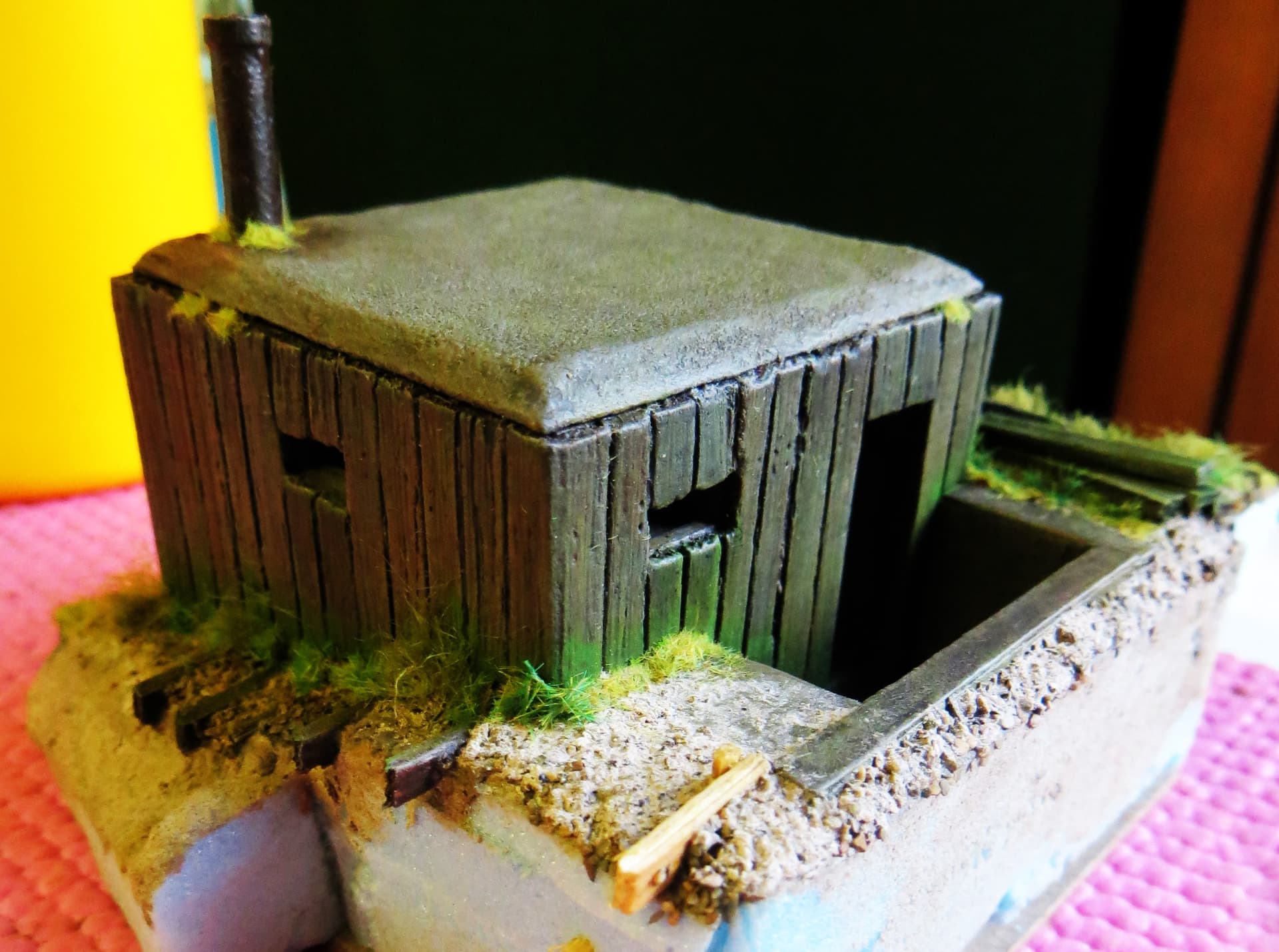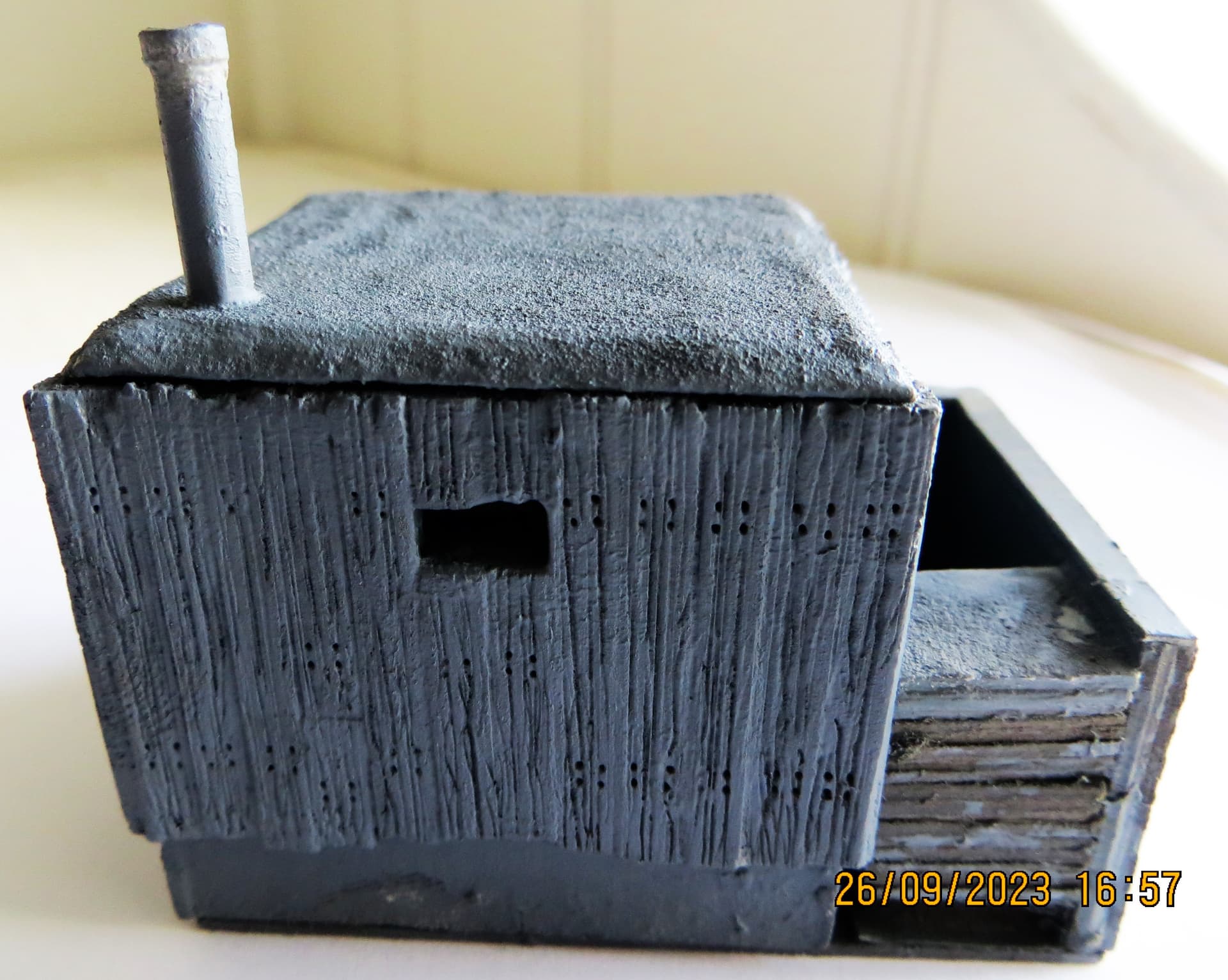 The camouflaged Type 26 pillbox construction almost finished. The image I found has the pillbox camouflaged as a lineside Platelayers Hut, with the verticals clad in what looked like old railway sleepers, and with a dummy chimney stuck on top.