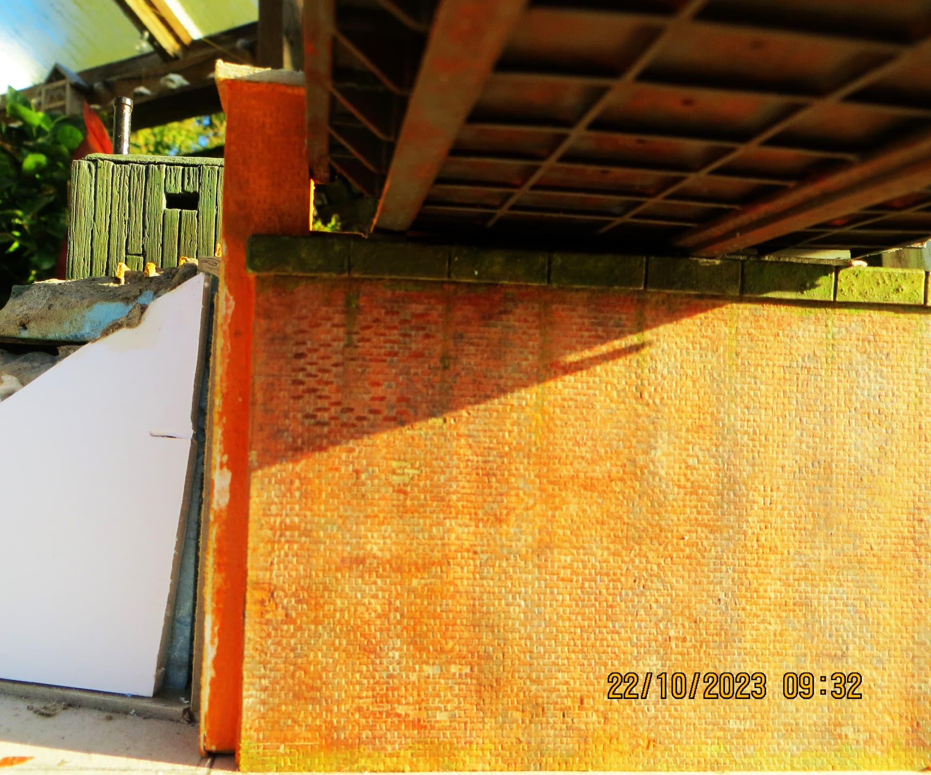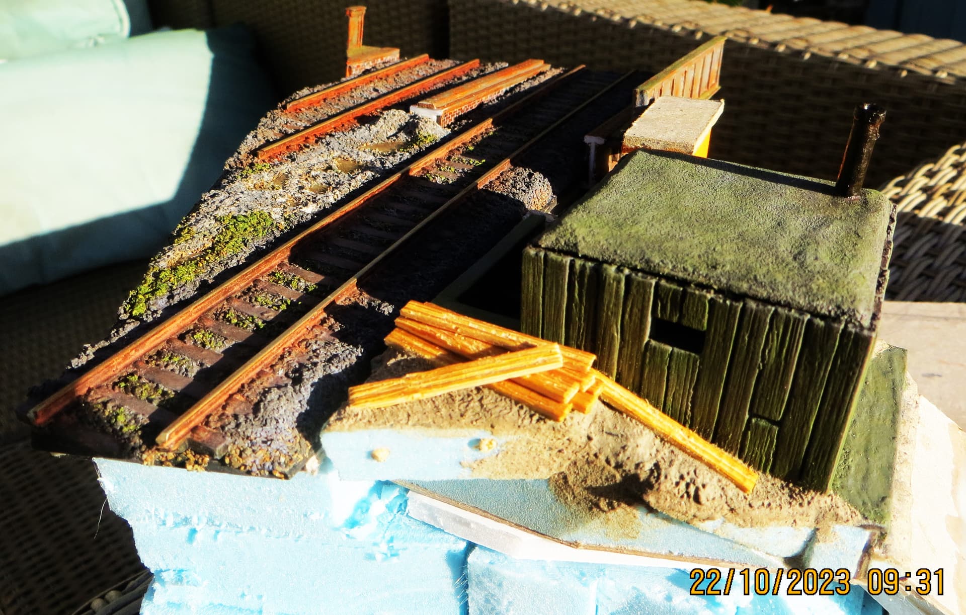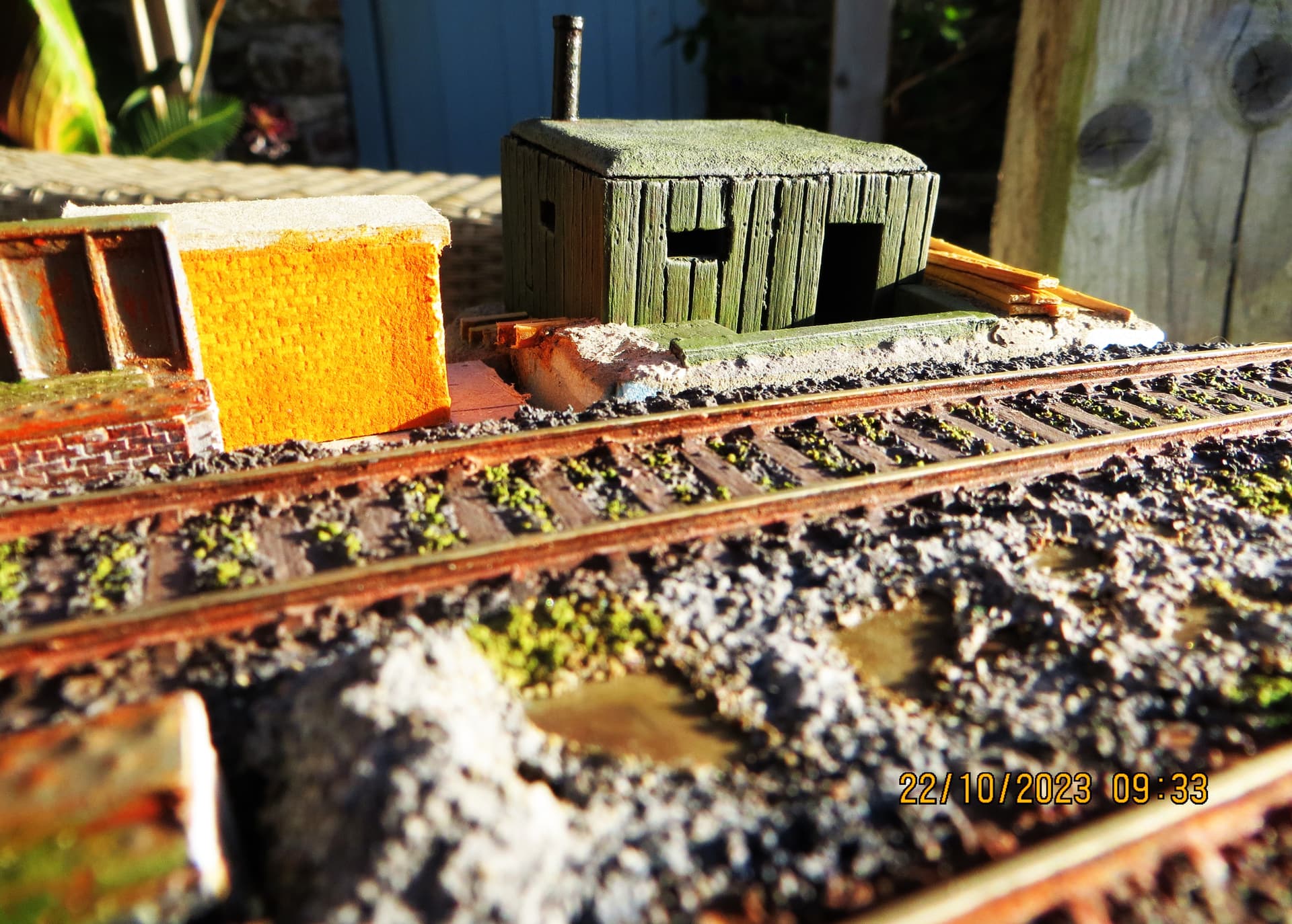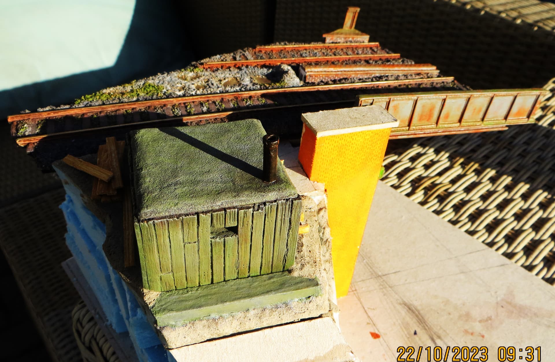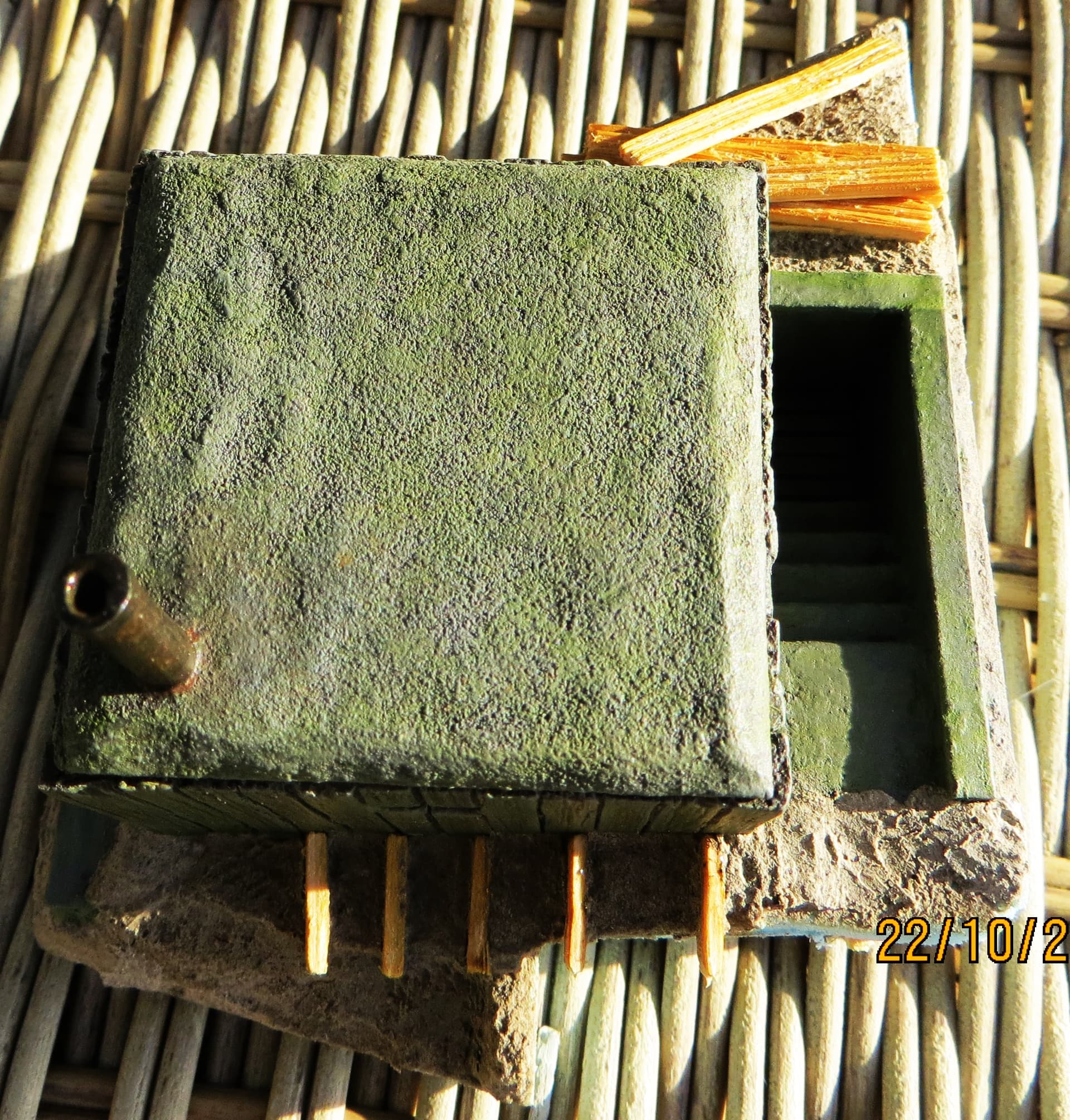 The camouflaged Type 26 pillbox construction almost finished. The image I found has the pillbox camouflaged as a lineside Platelayers Hut, with the verticals clad in what looked like old railway sleepers, and with a dummy chimney stuck on top.