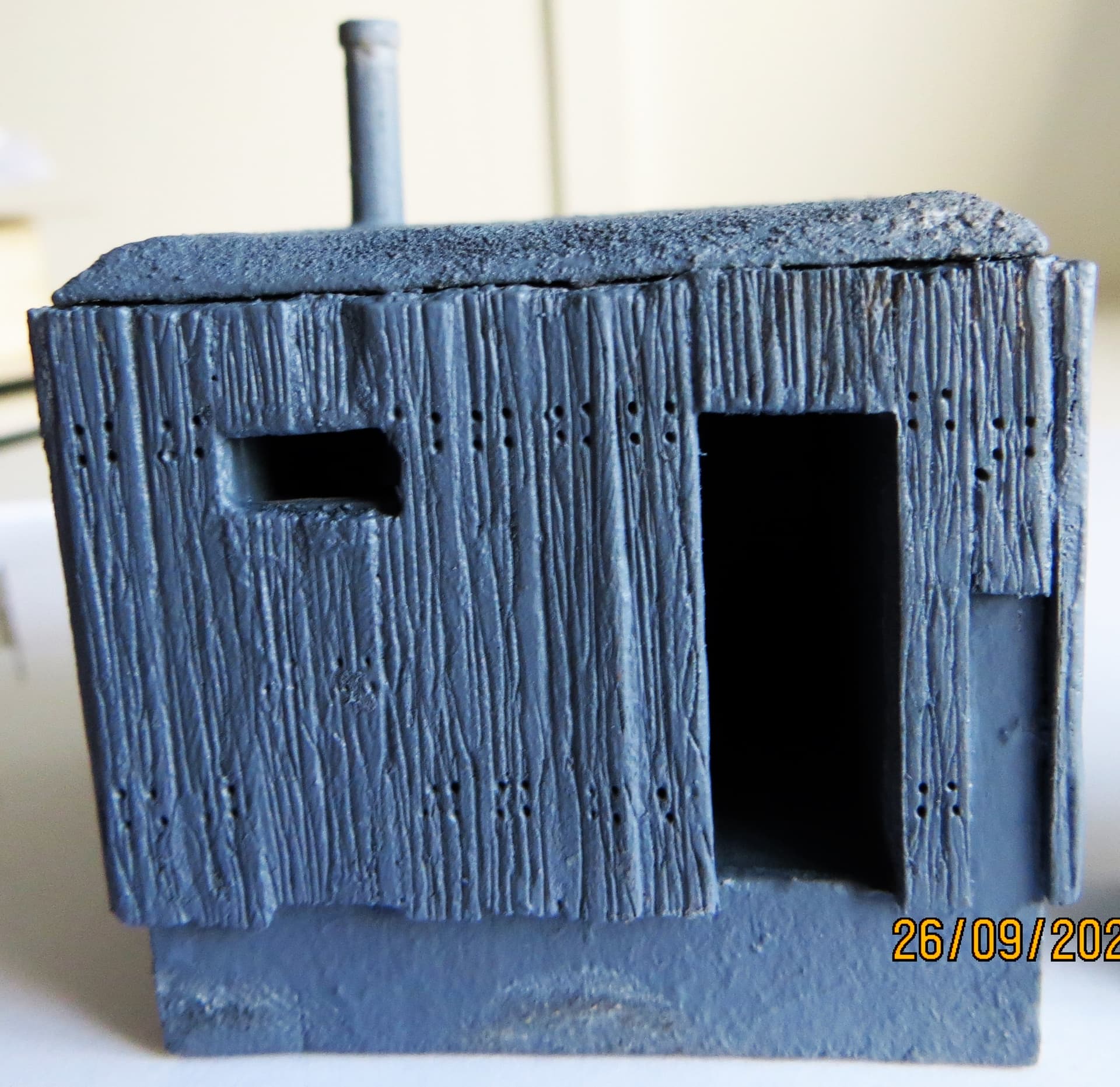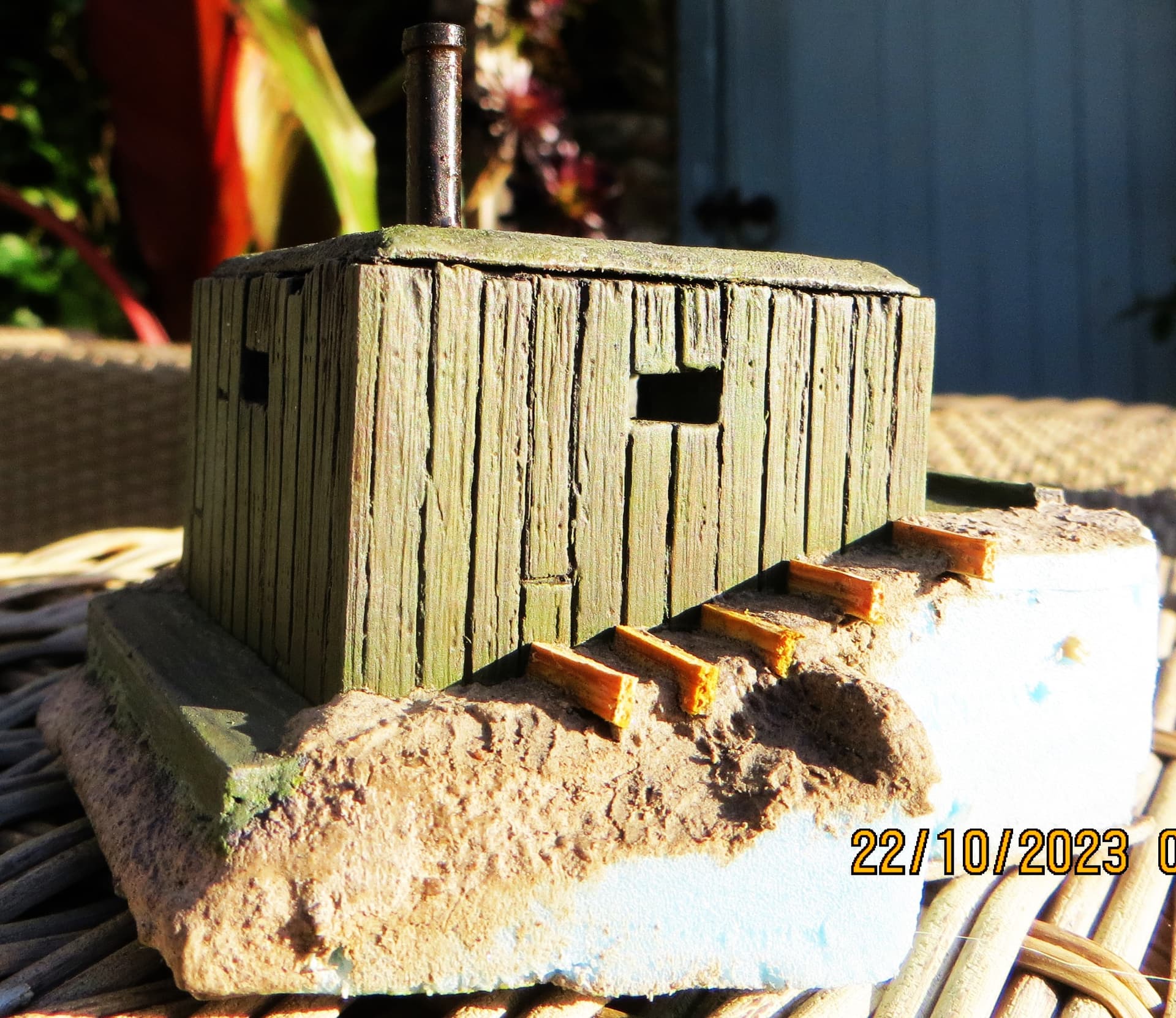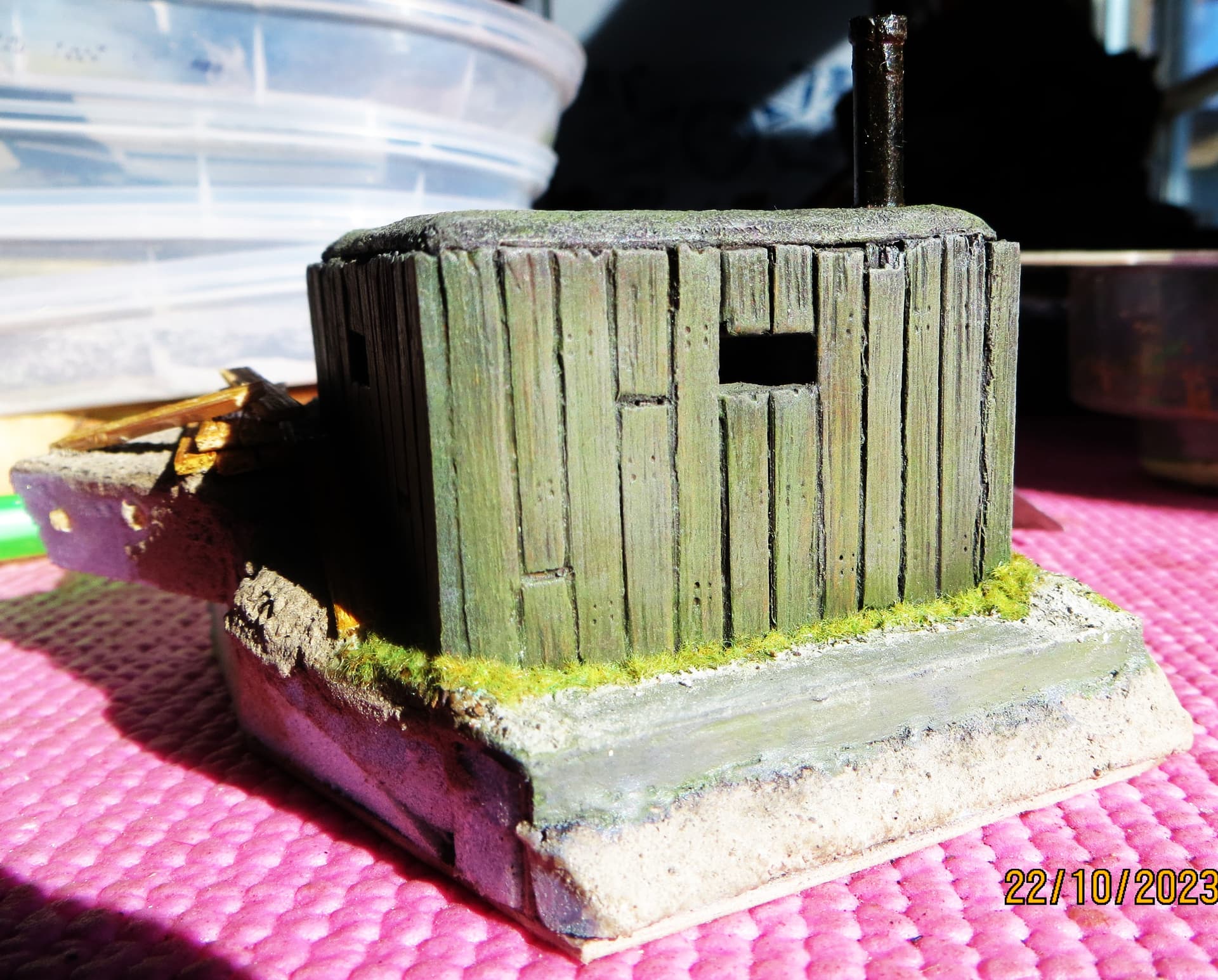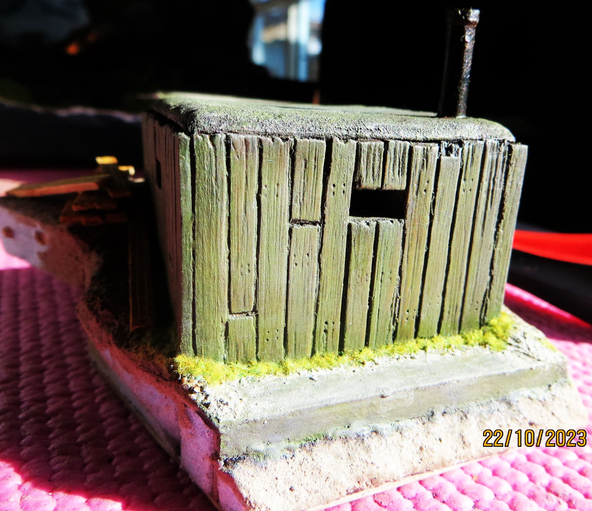 So cobbled together a smaller Type 26 pillbox. Found an image of one alongside a railway line camouflaged as a Platelayer’s Hut, so decided to have a go at that.