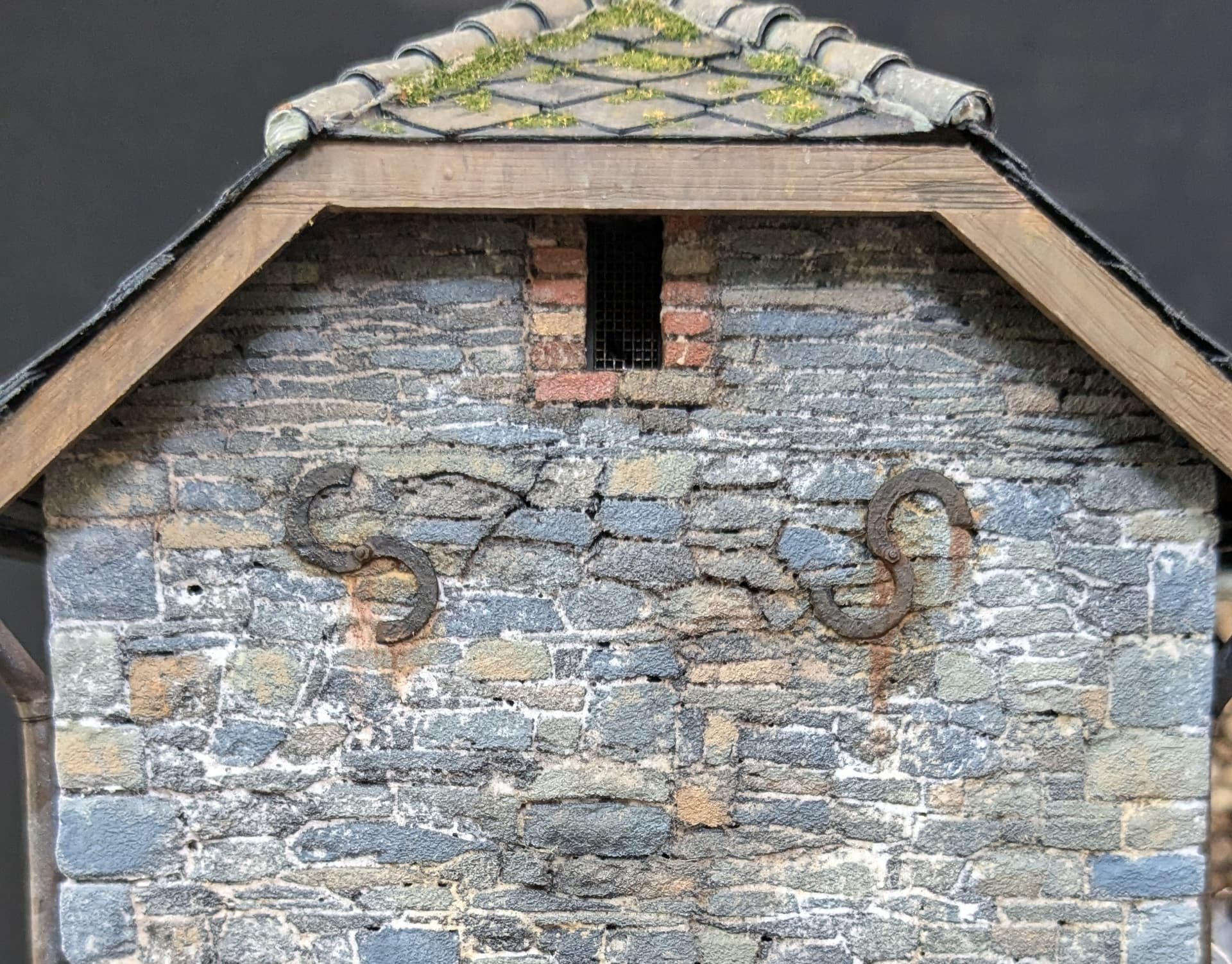 A common sight on old buildings, these come in all shapes and sizes. Although the most common is probably an ‘X’ shape, to be a little different I went for an ‘S’. To make each one I used an ordinary paper hole punch (and a bit of trial and error) to make two adjacent holes in some plastic sheet. I then drew a figure of 8 before cutting out the shape of a large ‘S’ around them. After a textured coating from stippled Mr Surfacer 500, a bolt from the spares box and another sponged paint job, they were simply attached with trusty UHU.
