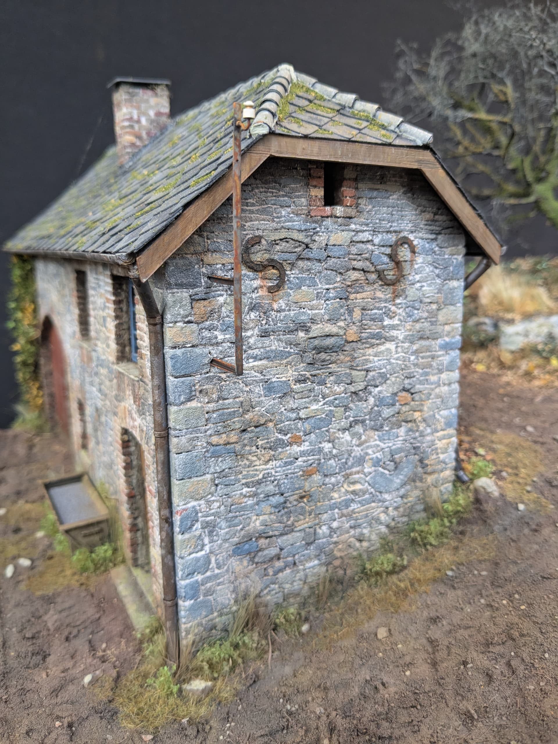I didn’t take any ‘in action’ shots here, but the process is pretty simple. The gutters were made from ‘U’ shaped plastic card with capped ends and braces from plastic strip. The drainpipes are a bit more complicated, but made using hollow plastic rod. Once I had the basic section lengths worked out they were then attached to each other using pliable wire inserted into each end so that they could be bent into their final shape. The joints were then hidden with strips of masking tape. I think these were airbrushed with a black primer coat before I used the sponge method to colour them with various greys and rust tones.